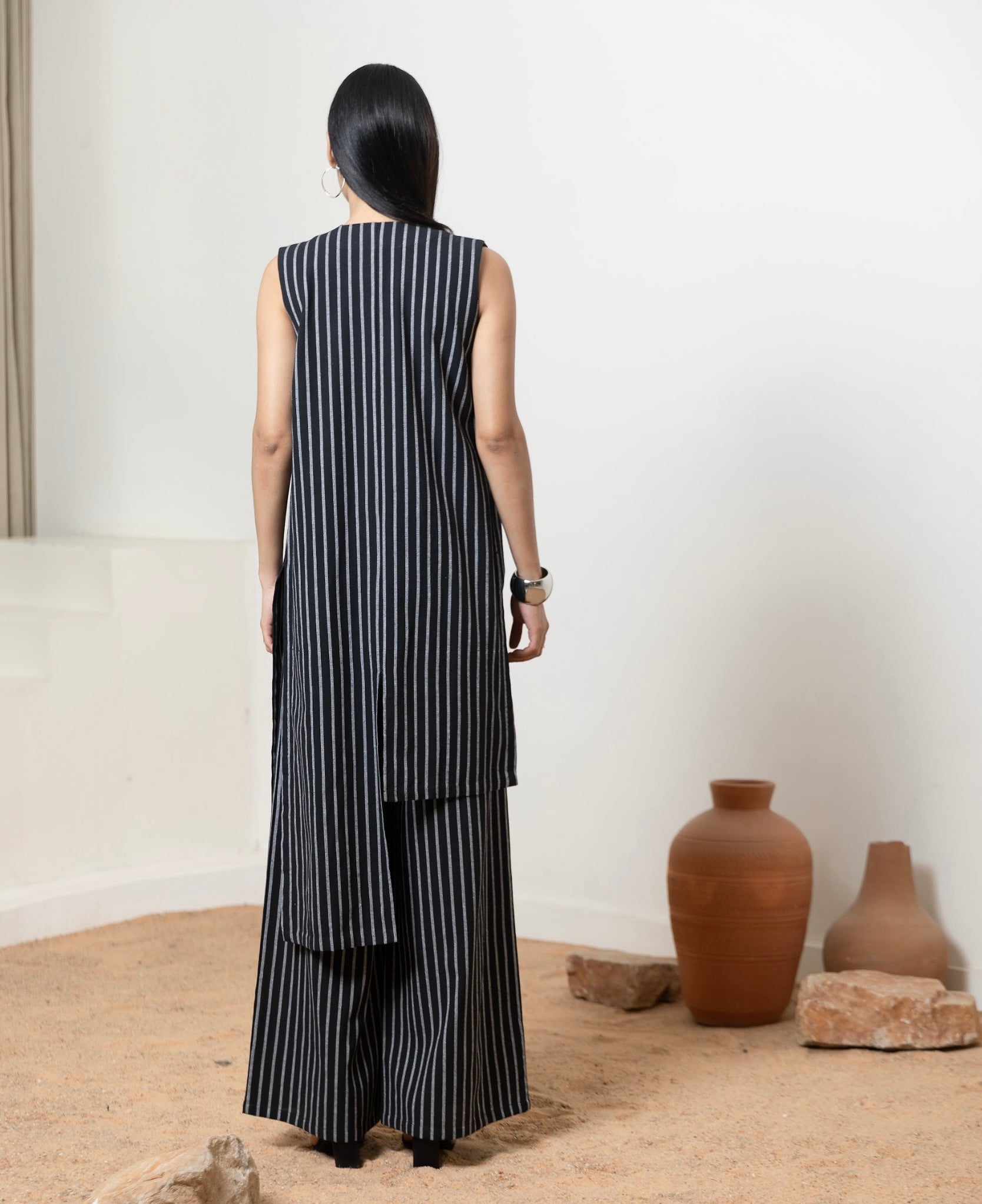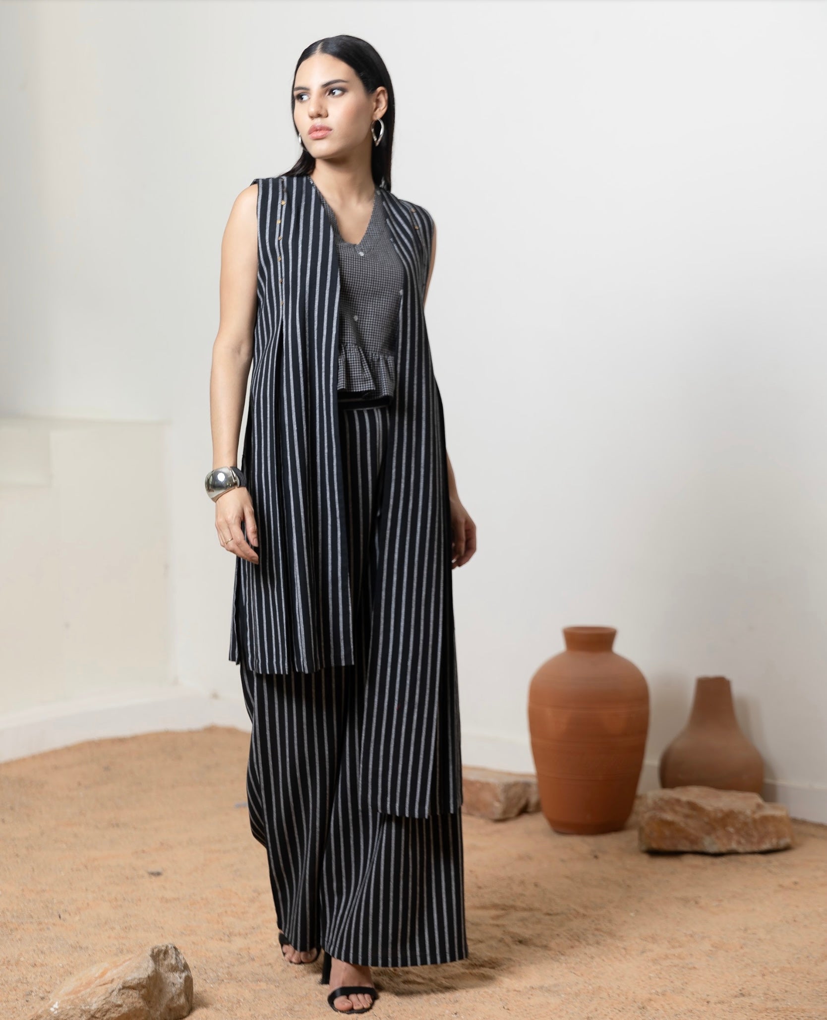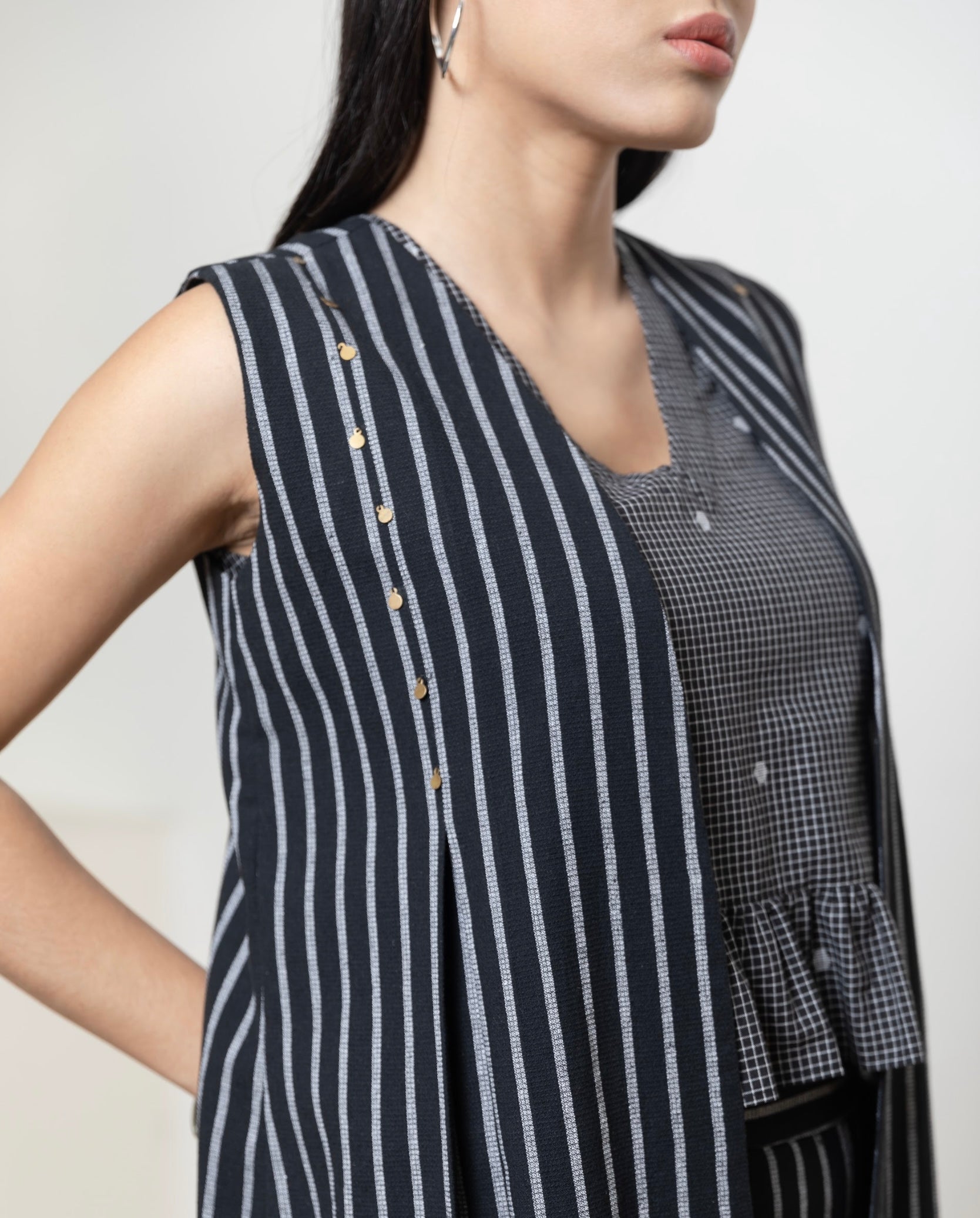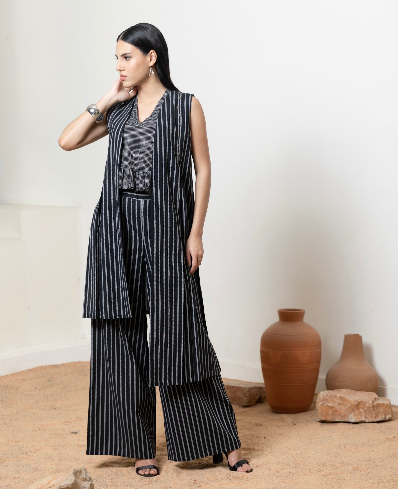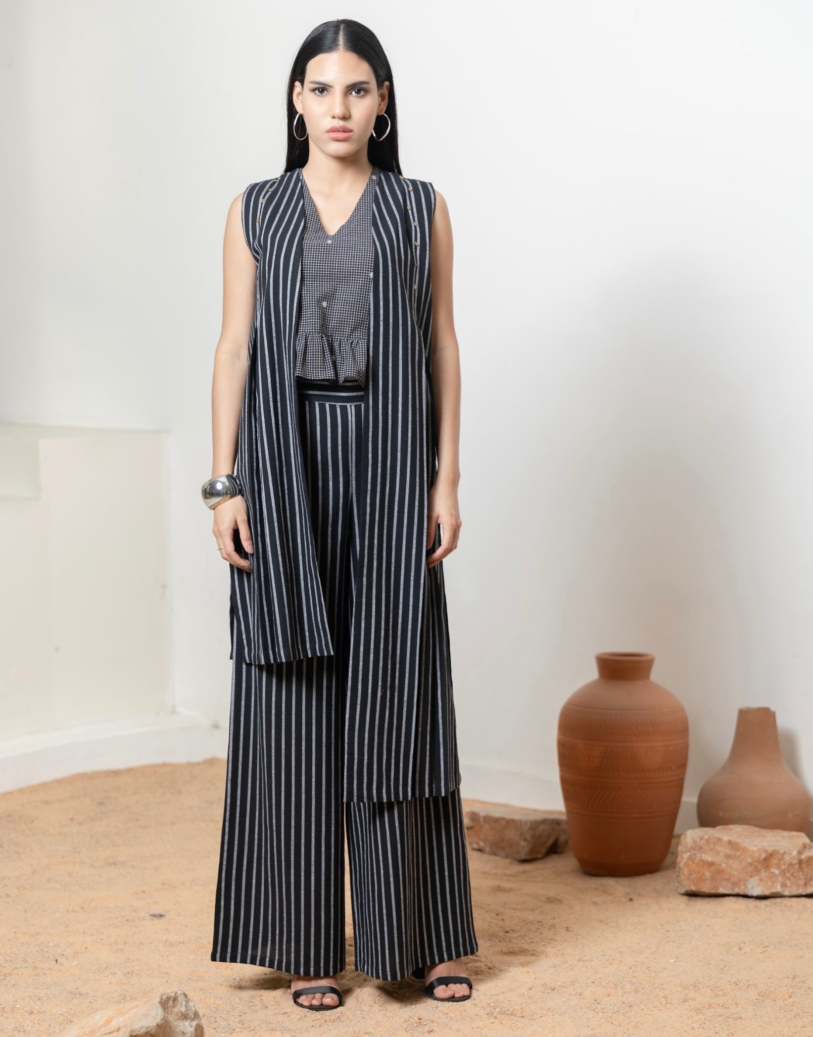 Long jacket with assymetric hem. Interesting bead detailing can be seen, made in comfortable stripped cotton fabric. Comes with V neckline ruffled top and slightly flared pants (with back elastic).