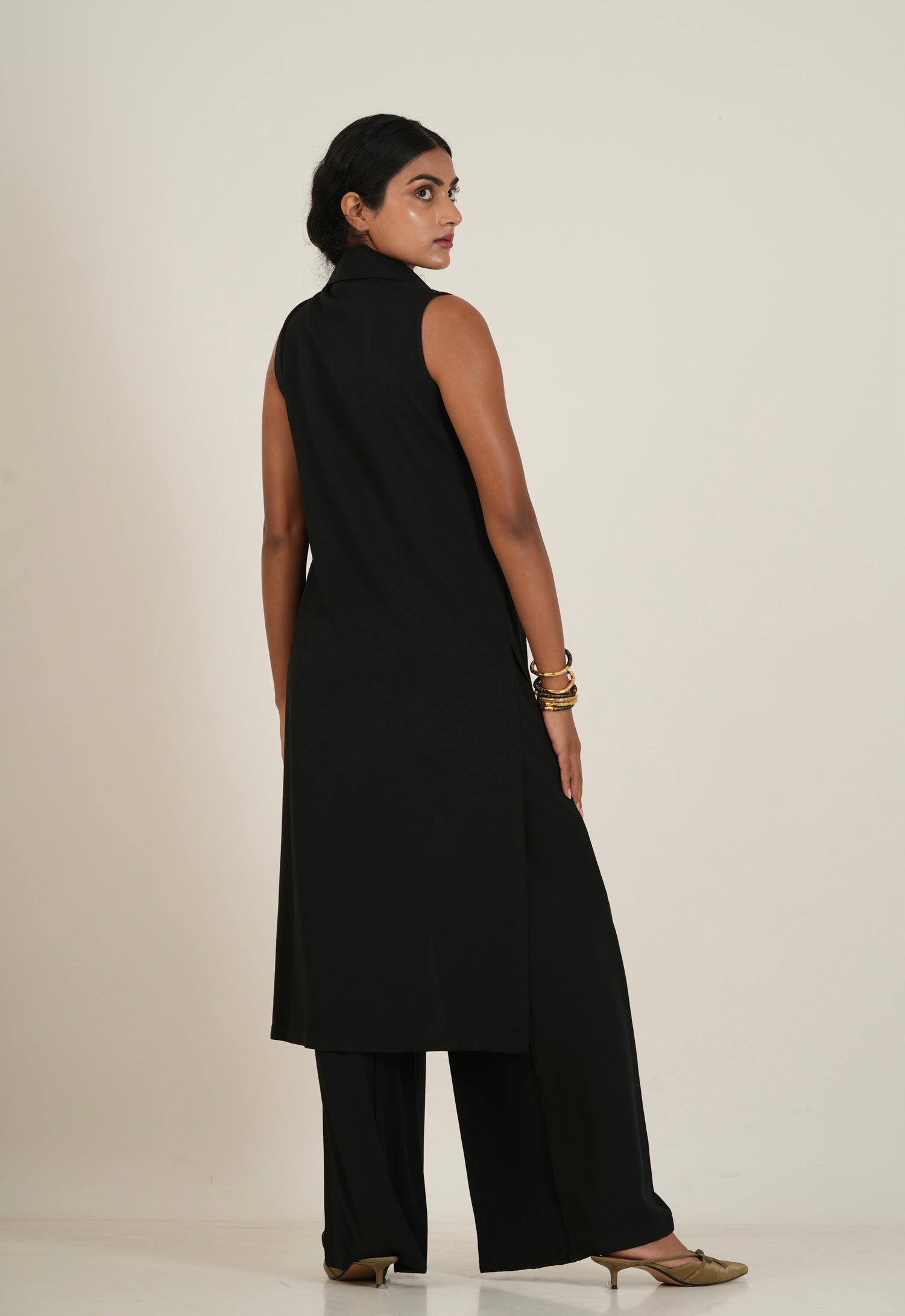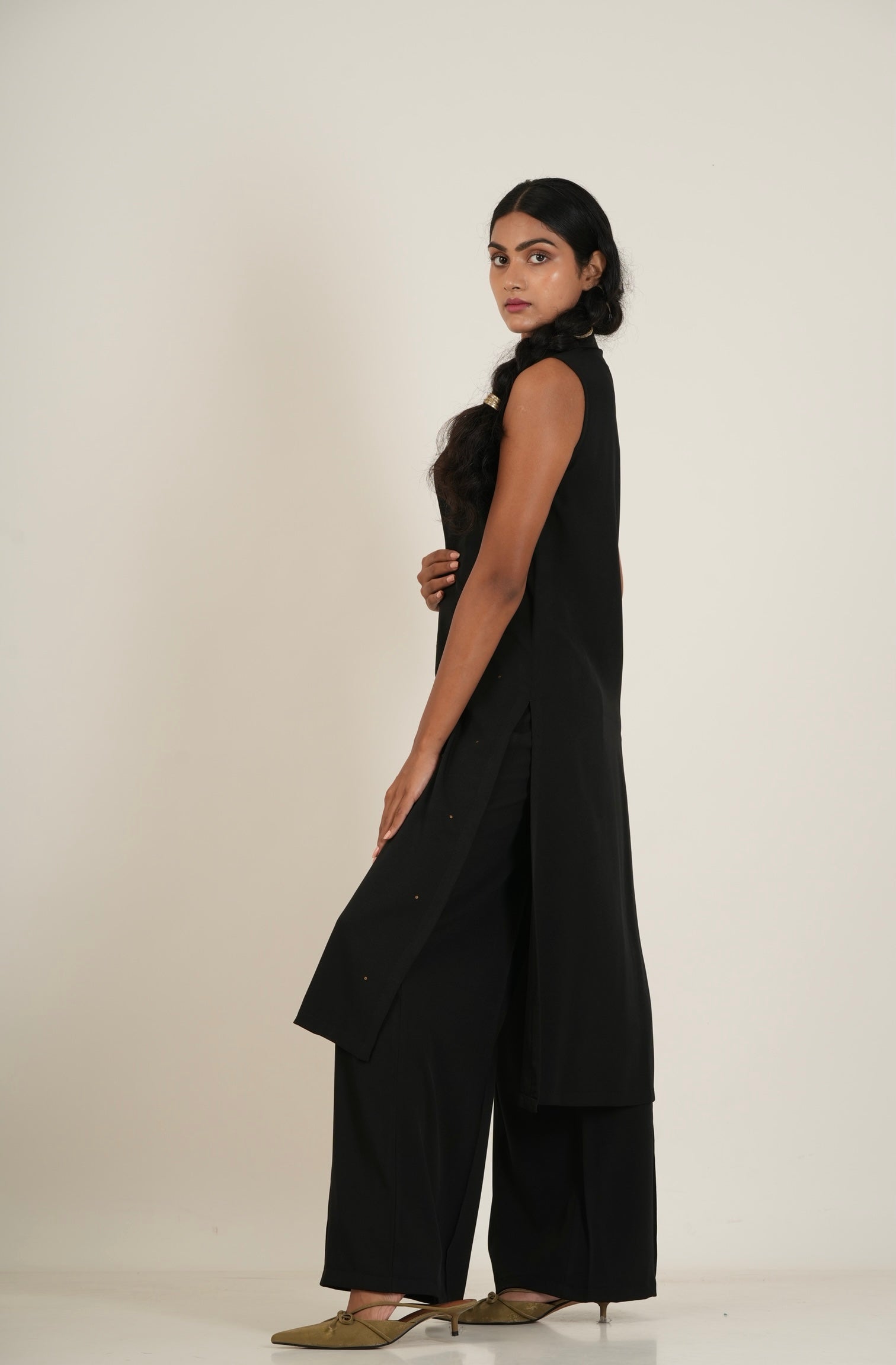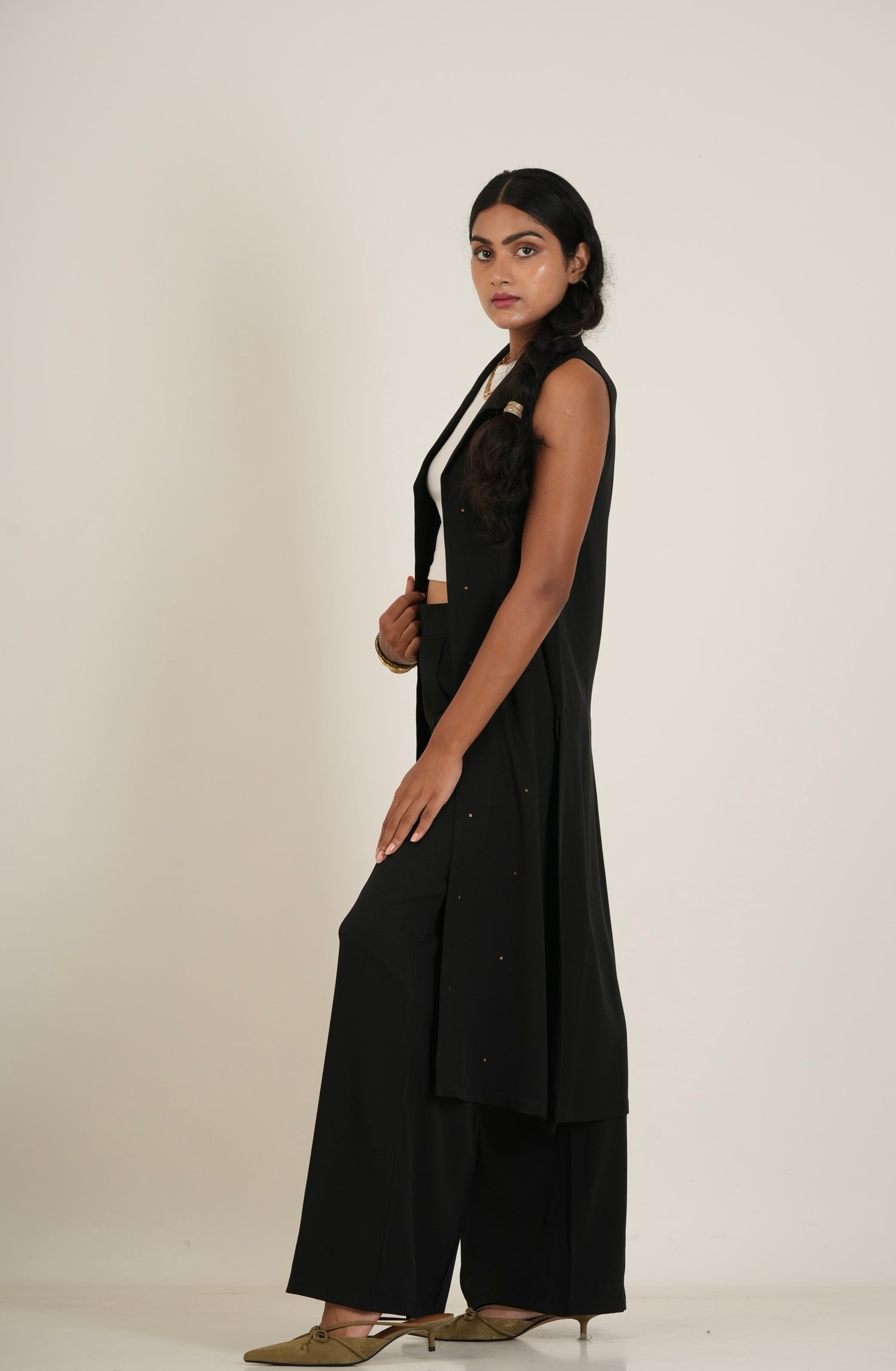 Long collar jacket with side slits, pintucks pants and sequins detailing. Comfortable and easy to carry, can be teamed up with plain inner. Made in Moss crepe fabric.