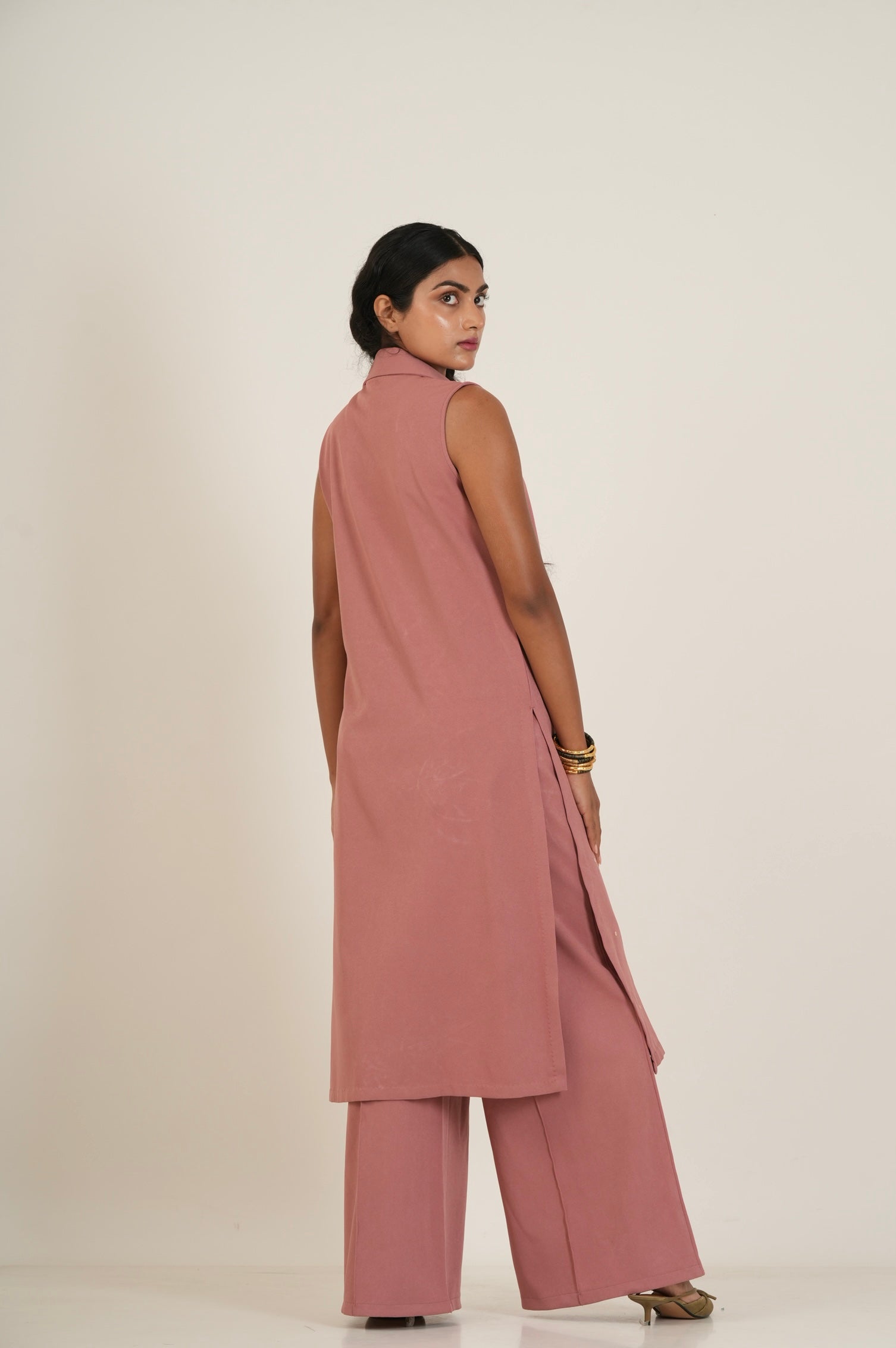 Long collar jacket with side slits, pintucks pants and sequins detailing. Comfortable and easy to carry, can be teamed up with plain inner. Made in moss crepe fabric.