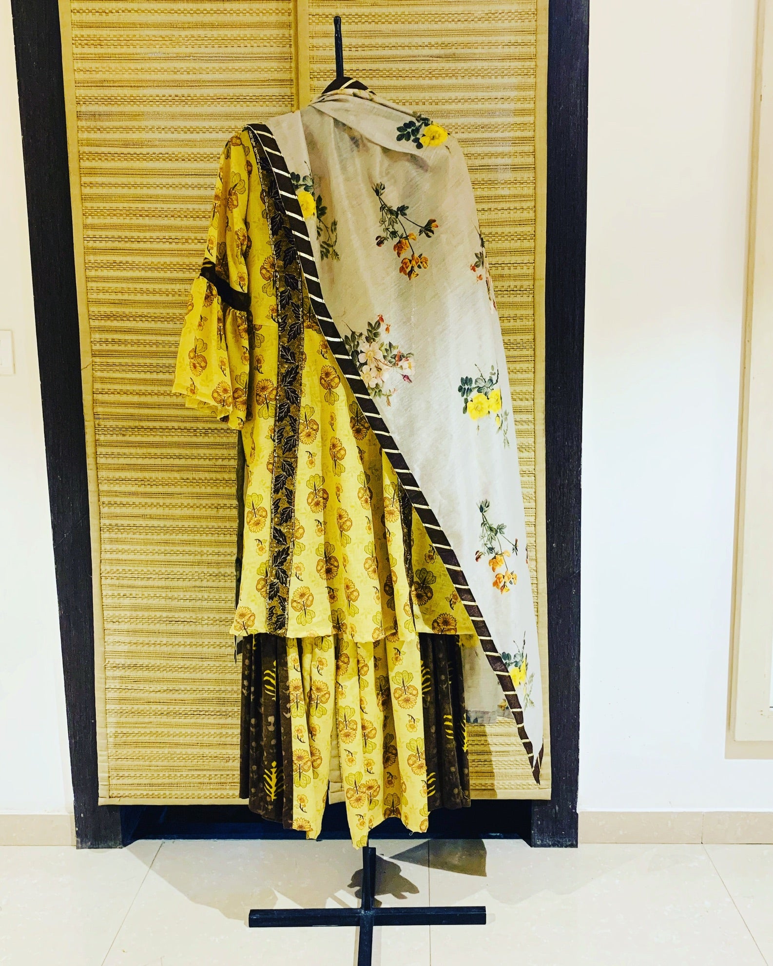 A-line short kurta having front lace detail. With sharara pants and printed, lace work dupatta.