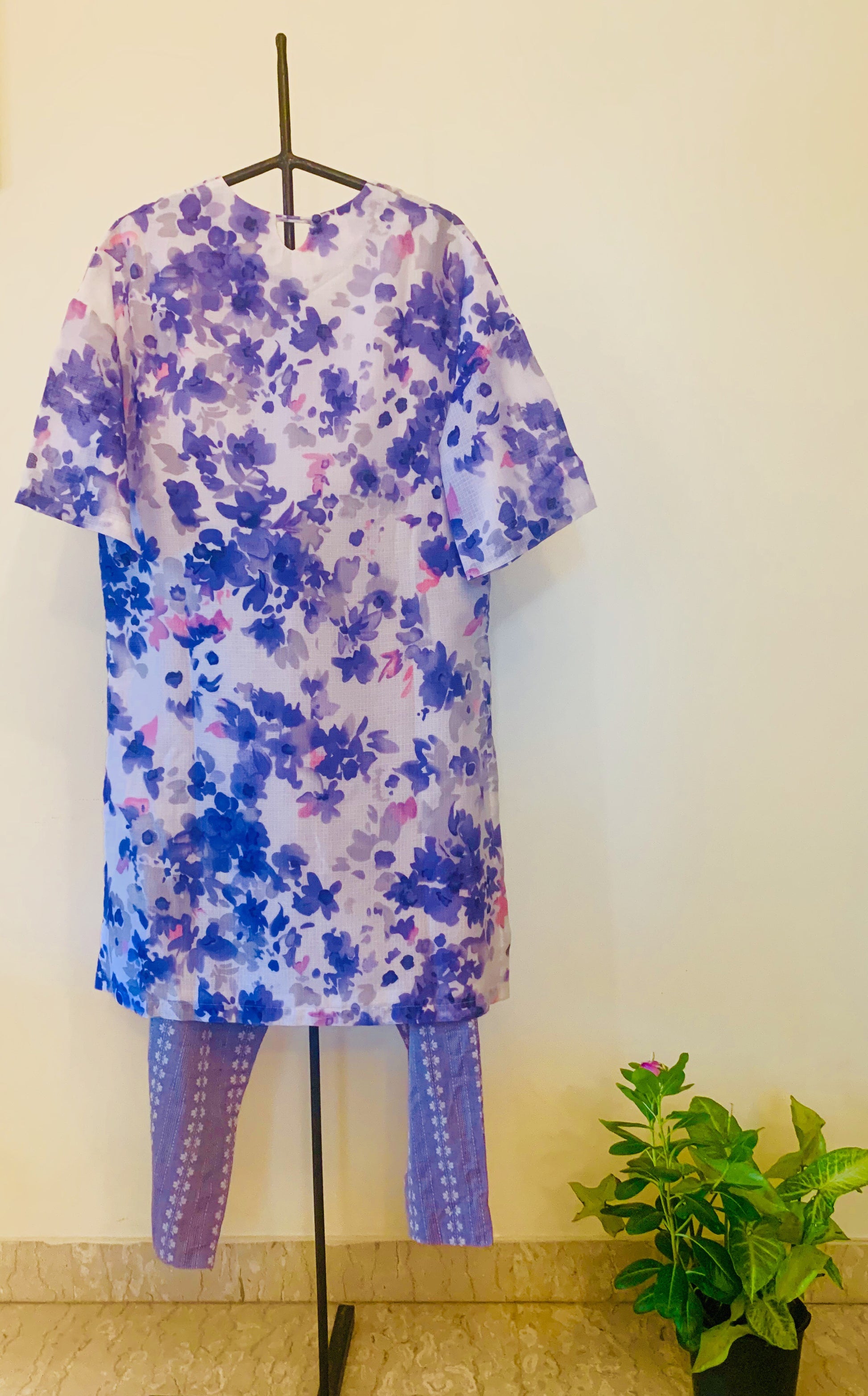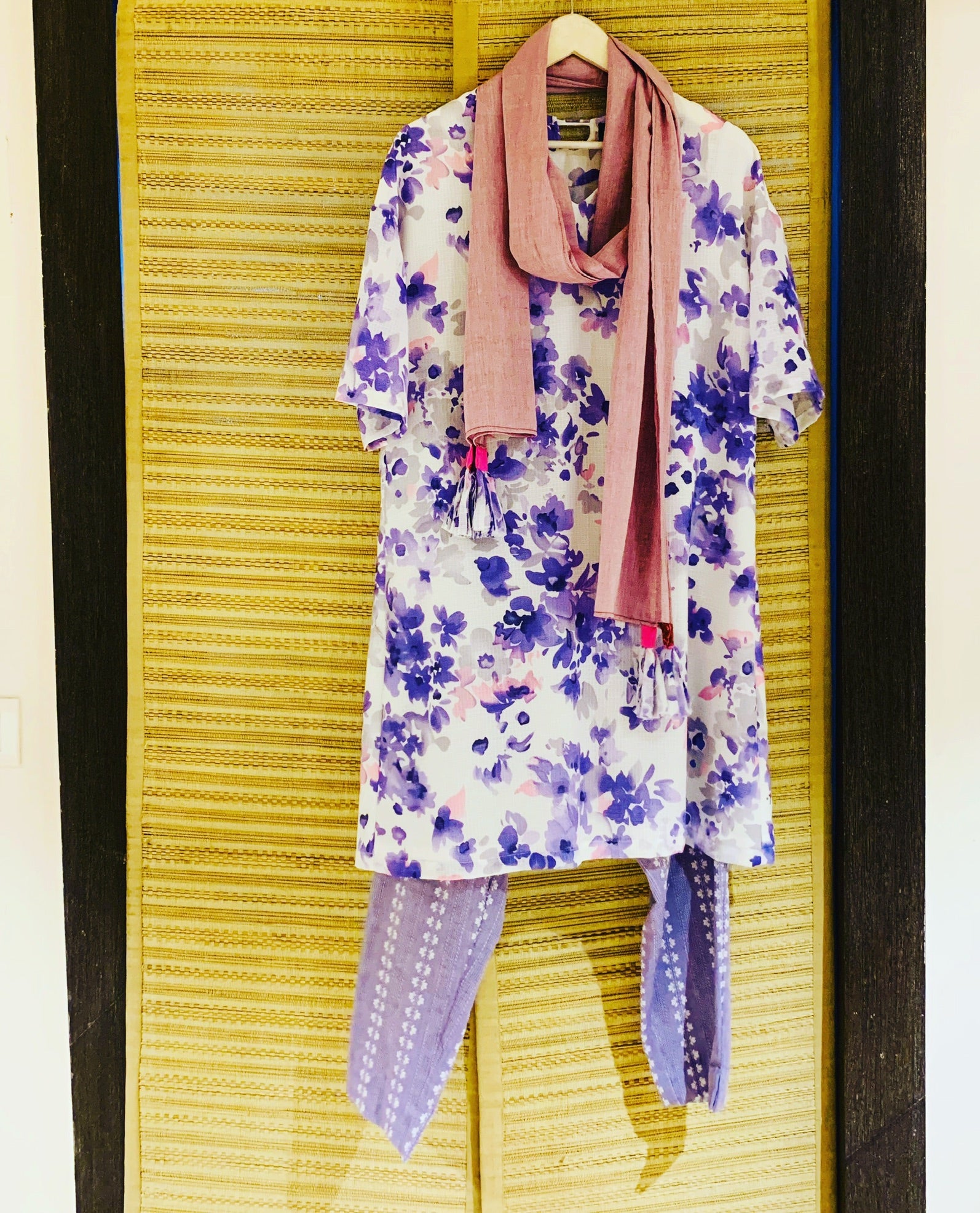 Dropped shoulder kurta with slits, loose fitting with cotton pants and cotton scarf.