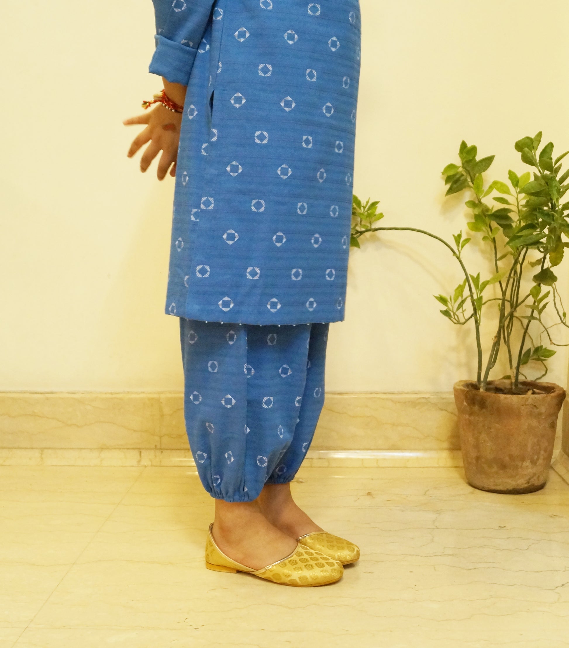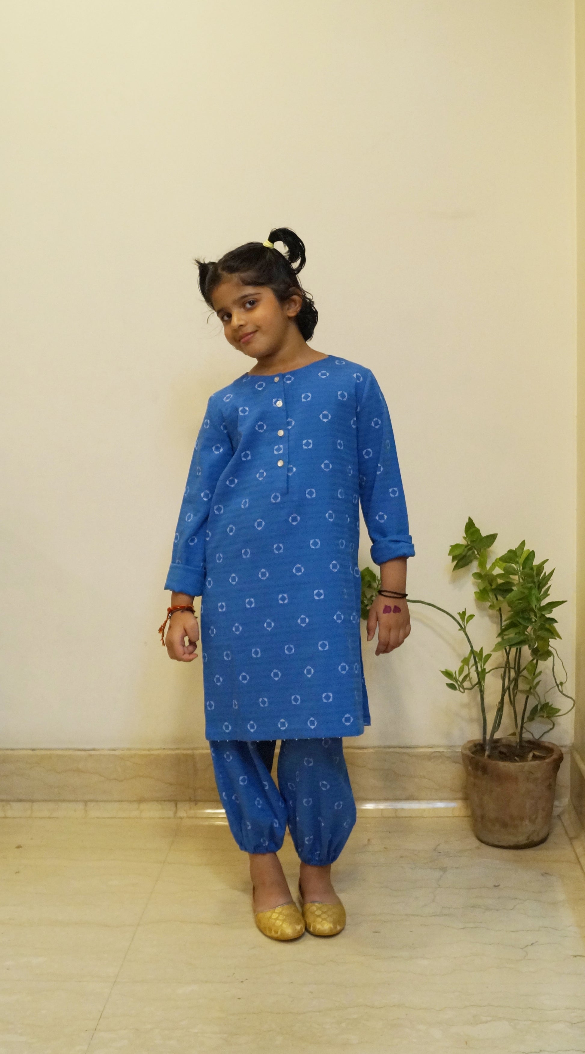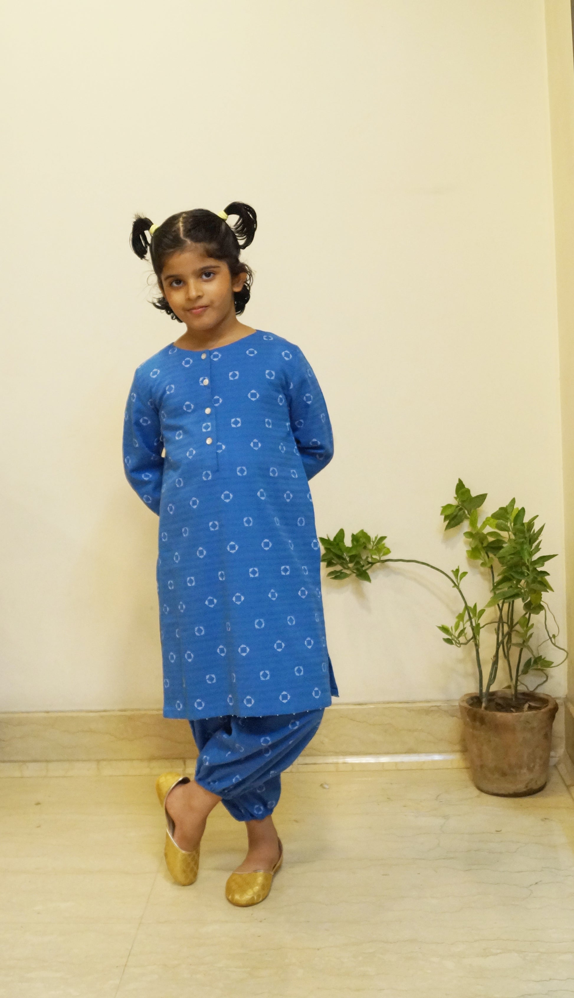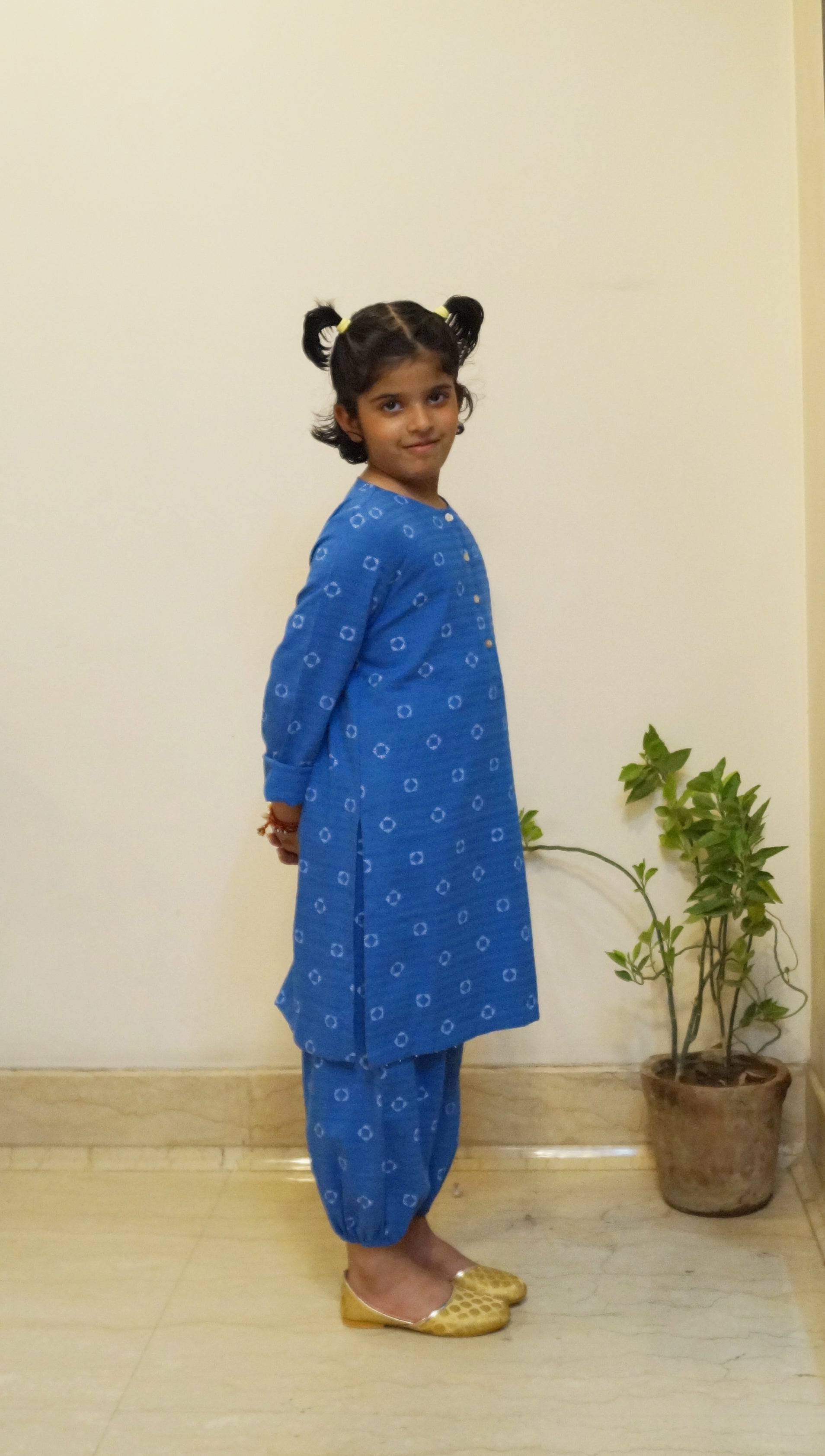 Kurta set with bead detailing on hem and metallic buttons, has round neck. With ballonpants which have belt with back elastic.