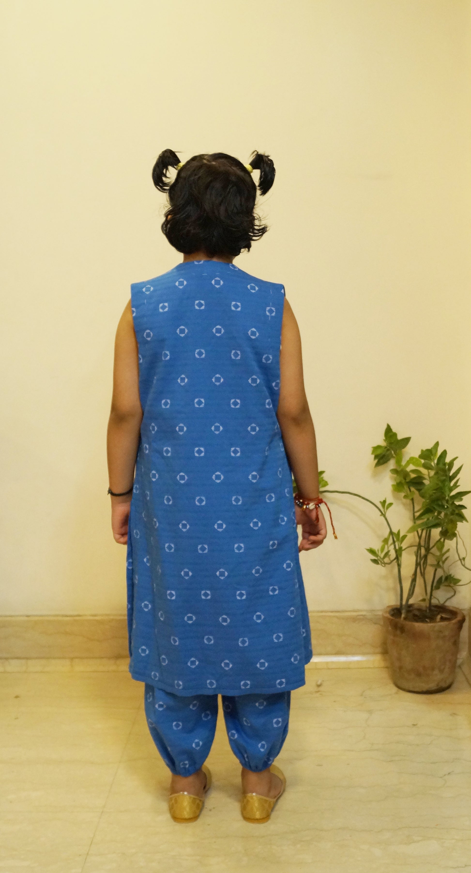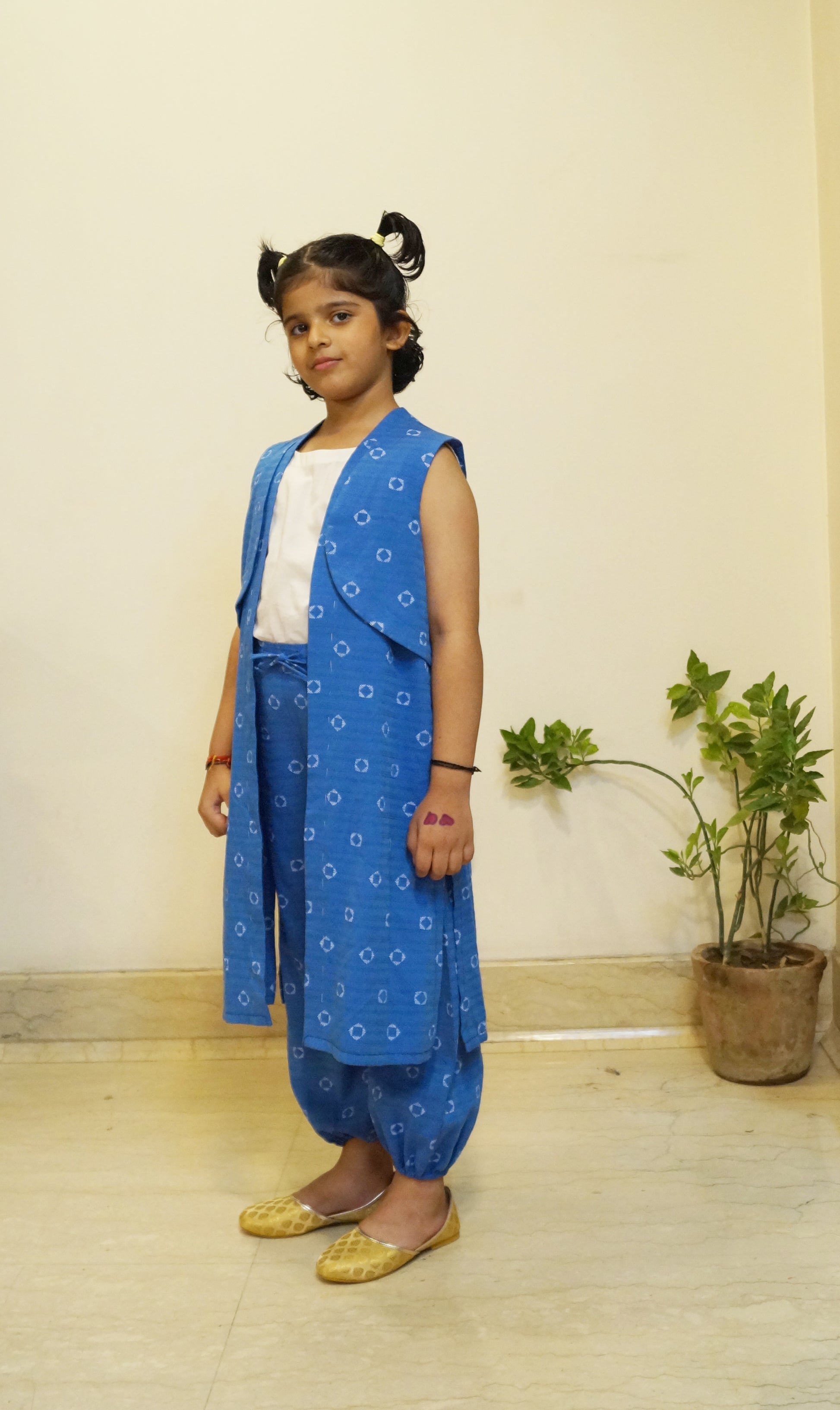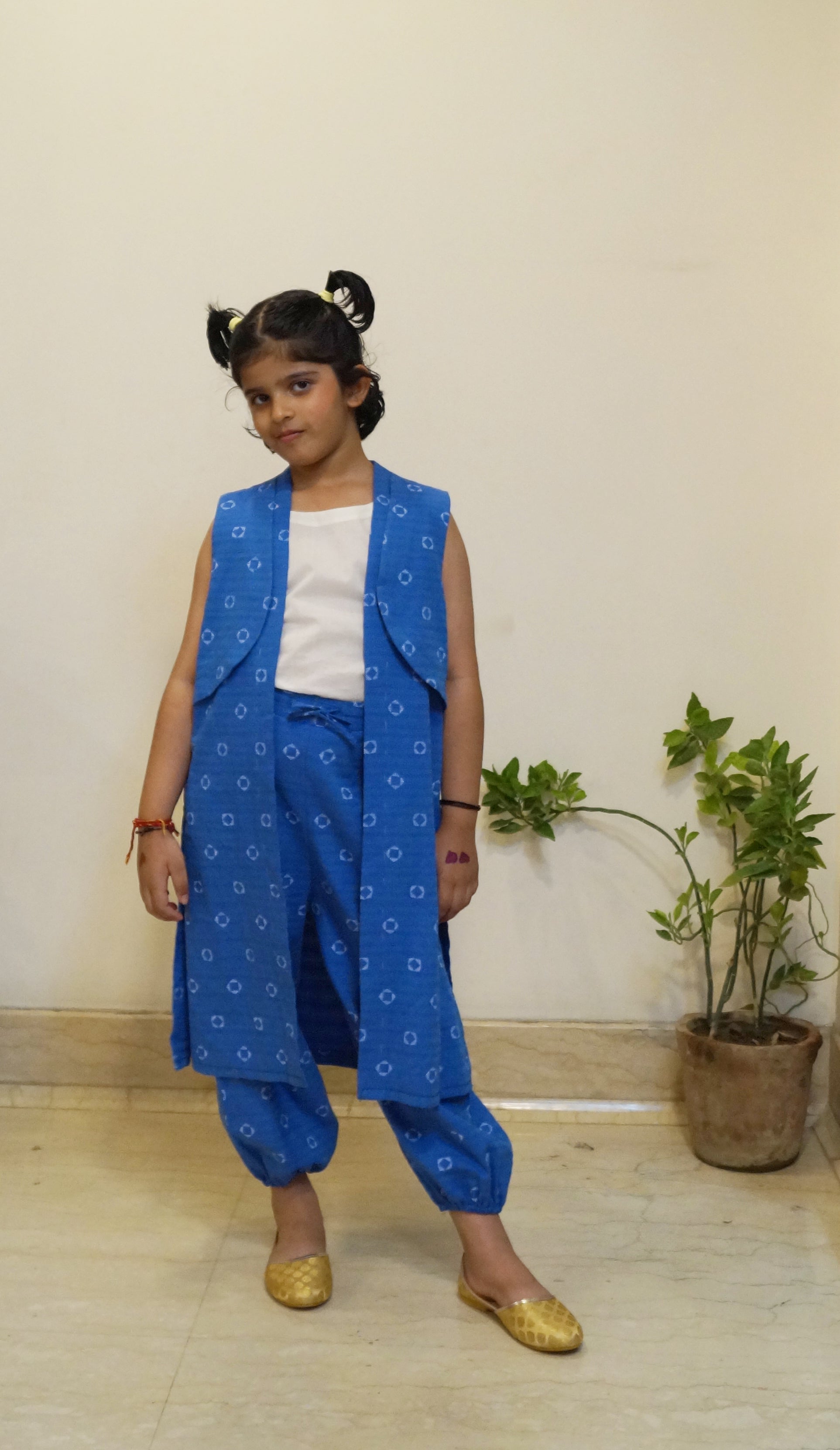 Long summer jacket, having flap detailing. Two-piece set, can be best teamed up with a basic white inner. Comes with ballonpants which have belt with back elastic. Relaxed fit.