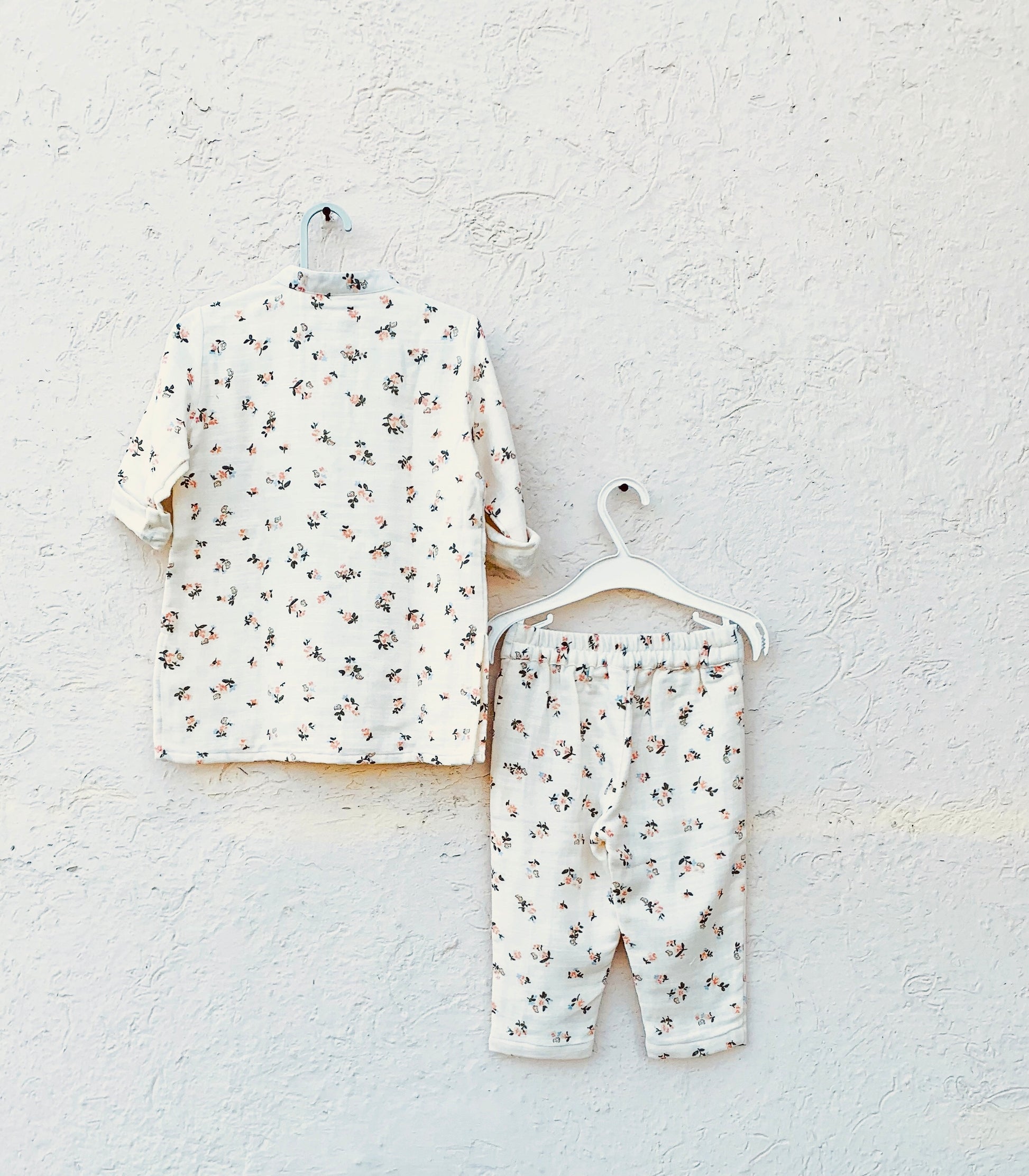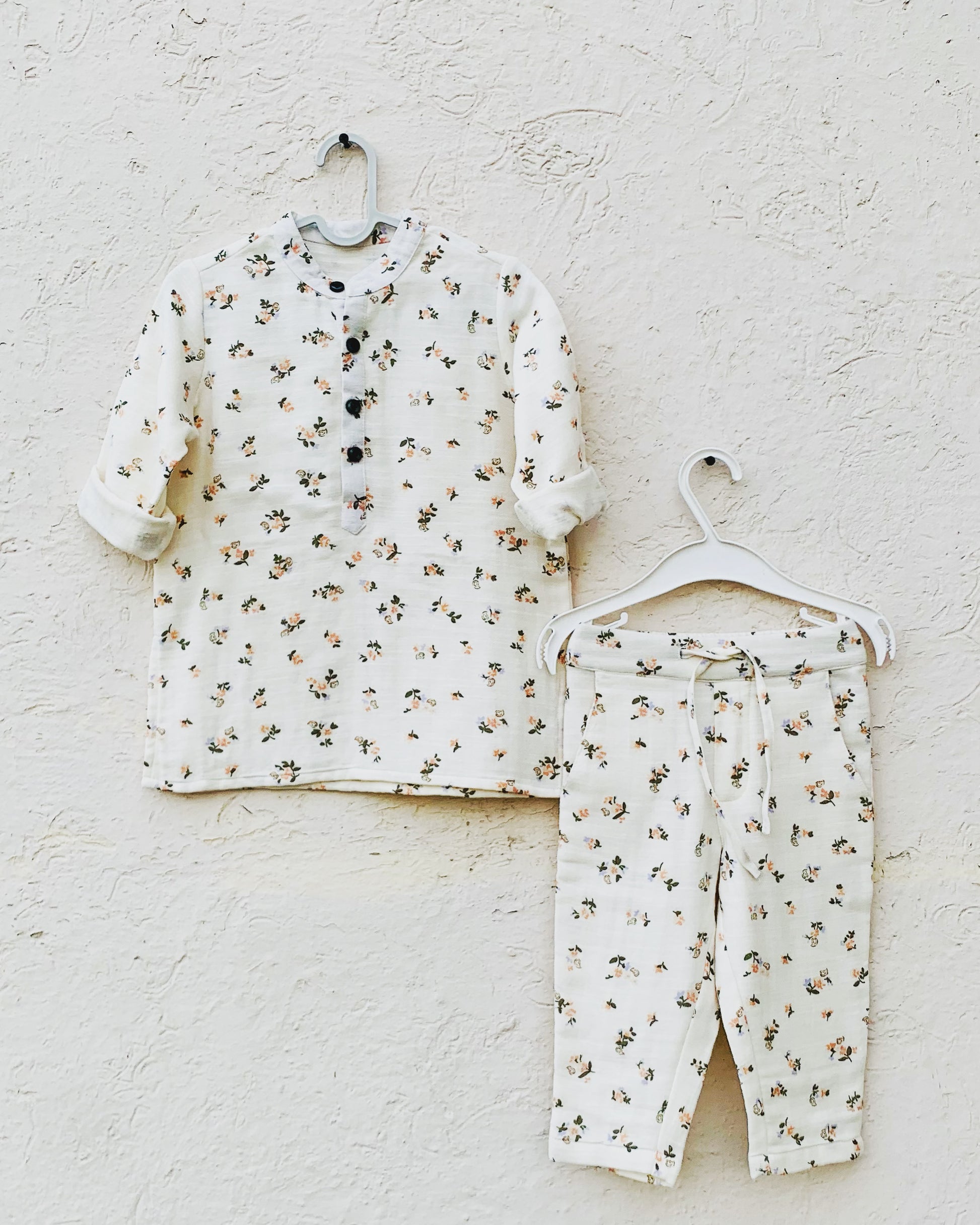Unisex Kurta pyjama set. Floral print on cotton slub fabric. Front button opening.