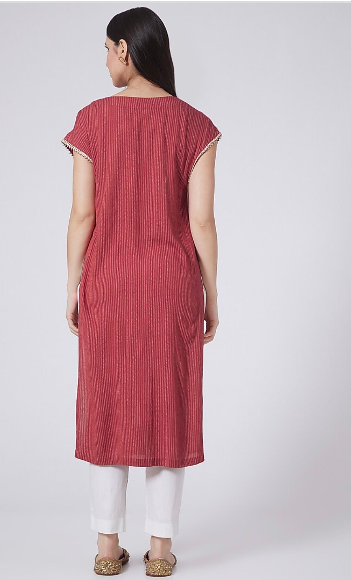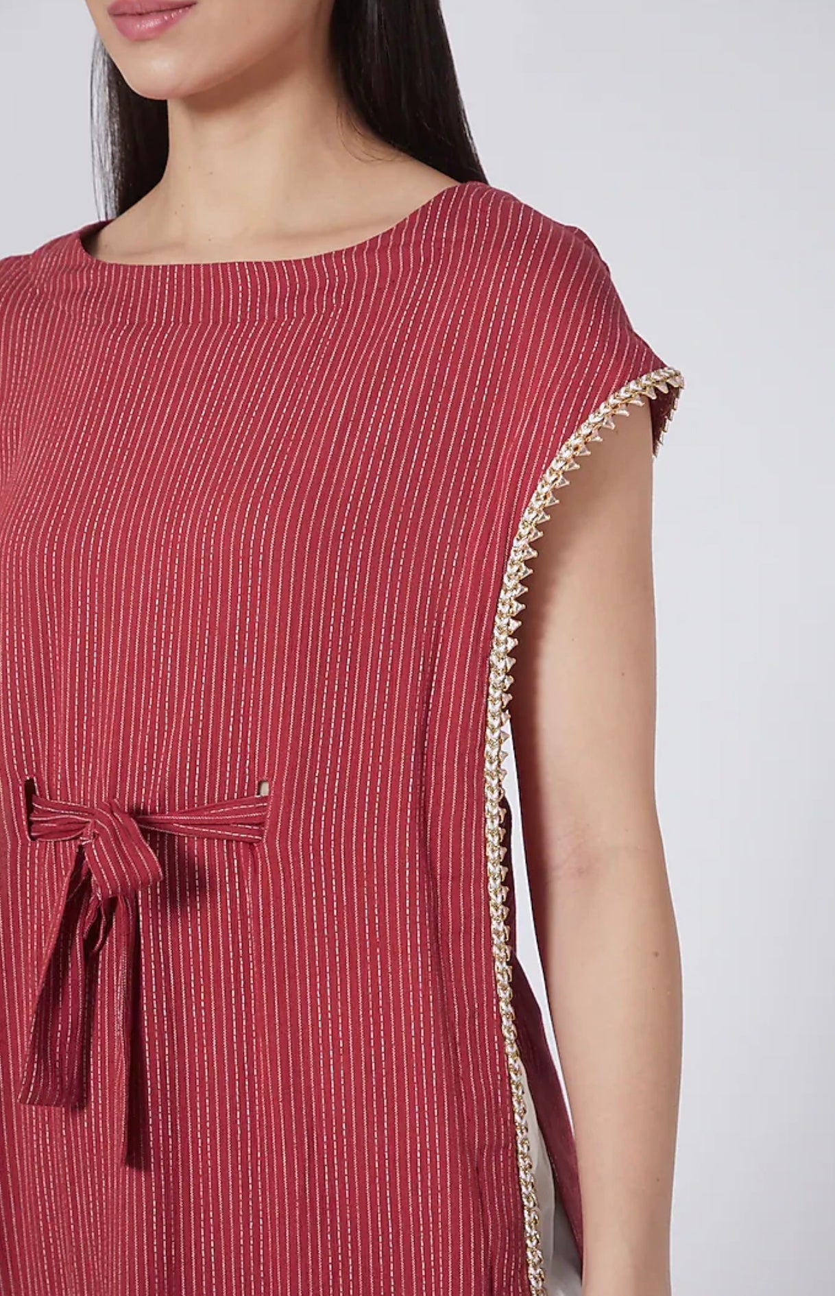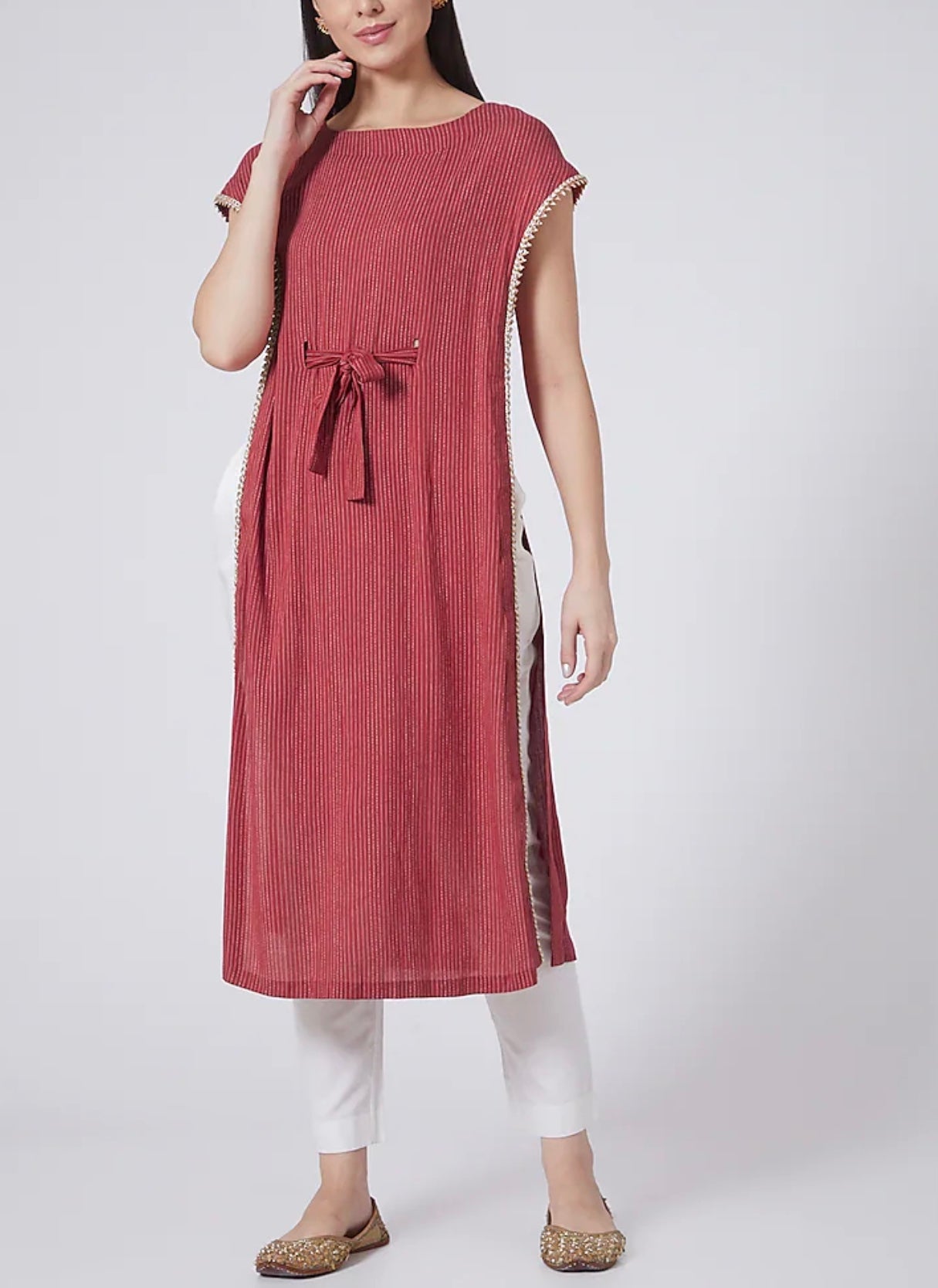Maroon kurta in cotton base with a tie-up, stripes print, and gota embroidery. This contains only one piece.