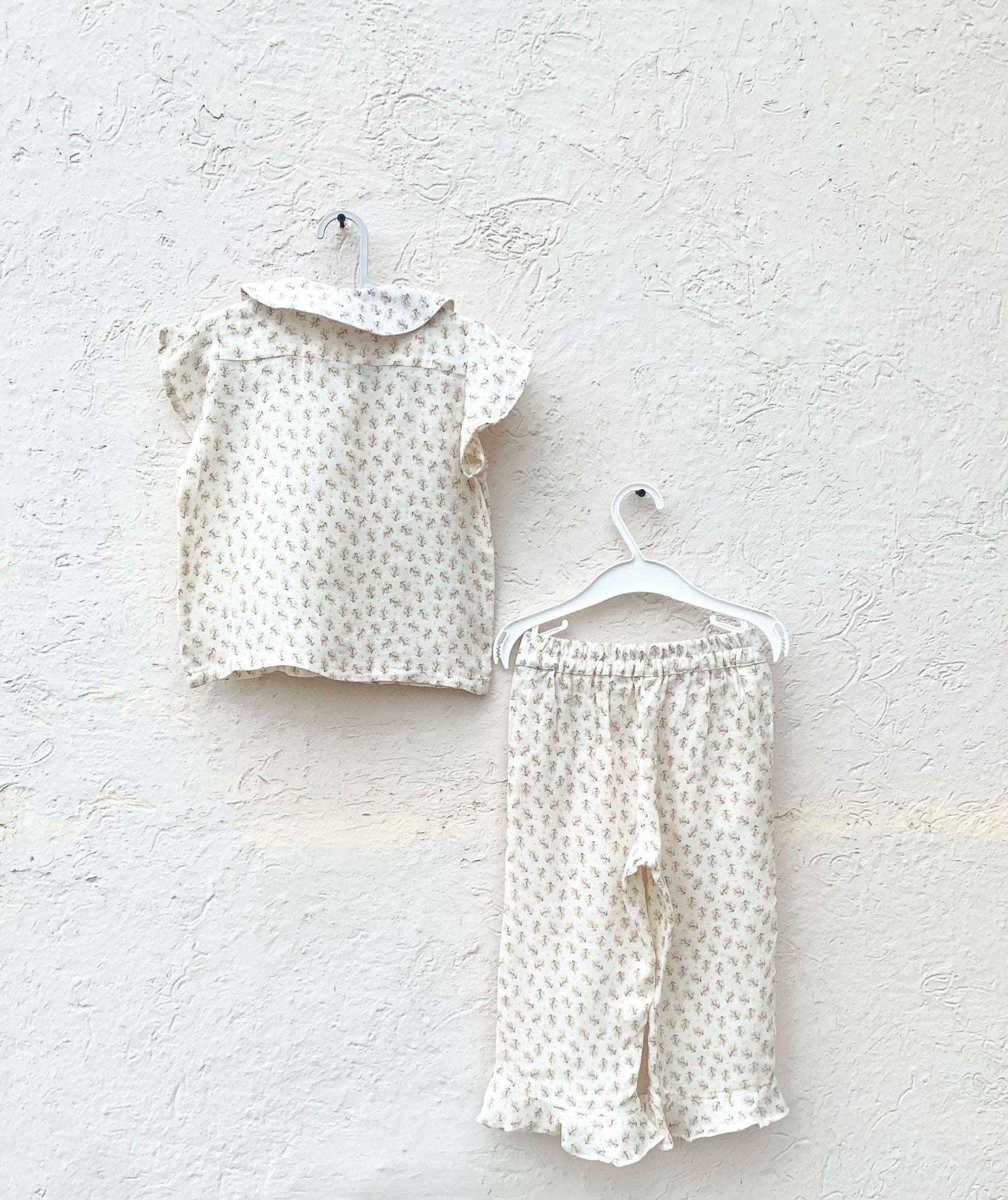 Cord set with peter pan collar and front button opening. Frilled pyjama with pockets.