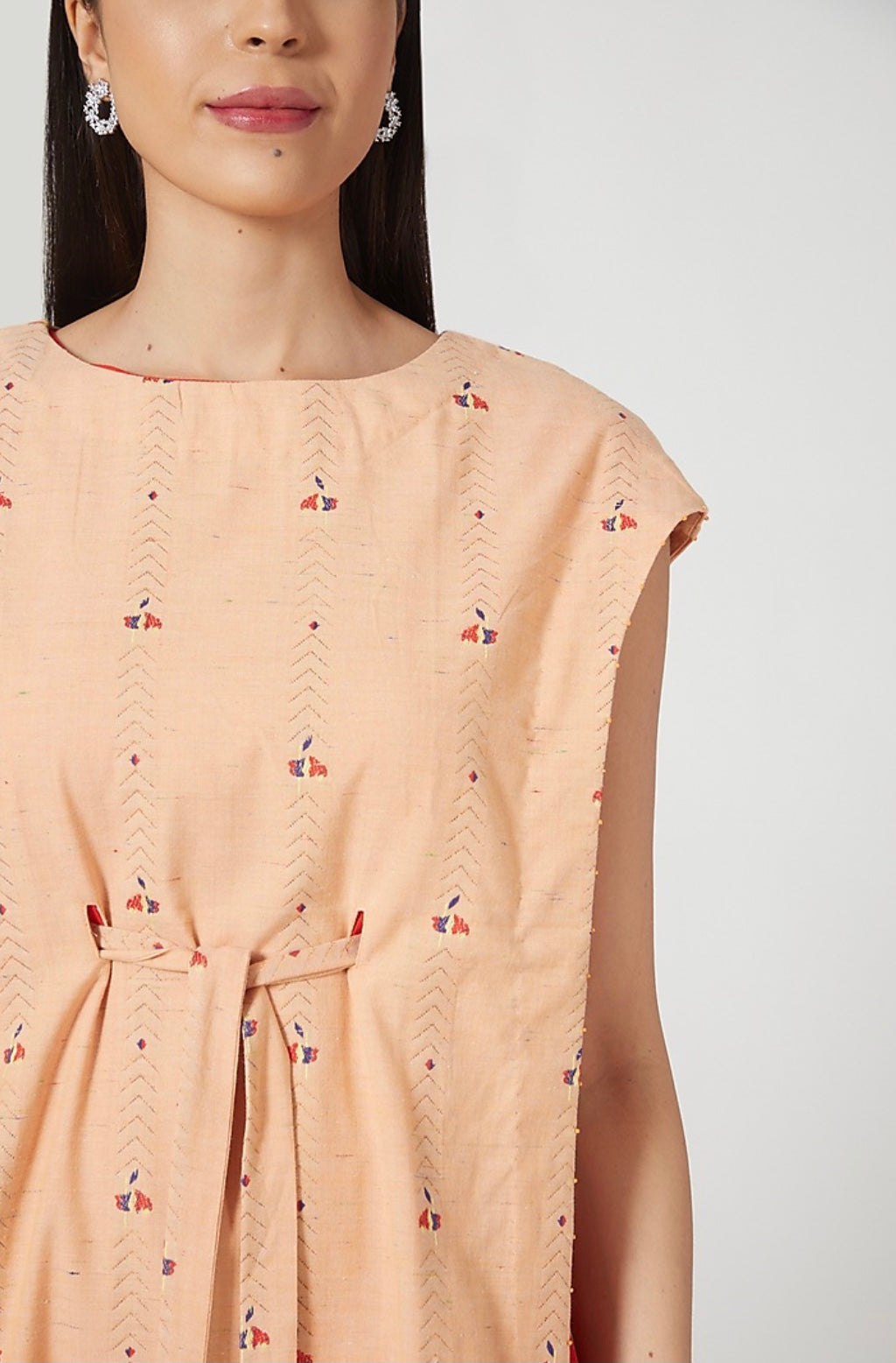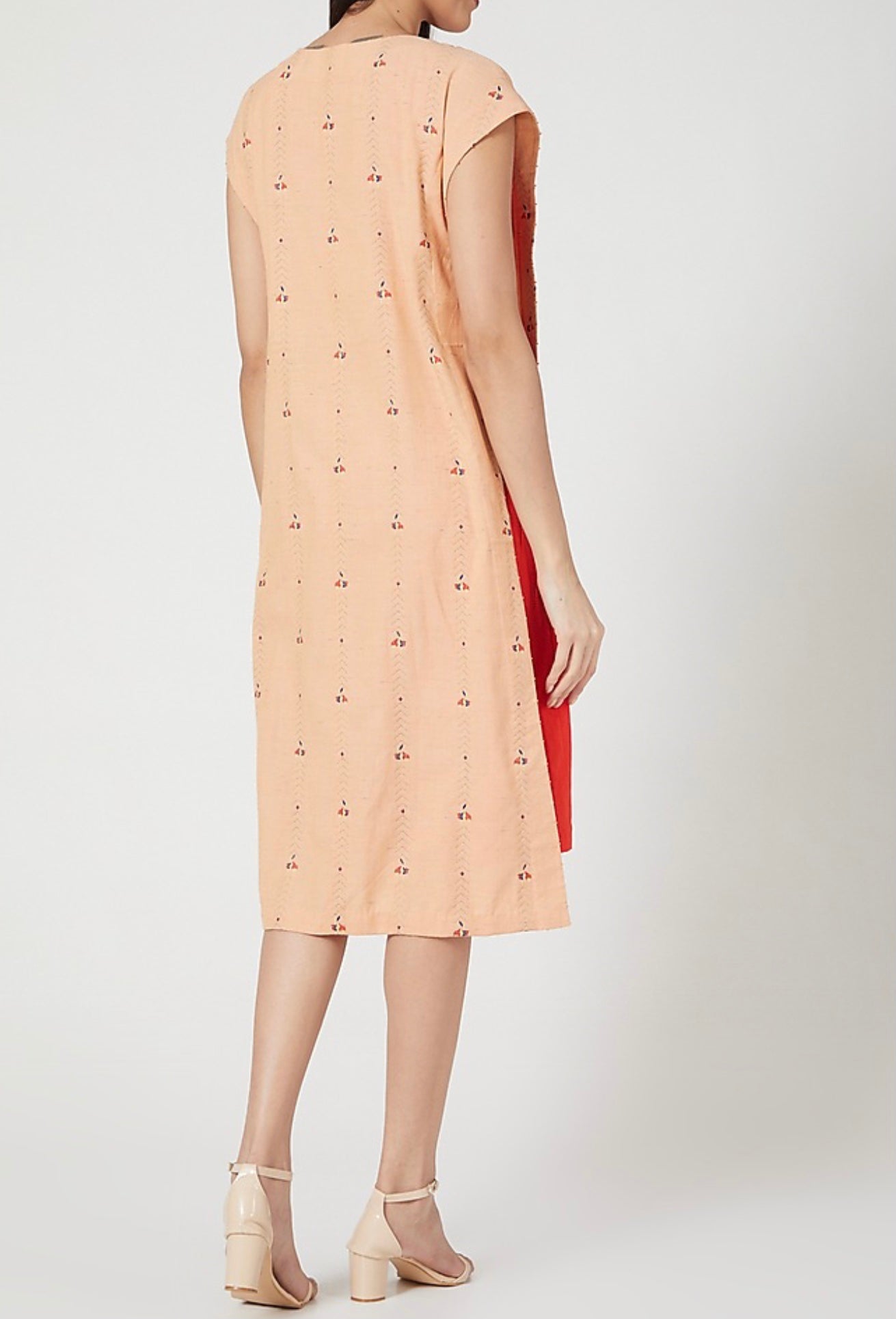 Featuring a peach double layered dress in cotton slub base with slits. It has thread, beads, and bird motifs embroidery.