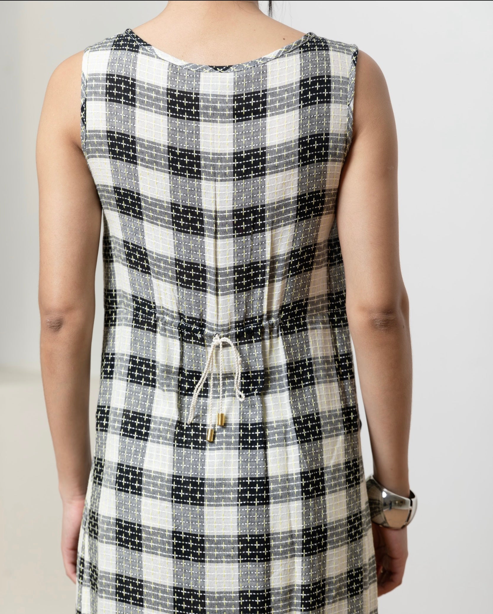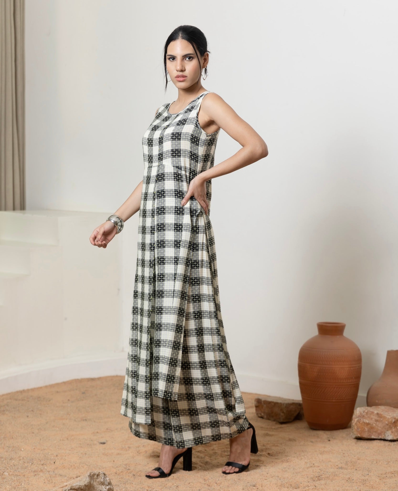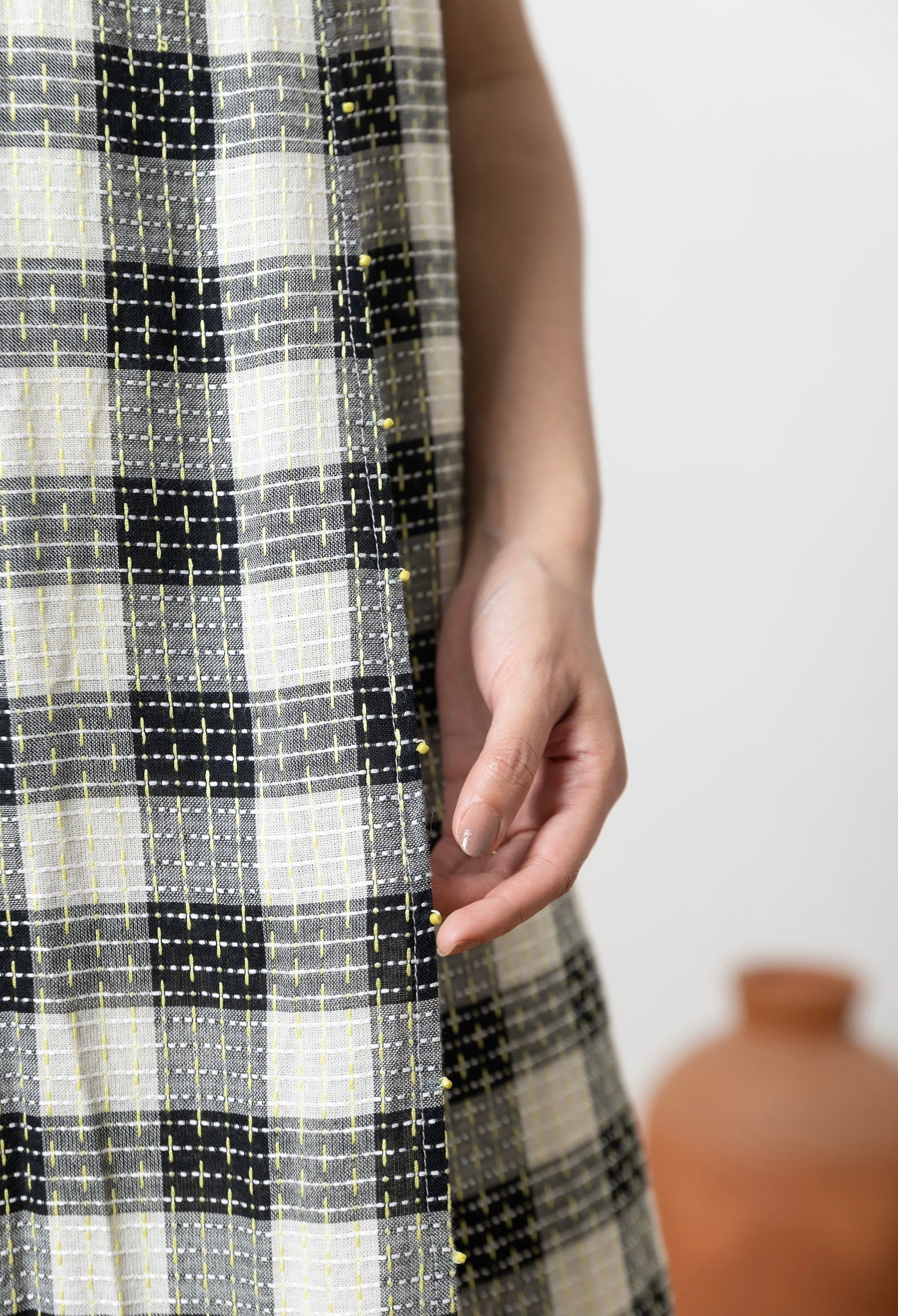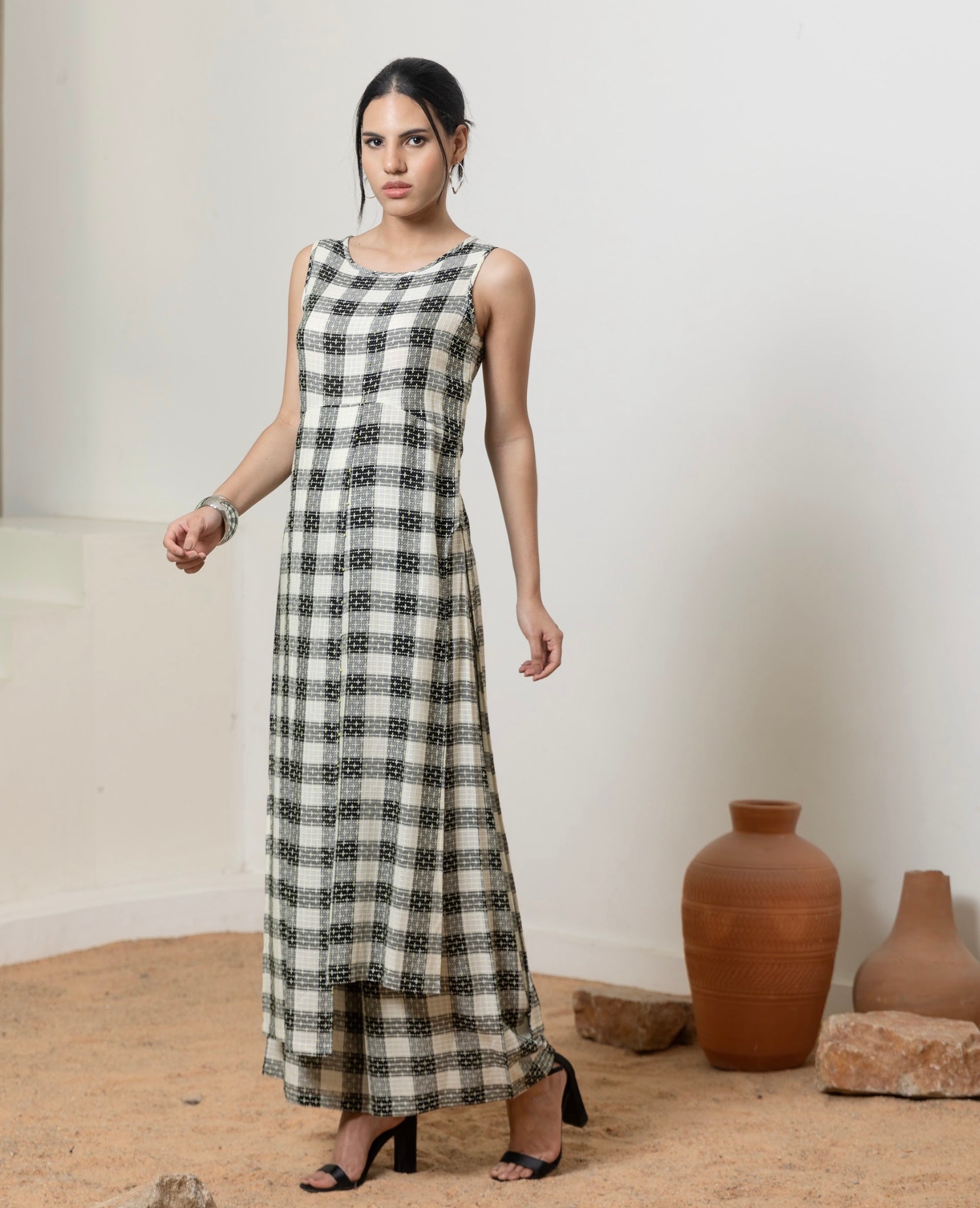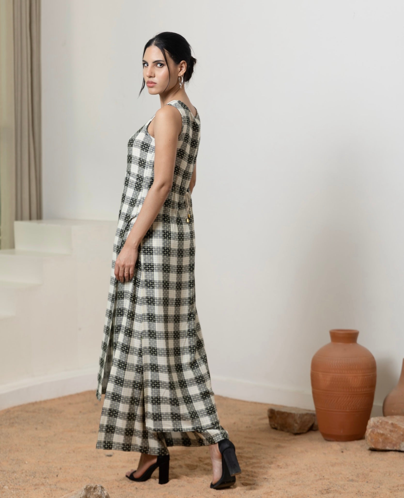 Long top with assymetric hem, checkered cotton fabric with beautiful green bead detailing. Comes with comfortable flared pants (with back elastic).