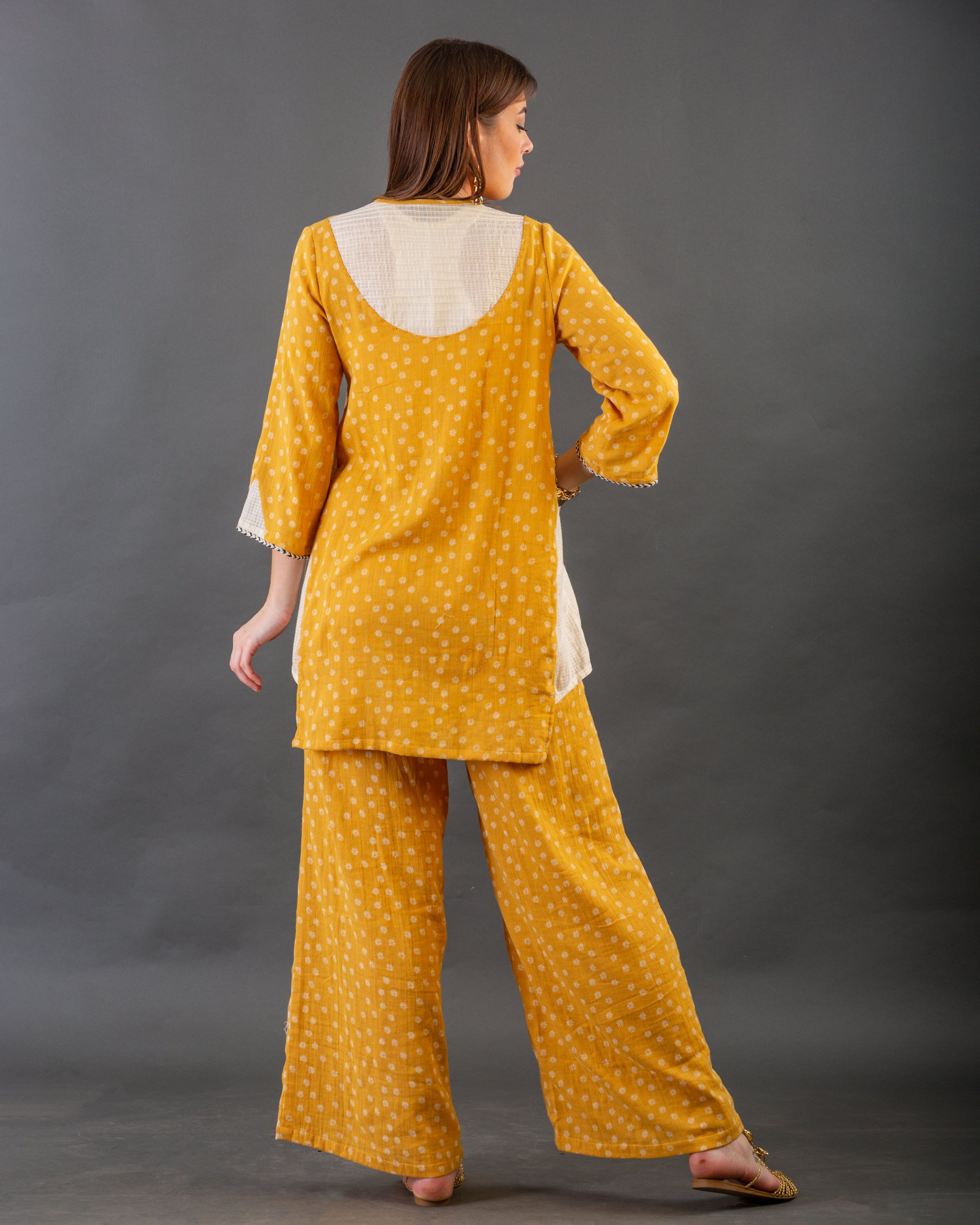 Set of two, jacket with different fabric panel detailing and also pintuck, lace and beads detailing. Jacket is relaxed fit with front pockets. Comes with slight flared pants, having elastic at back.
