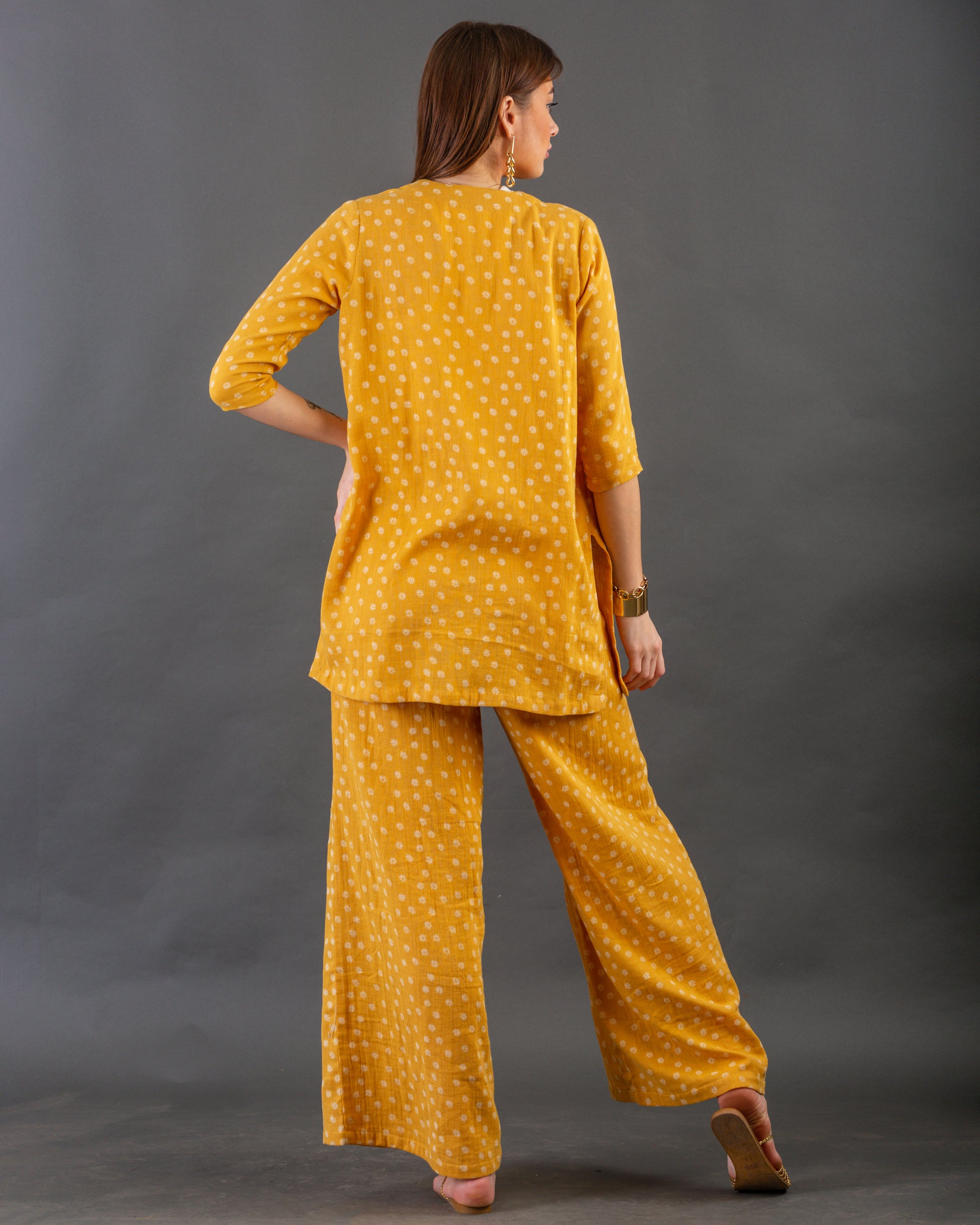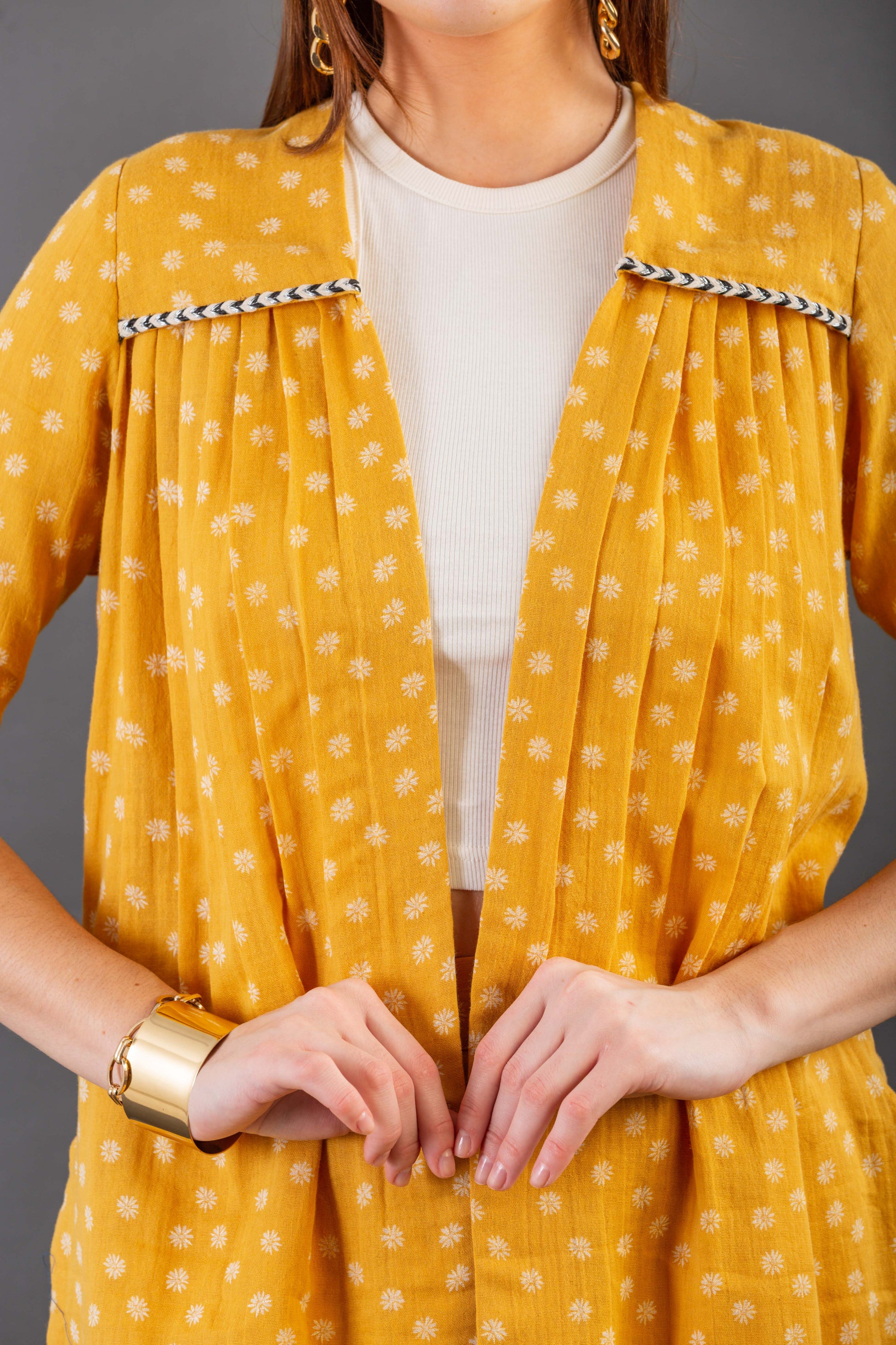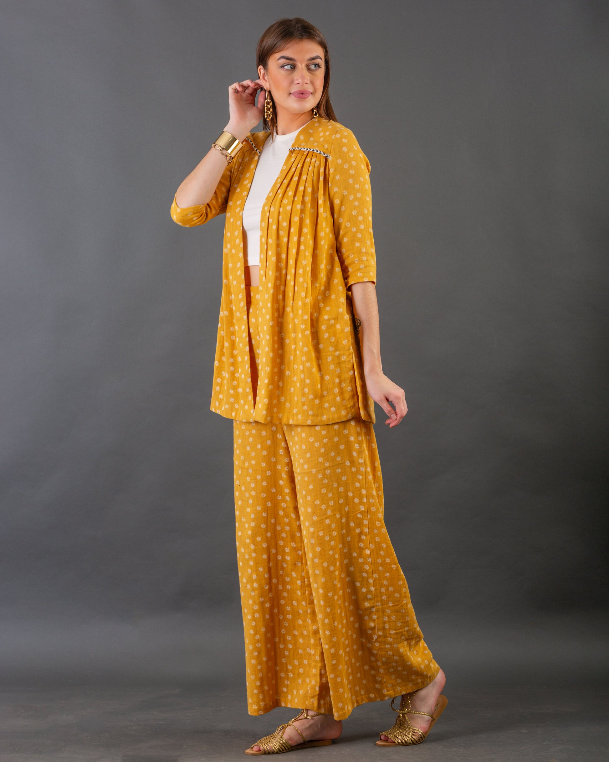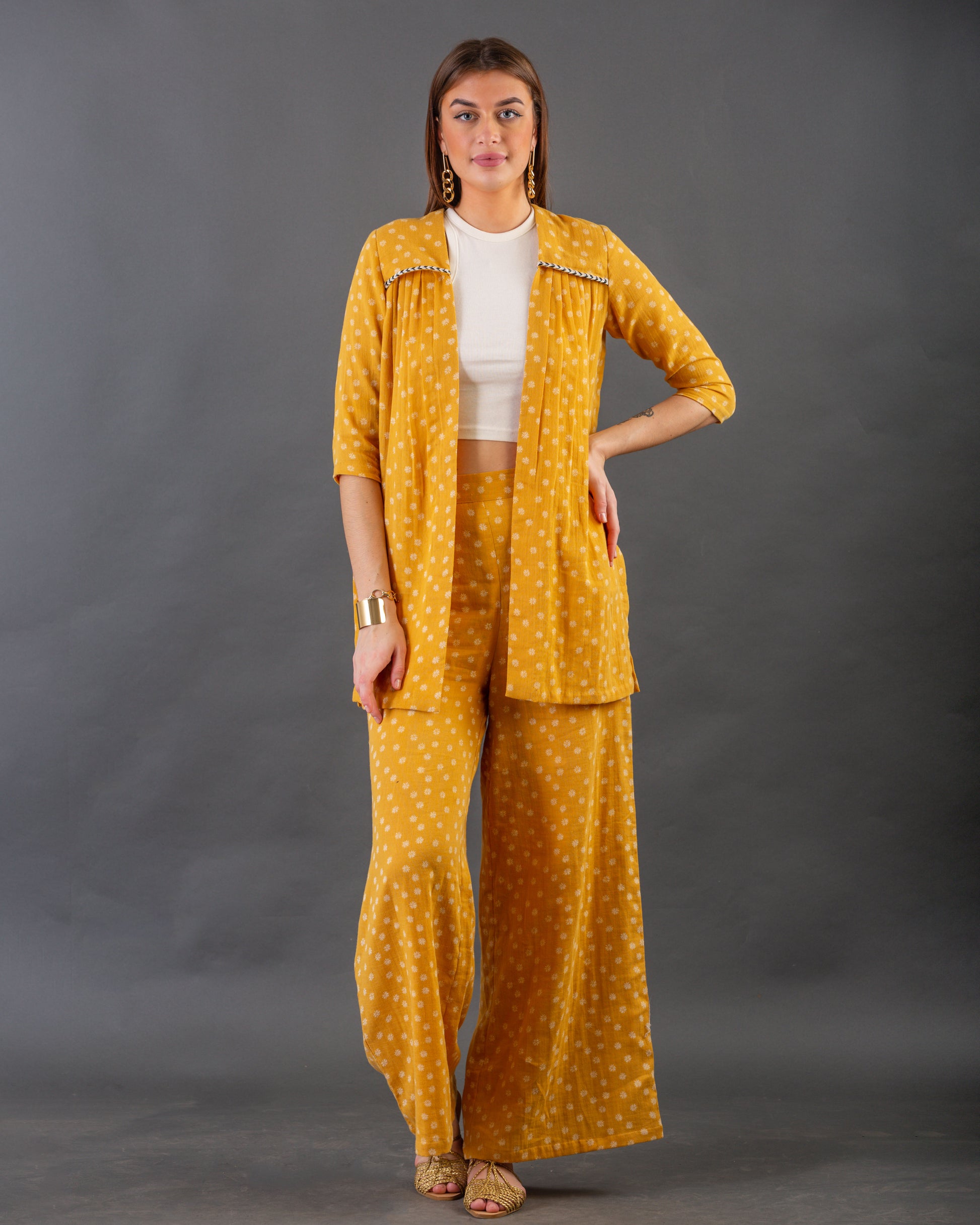 Set of two. Comes with front open jacket, pleats on front and lace detailing. Slight flared pants with elastic on back. Both jacket and pants are relaxed fit.