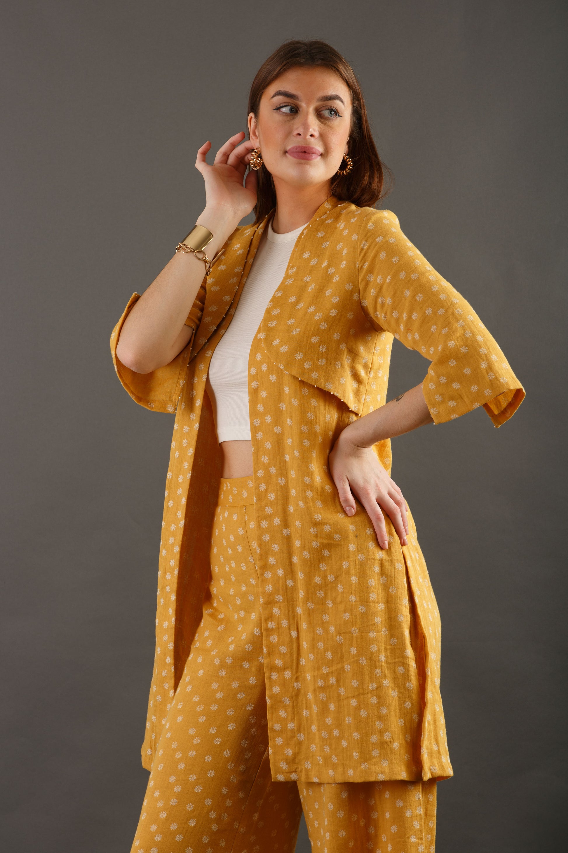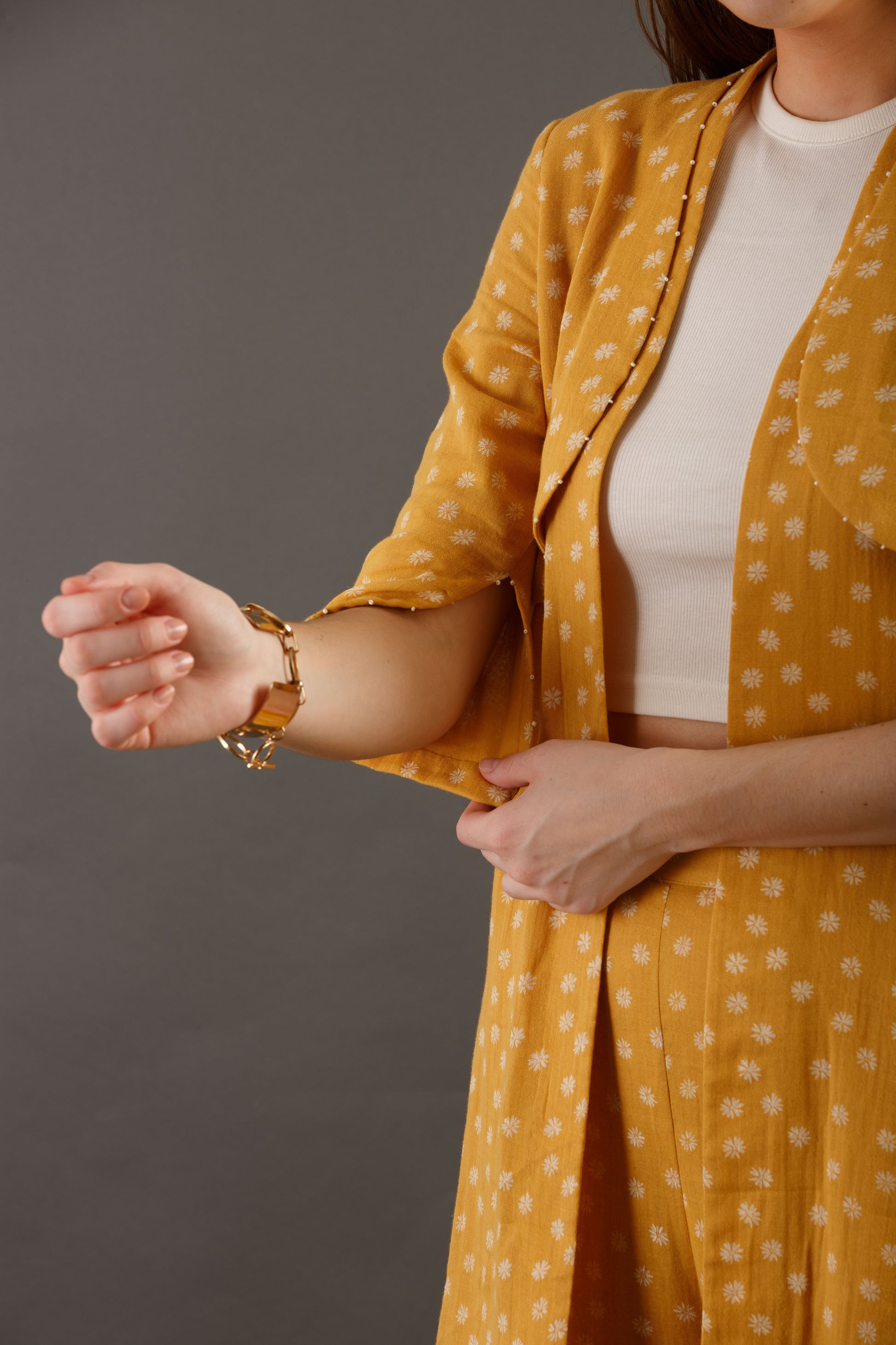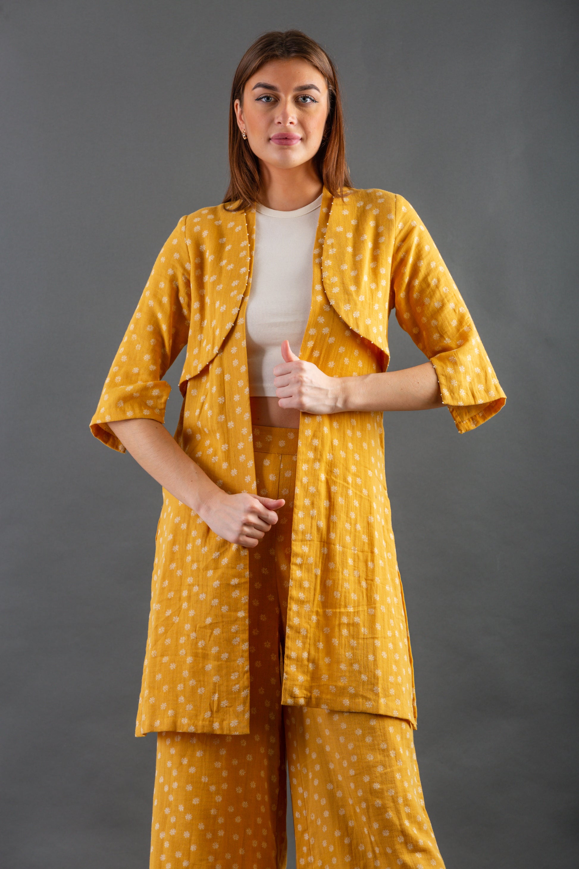 Set of two. Cotton sleeveless jacket with flap panel on shoulder and bead detailing. Can be ordered with either flared pants or slim fit pants. The jacket has side slits.