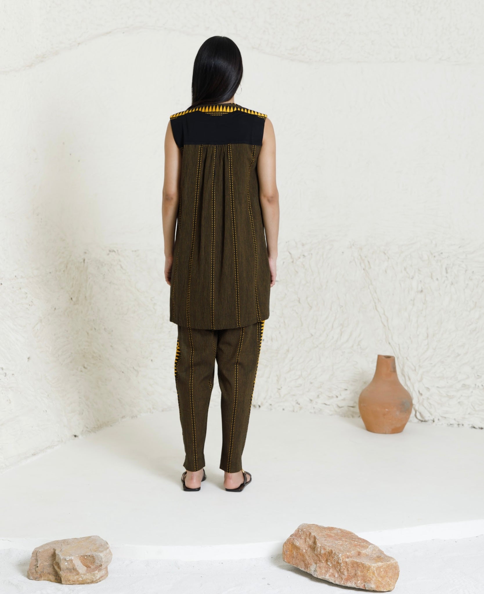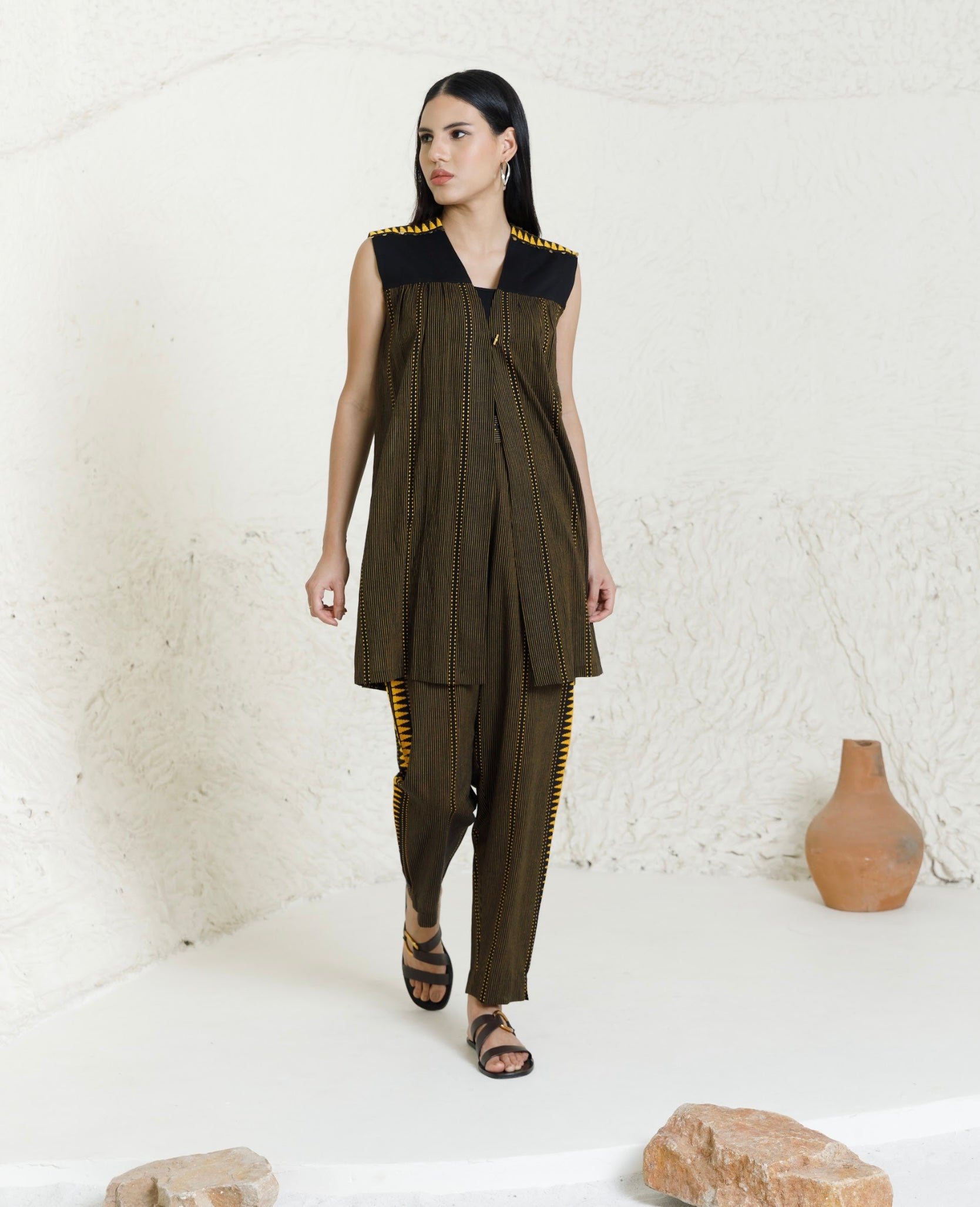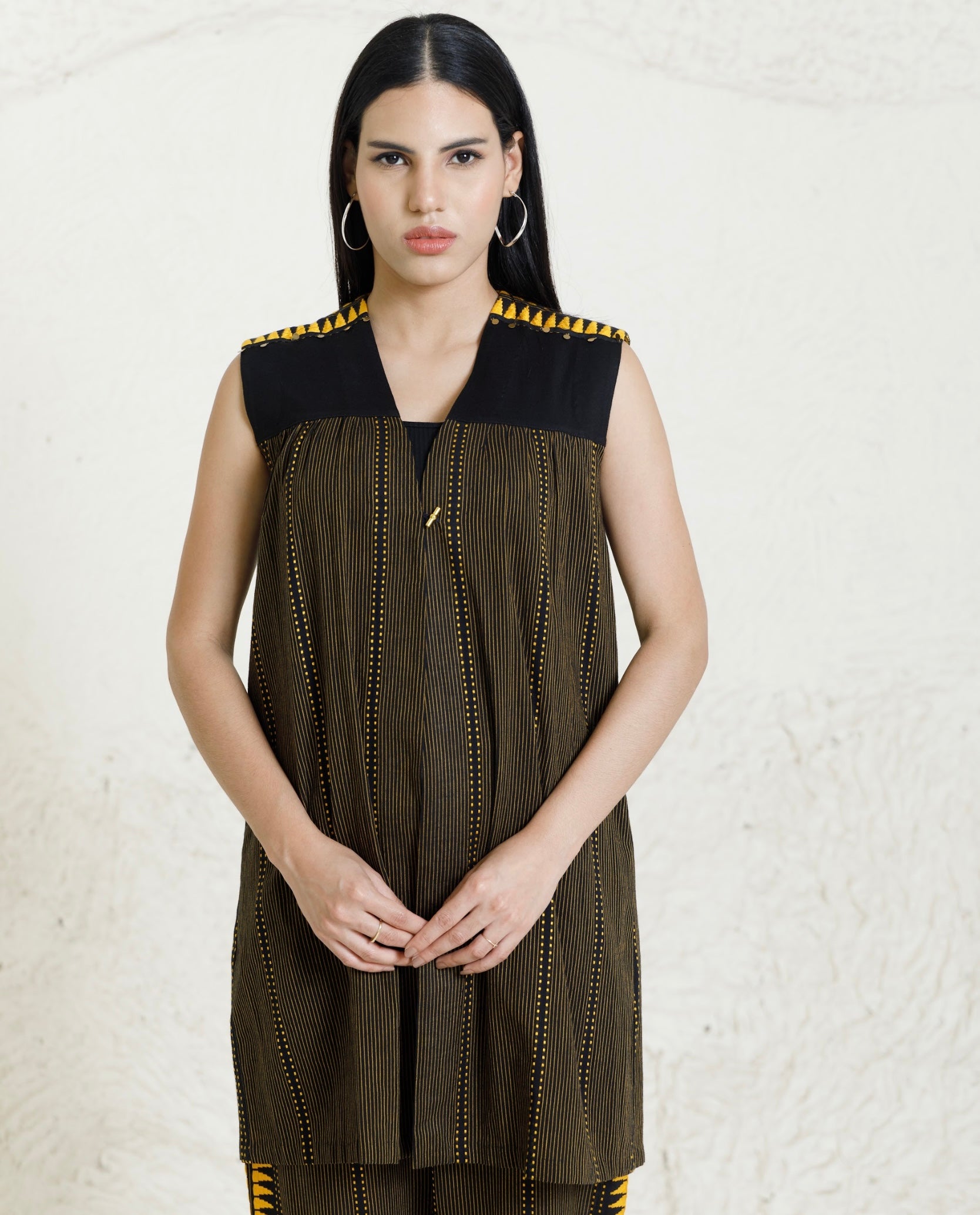 Cotton jacket with bead detailing on the shoulder with comfortable cotton pants, loop button for closure. Relaxed fit.