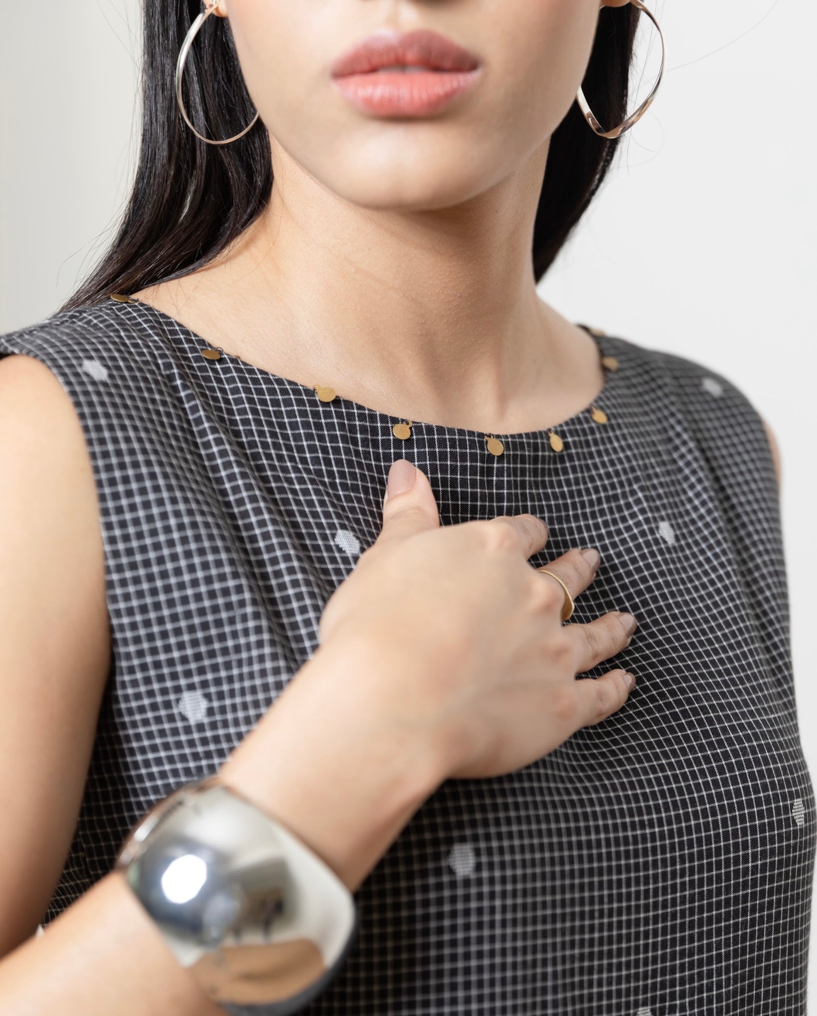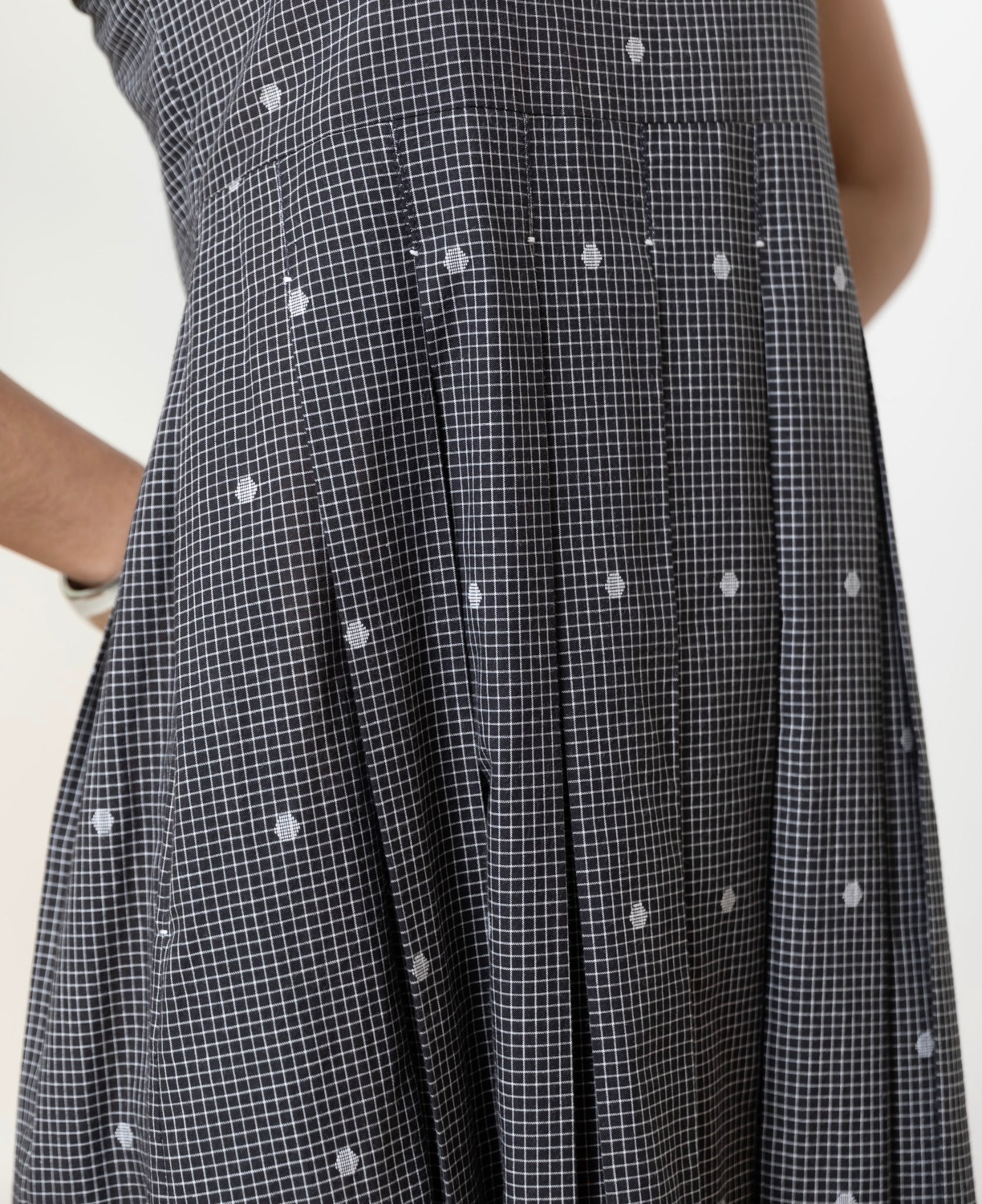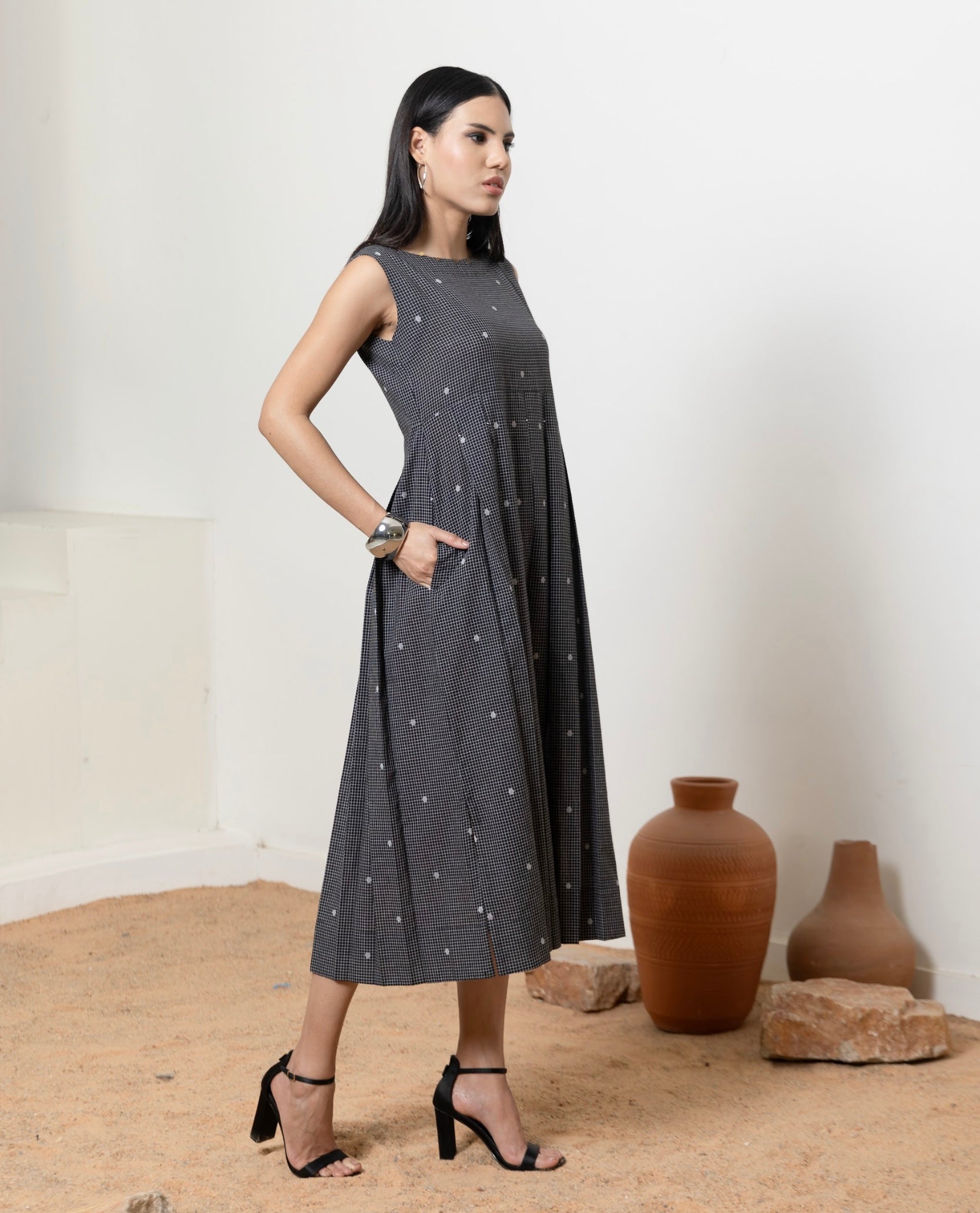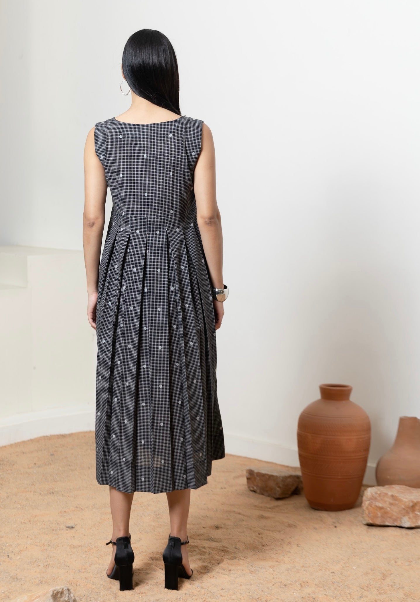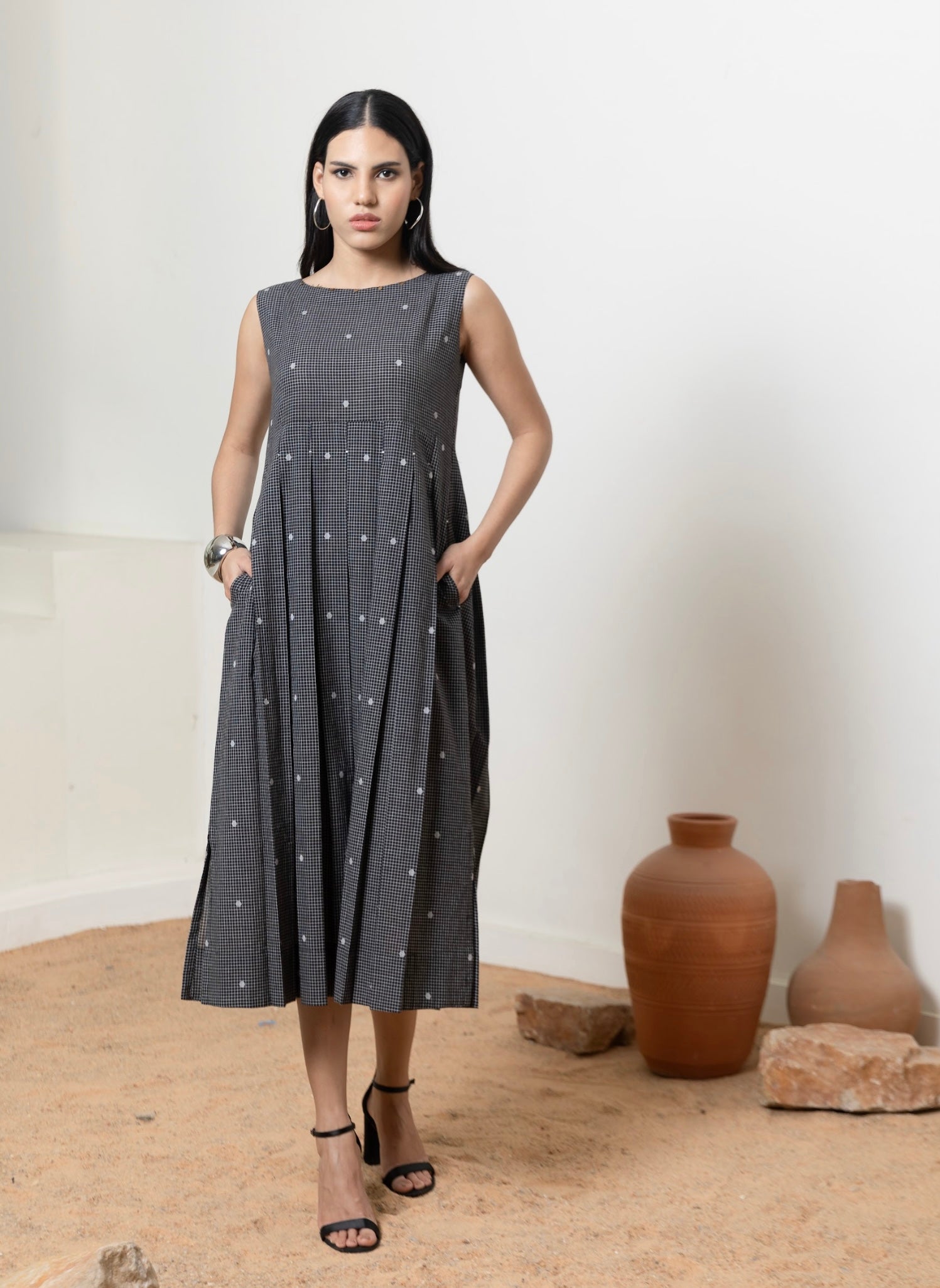 Long pleated dress with bead detailing on neck and side slits, in comfortable cotton fabric. Relaxed fit