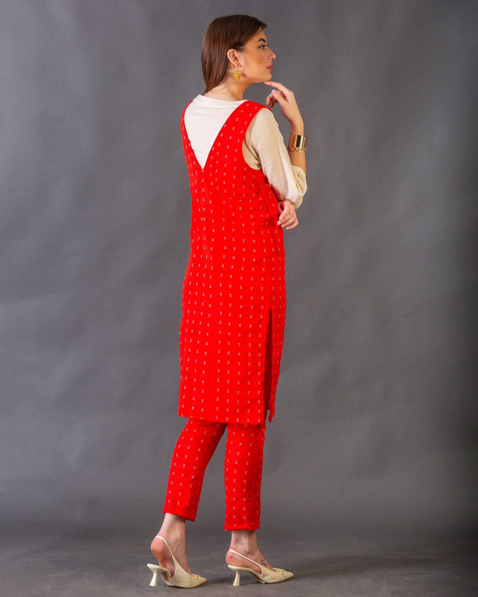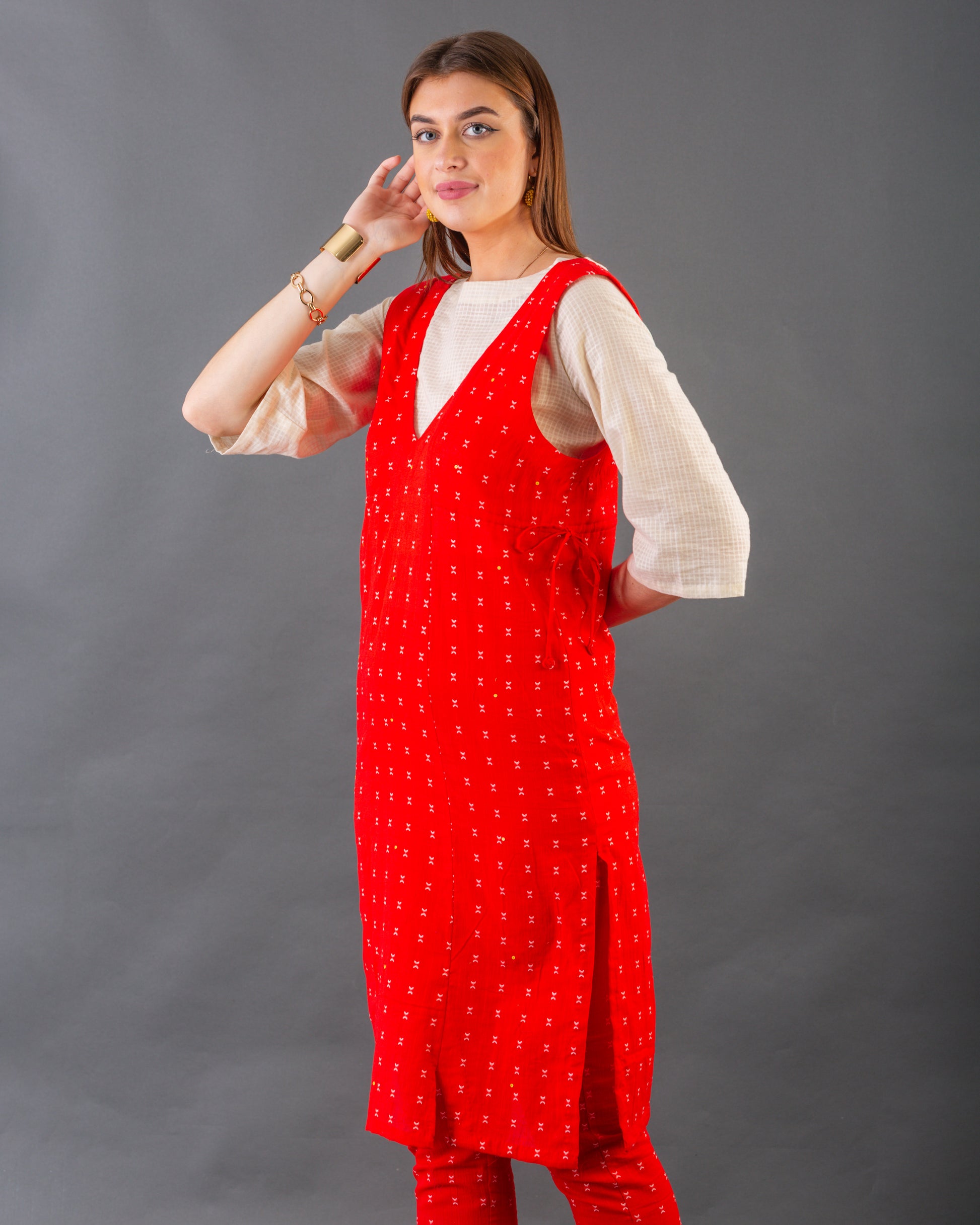 Dropped neck and armhole top with off-white cropped inner. It has a tie-up detailing on the sides with front small slits.