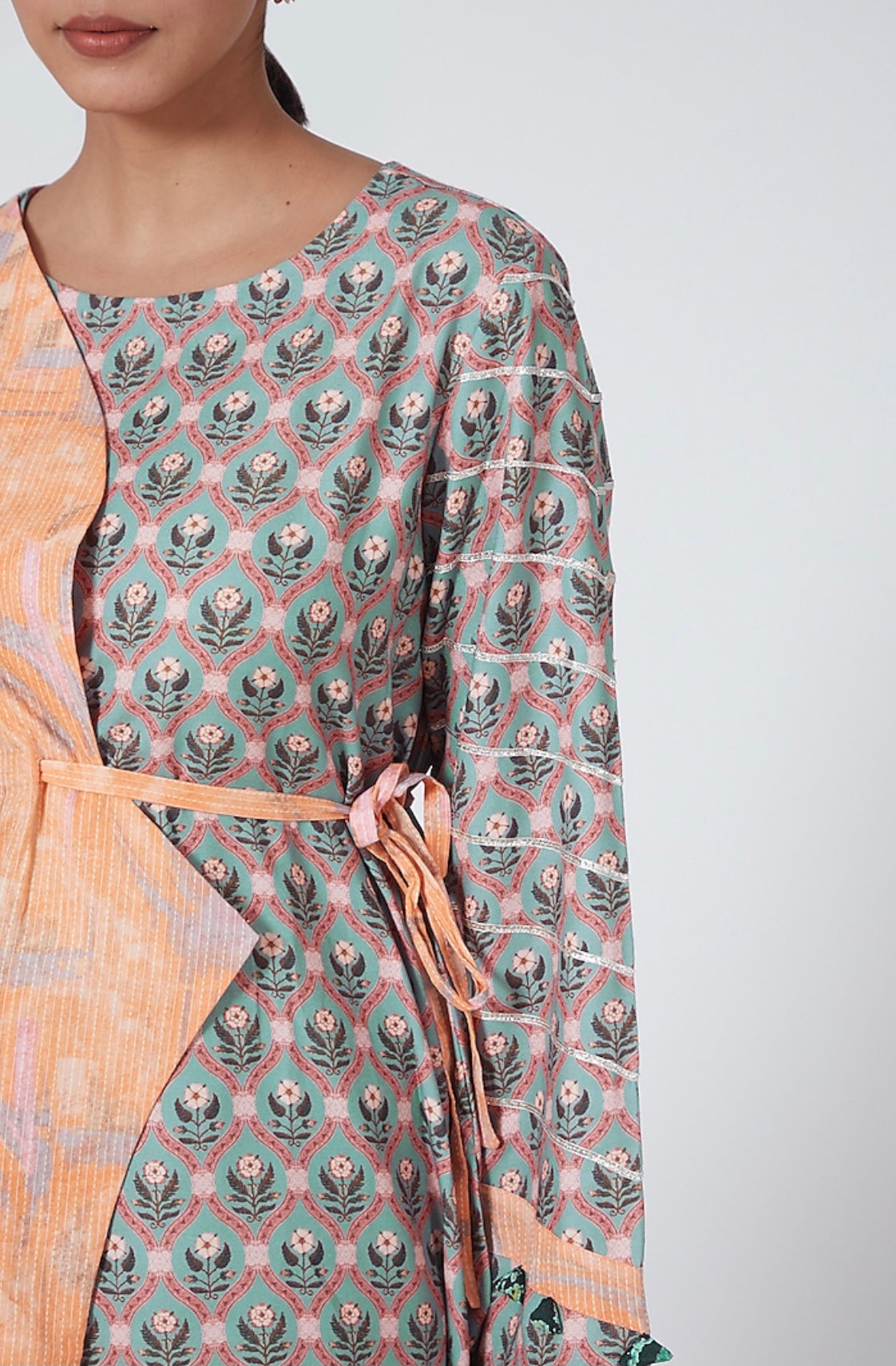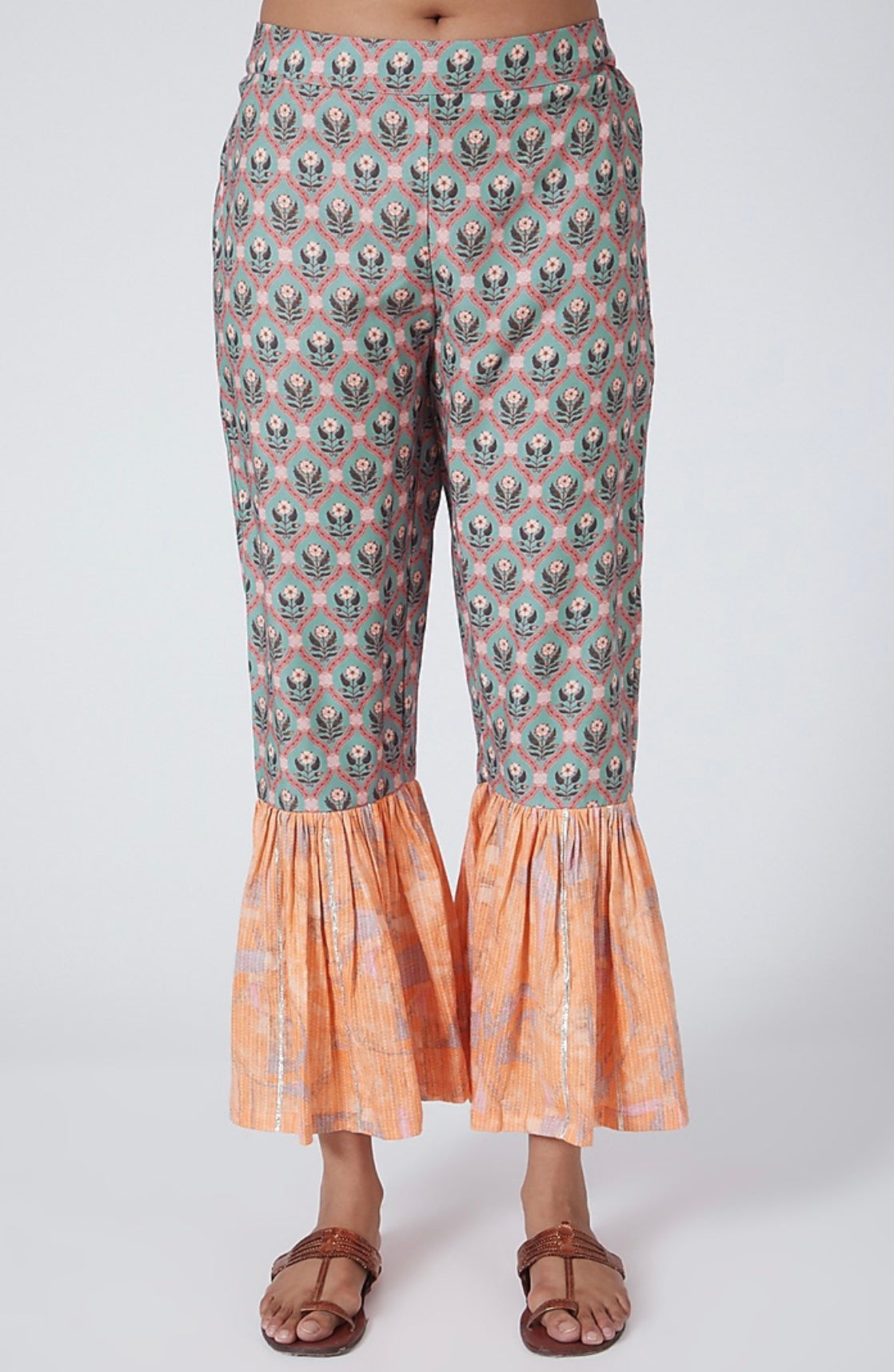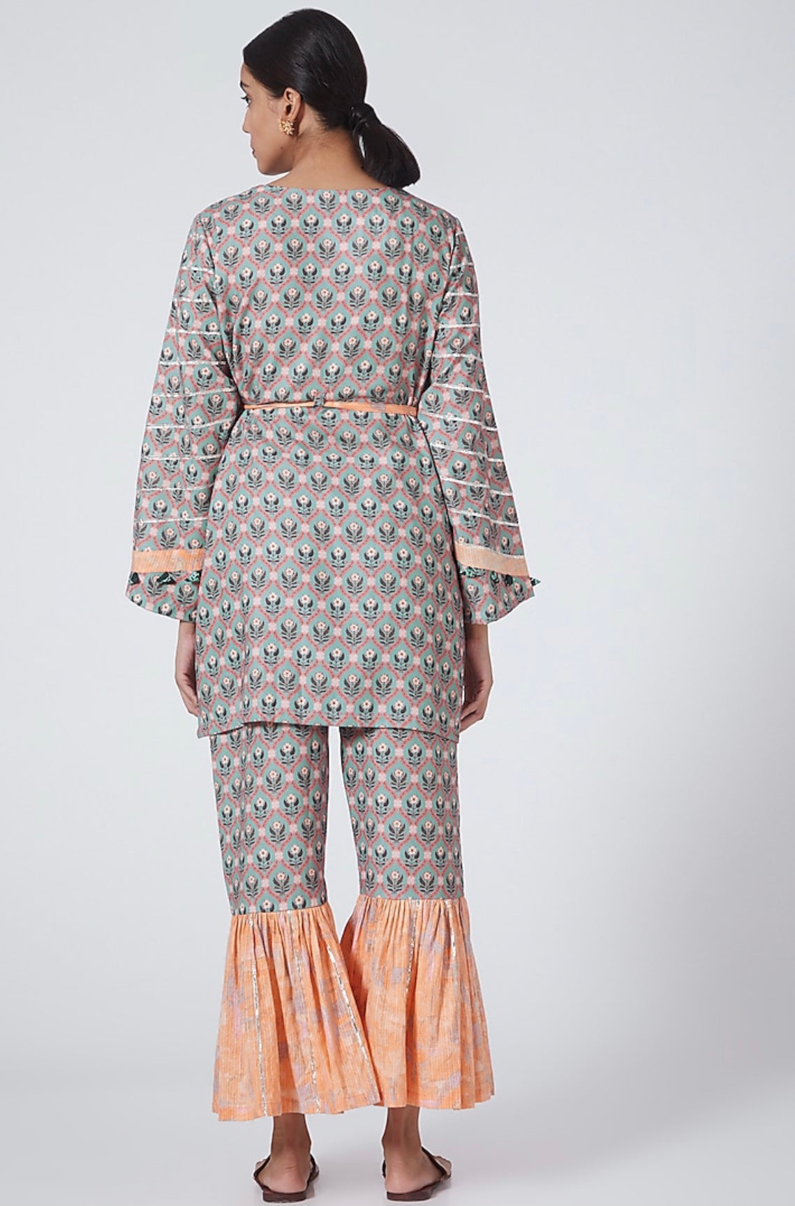 Short panelled relaxed fit kurta with sharara. Printed with lace detailing.
