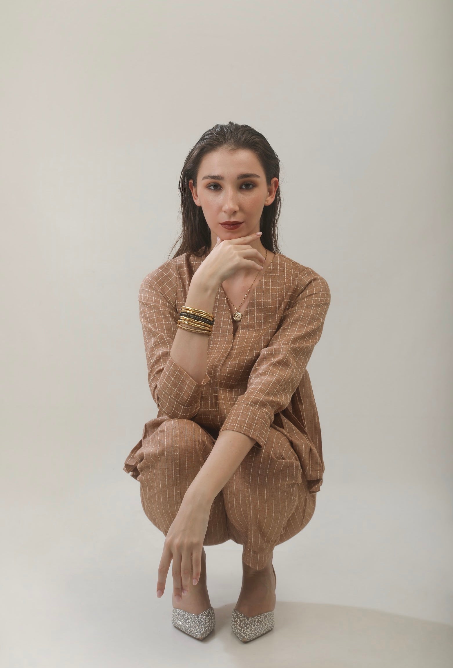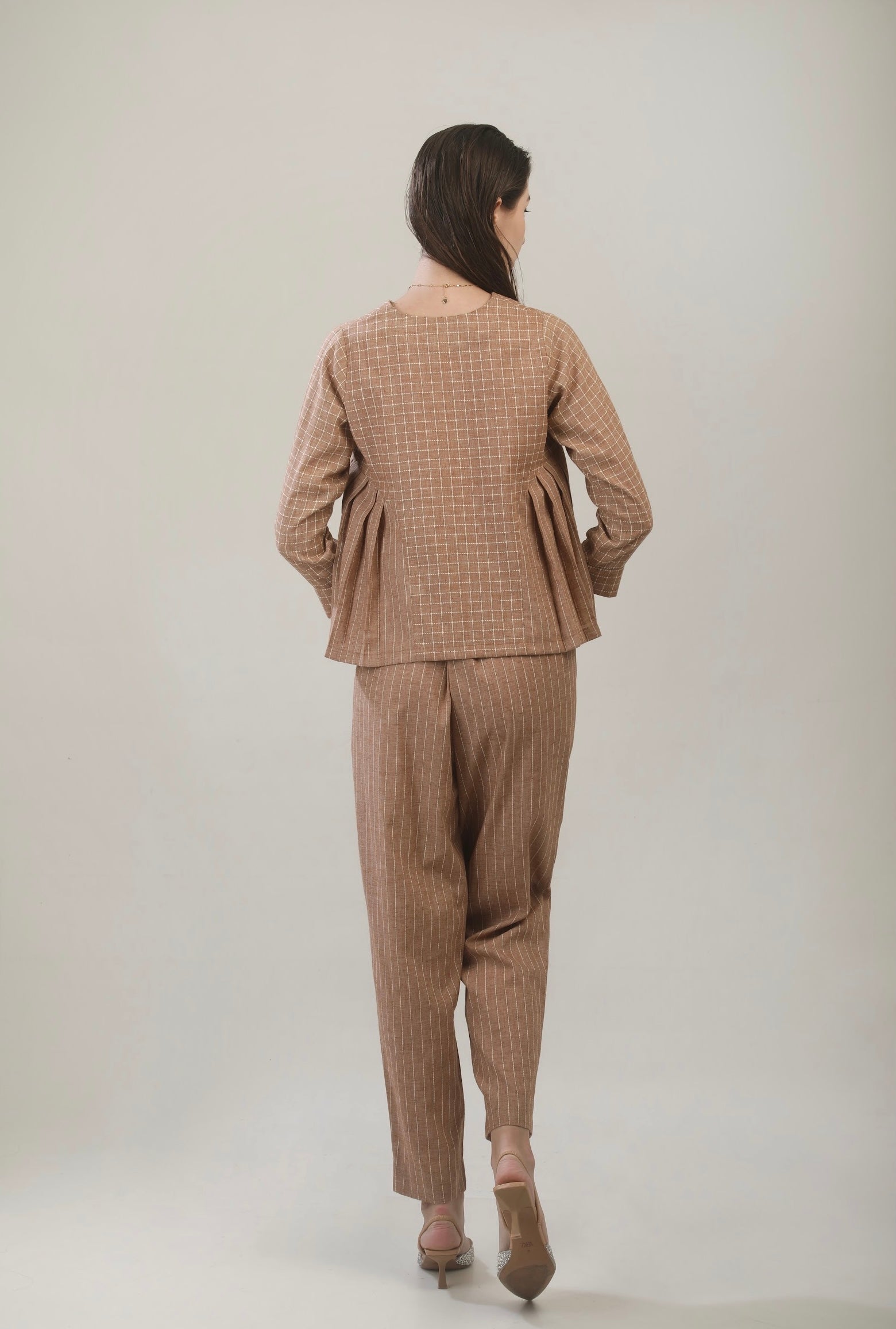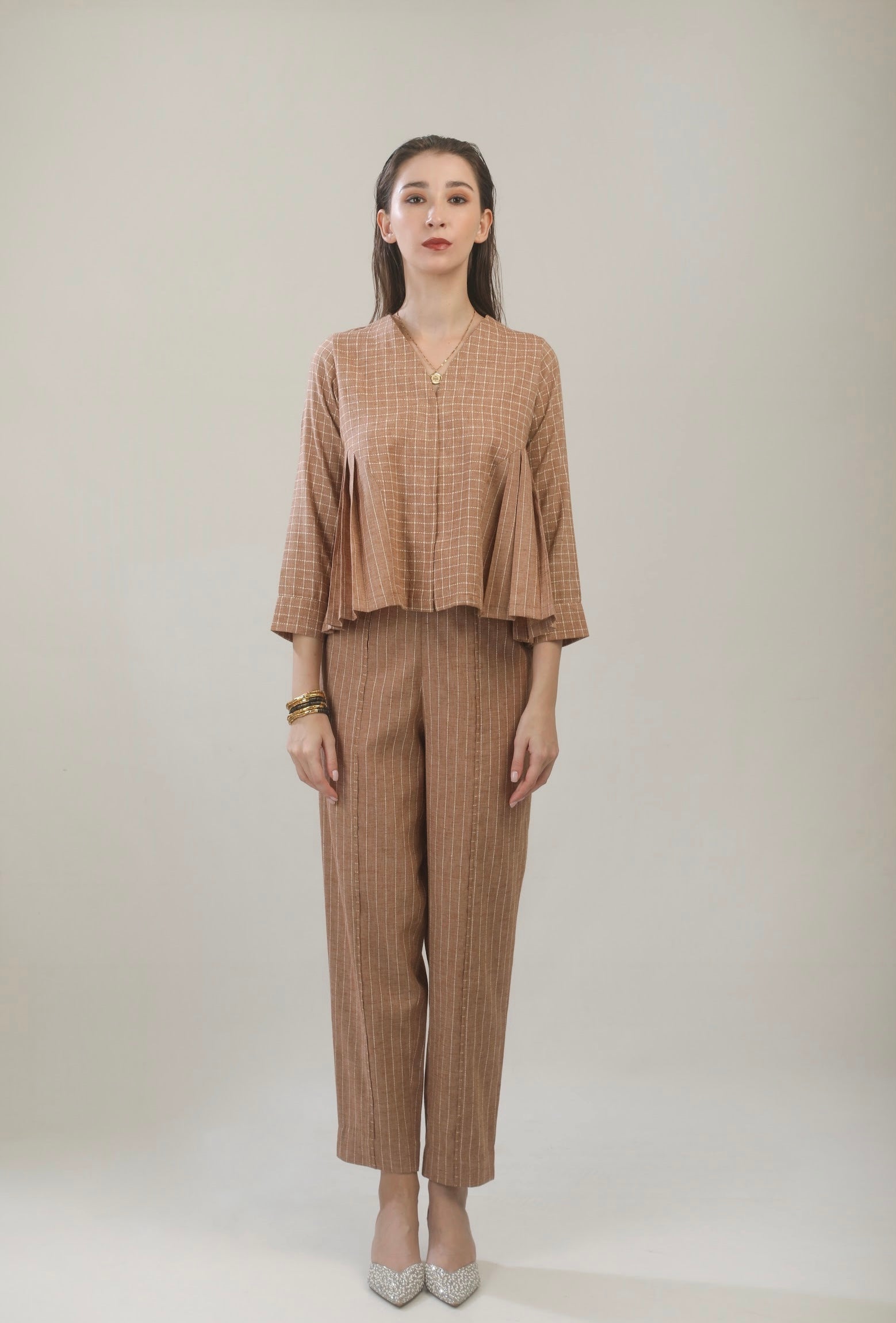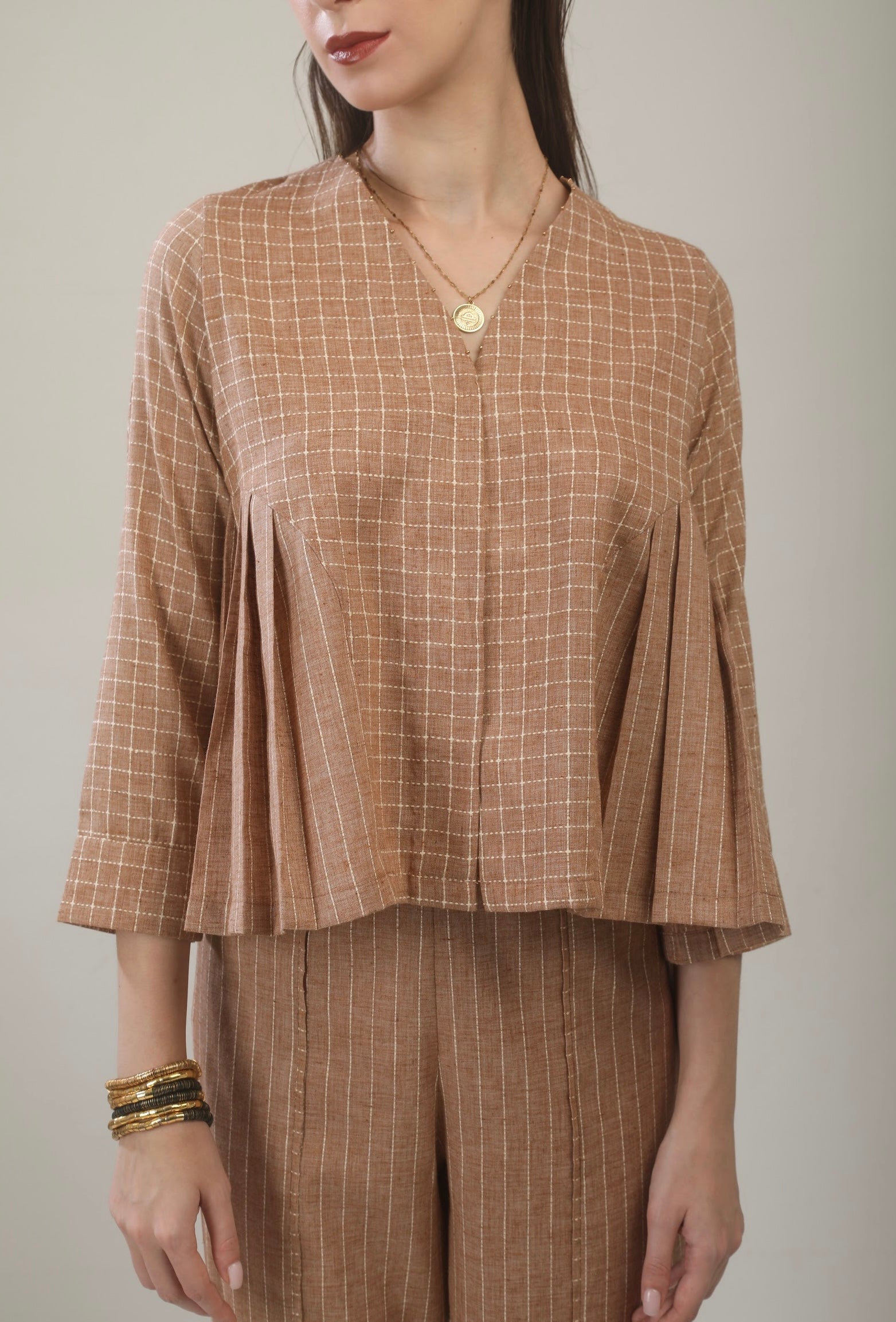 Top and pant set of two. The top has side pleat detailing on armhole and bead work on neckline. The pants are high waisted, and are slightly tapered. The outfit is relaxed fit and comfortable. Fabric used is soft cotton linen.