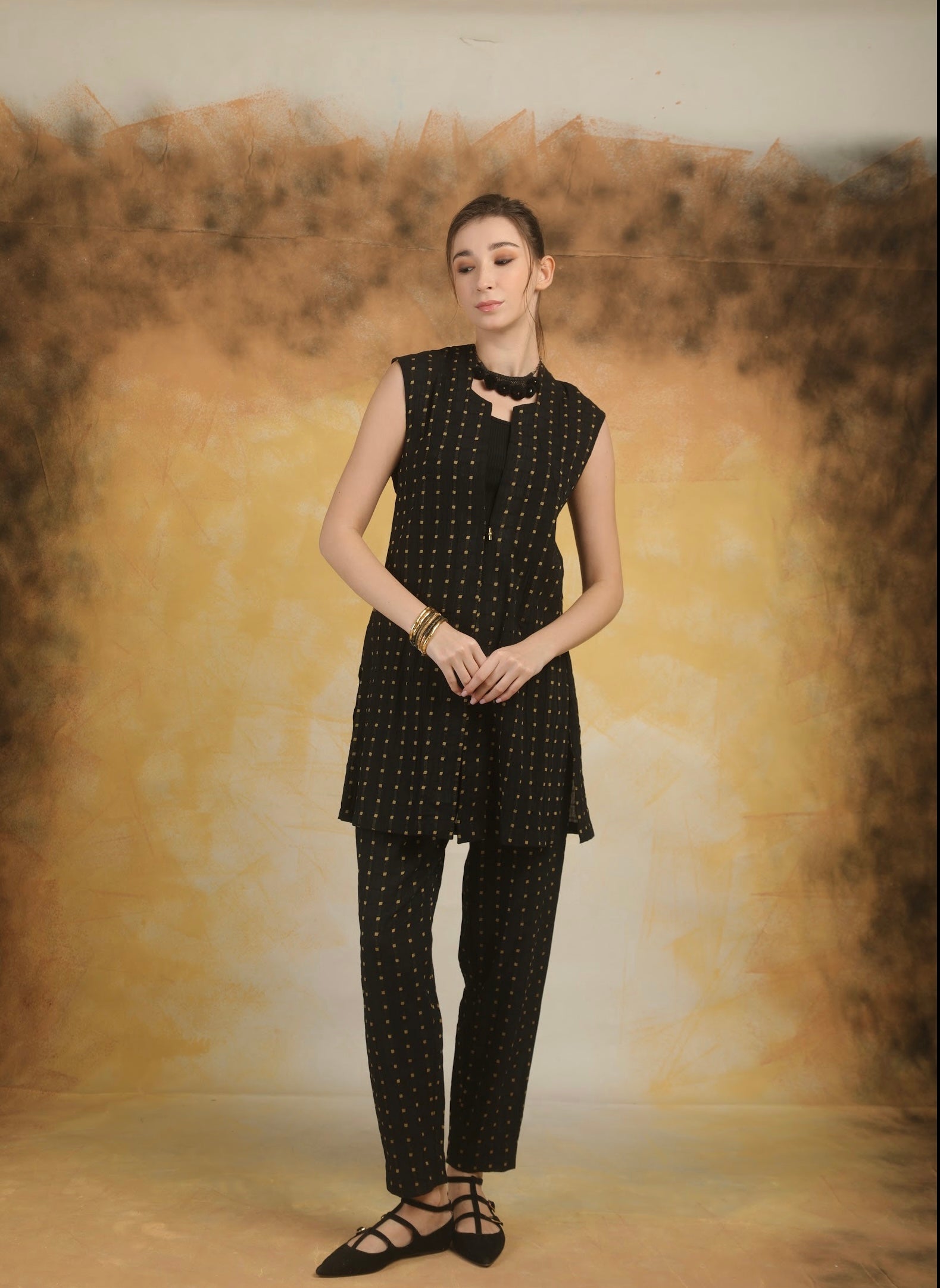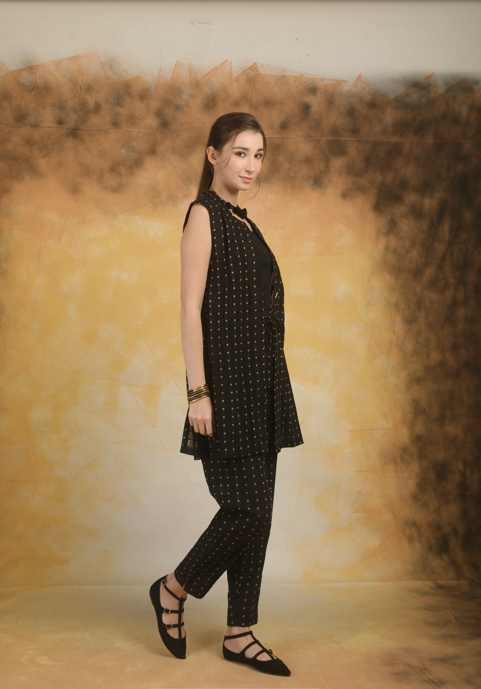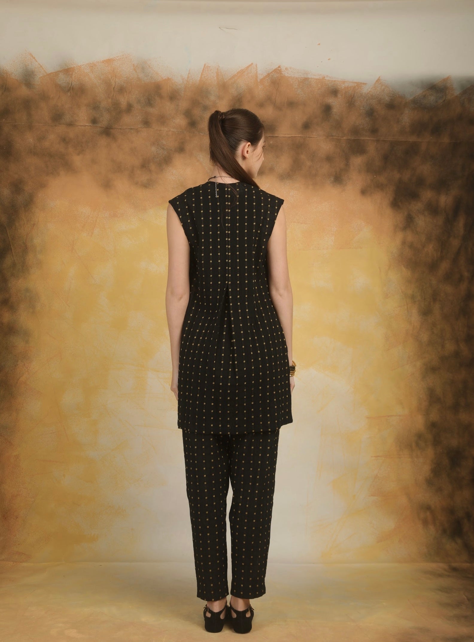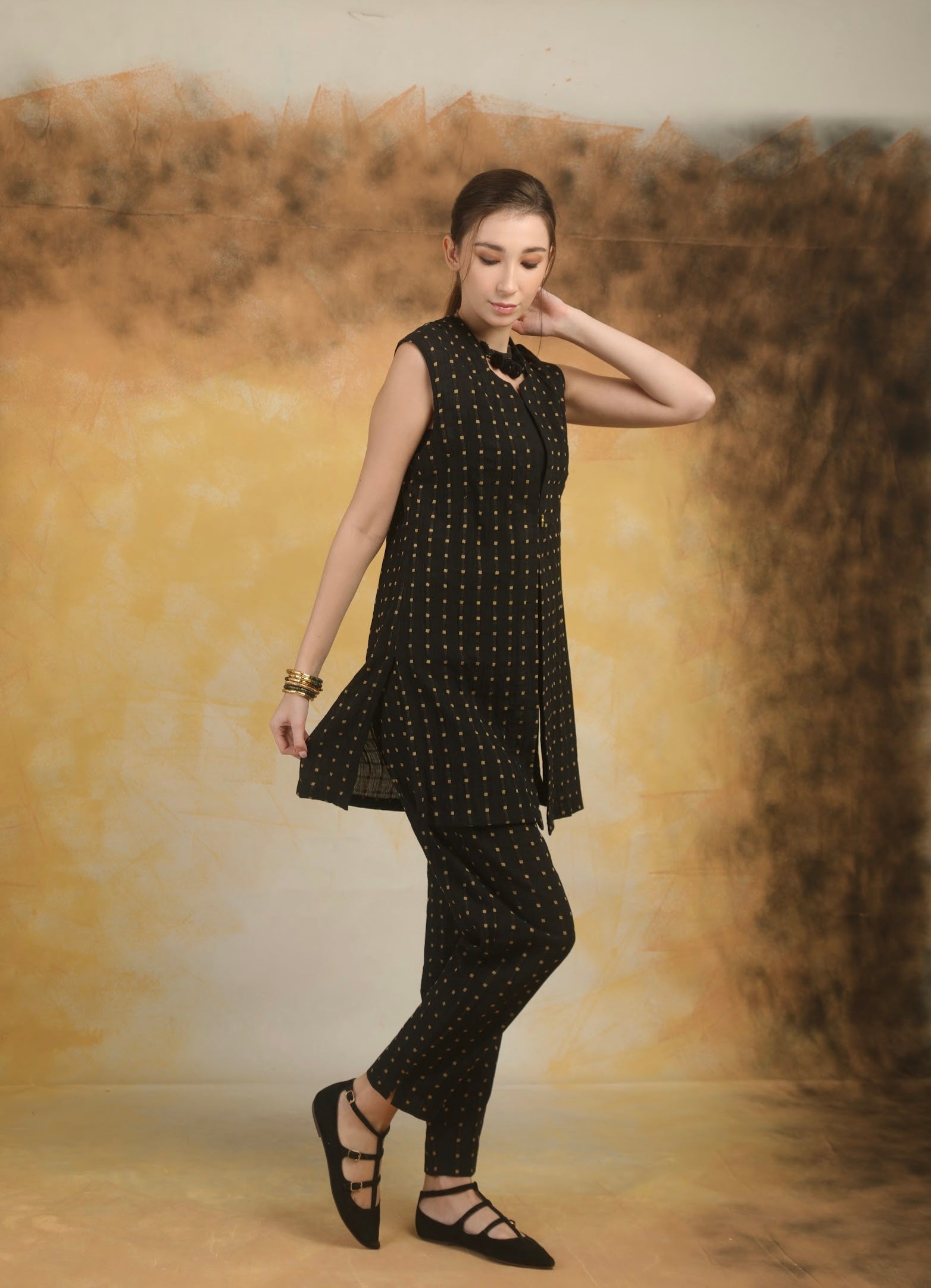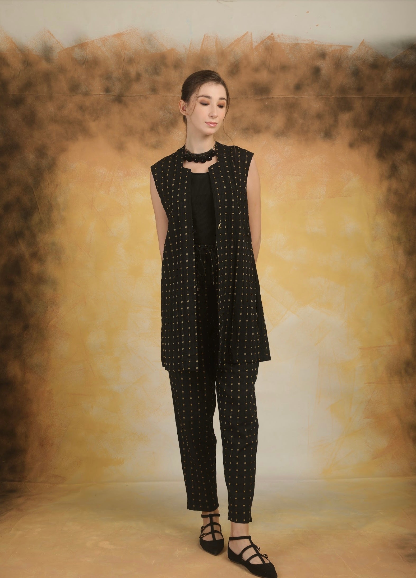 Jacket set of two - made of soft cotton fabric, with interesting neckline, and front golden button detail. Comes with slight tapered - relaxed fit pants, made of striped comfortable cotton fabric. The outfit is relaxed fit.