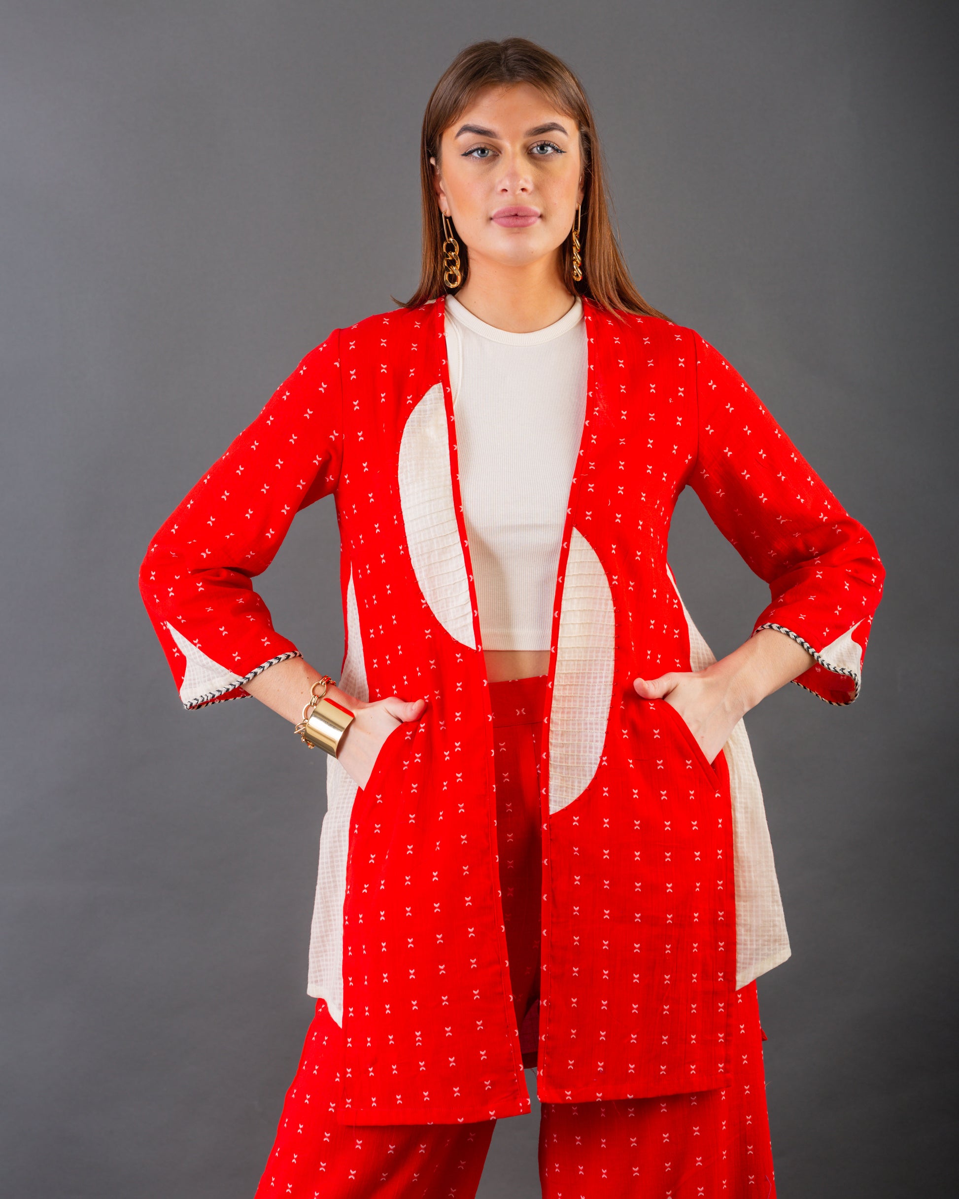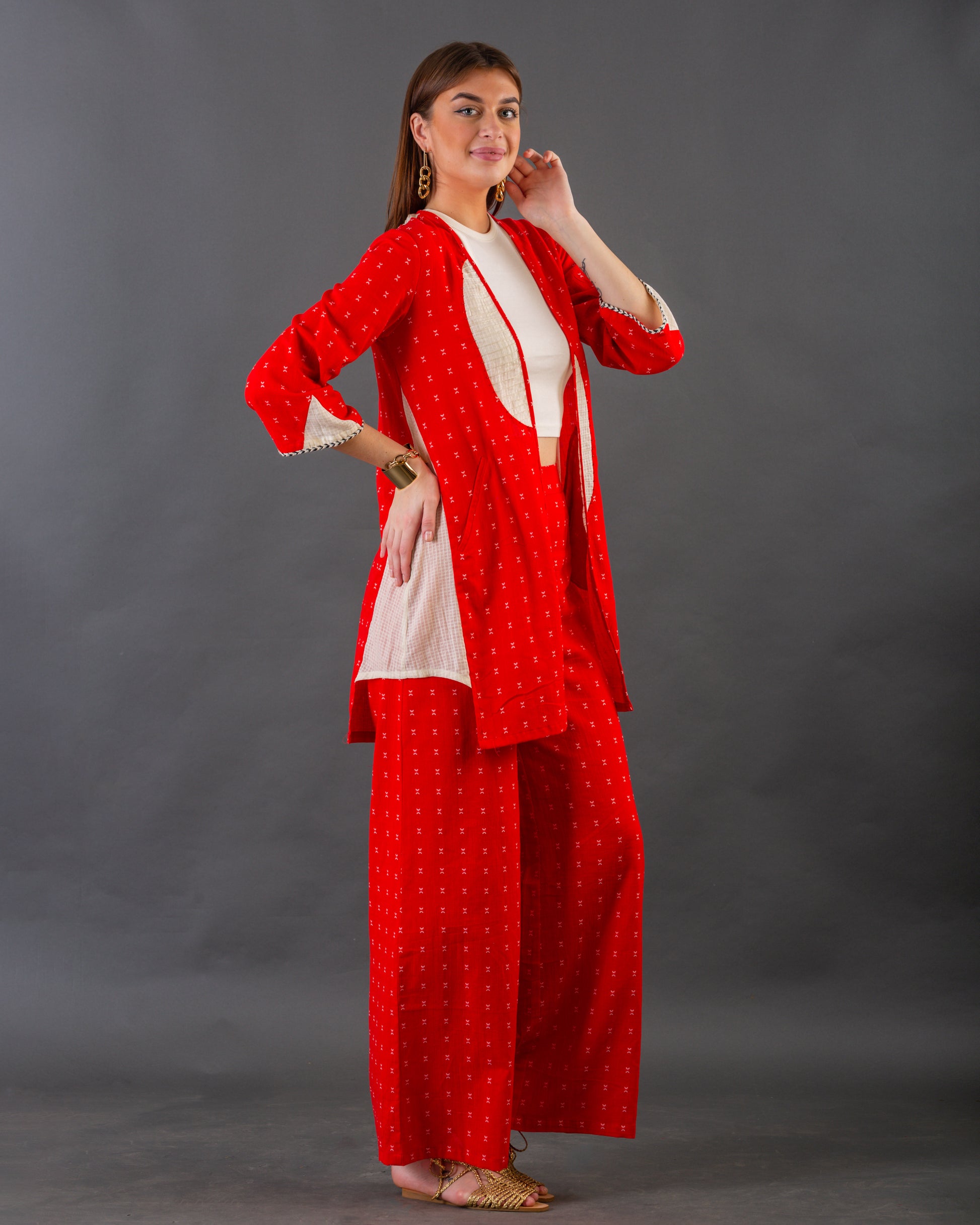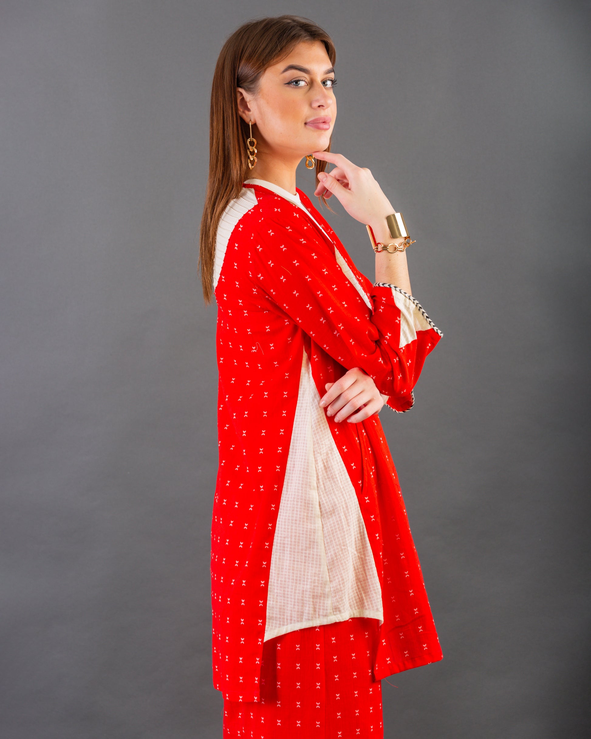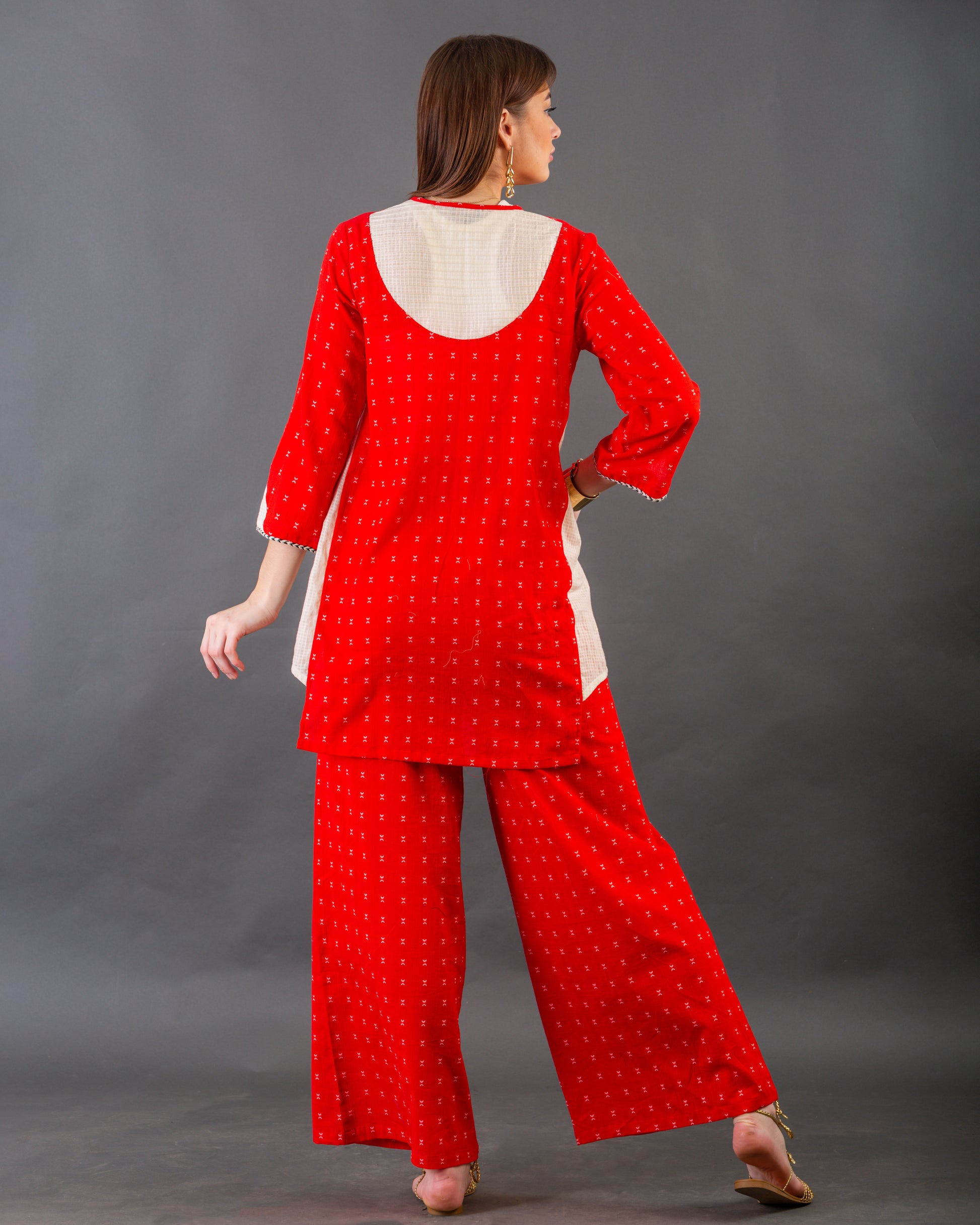 Set of two, jacket with different fabric panel detailing and also pintuck, lace and beads detailing. Jacket is relaxed fit with front pockets. Comes with slight flared pants, having elastic at back.