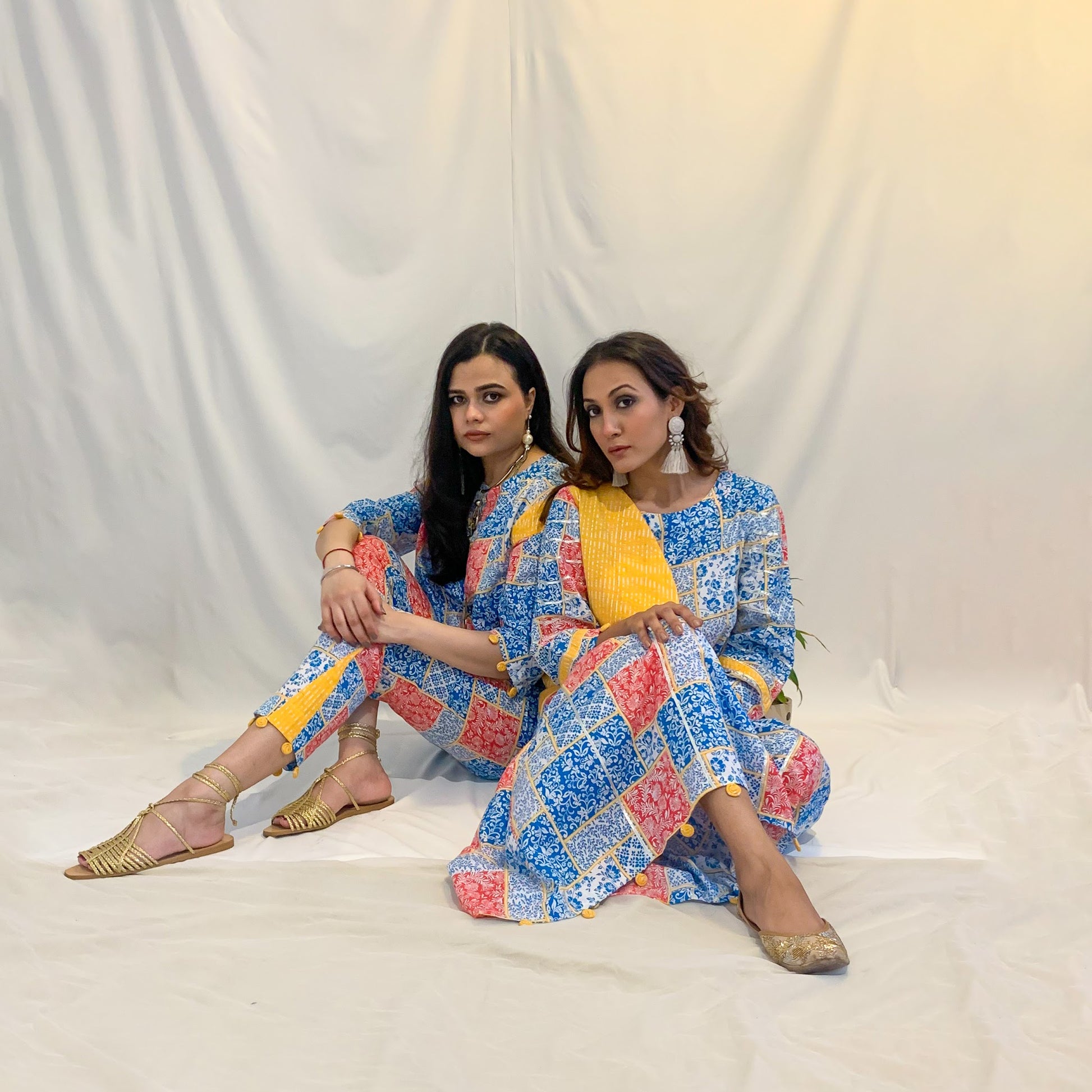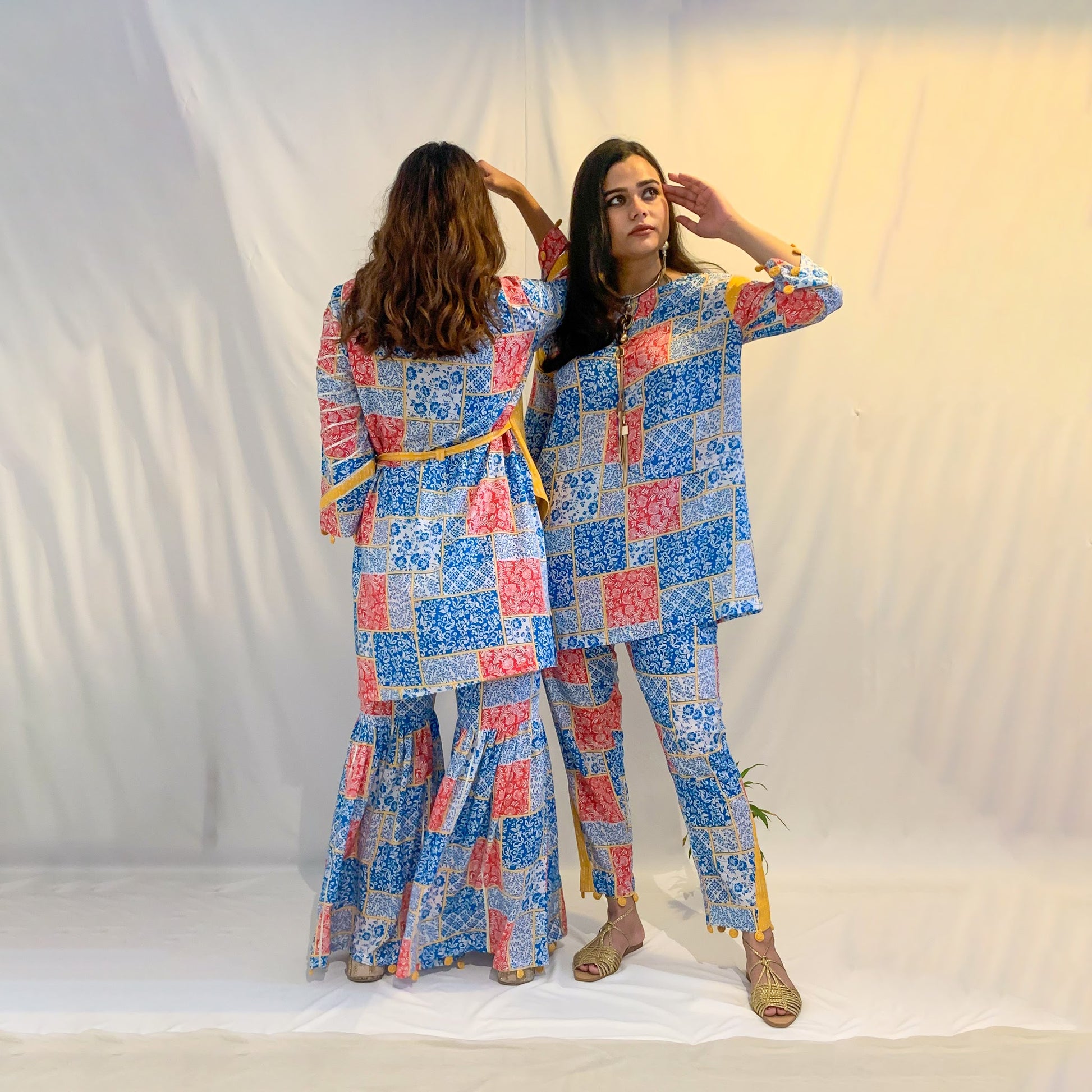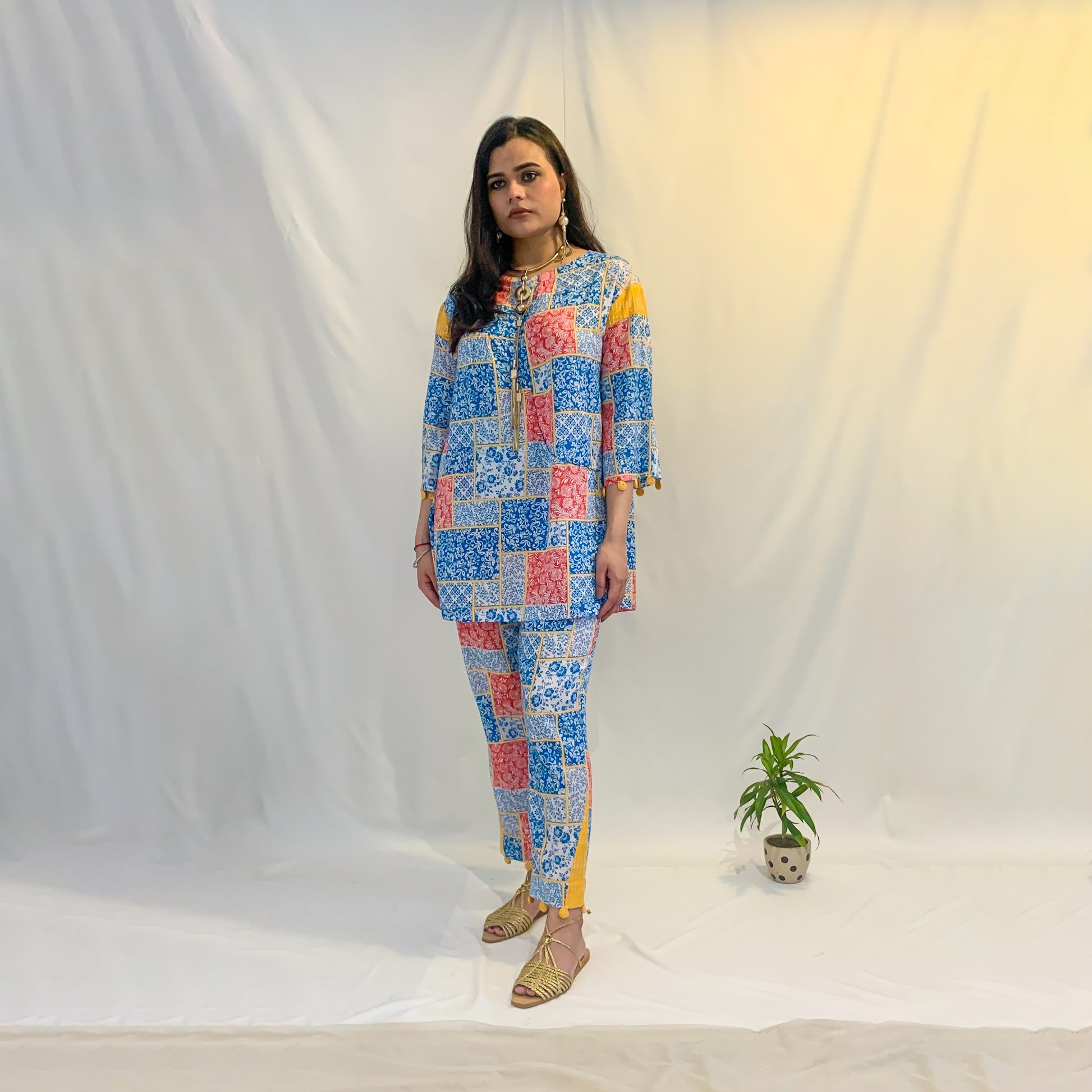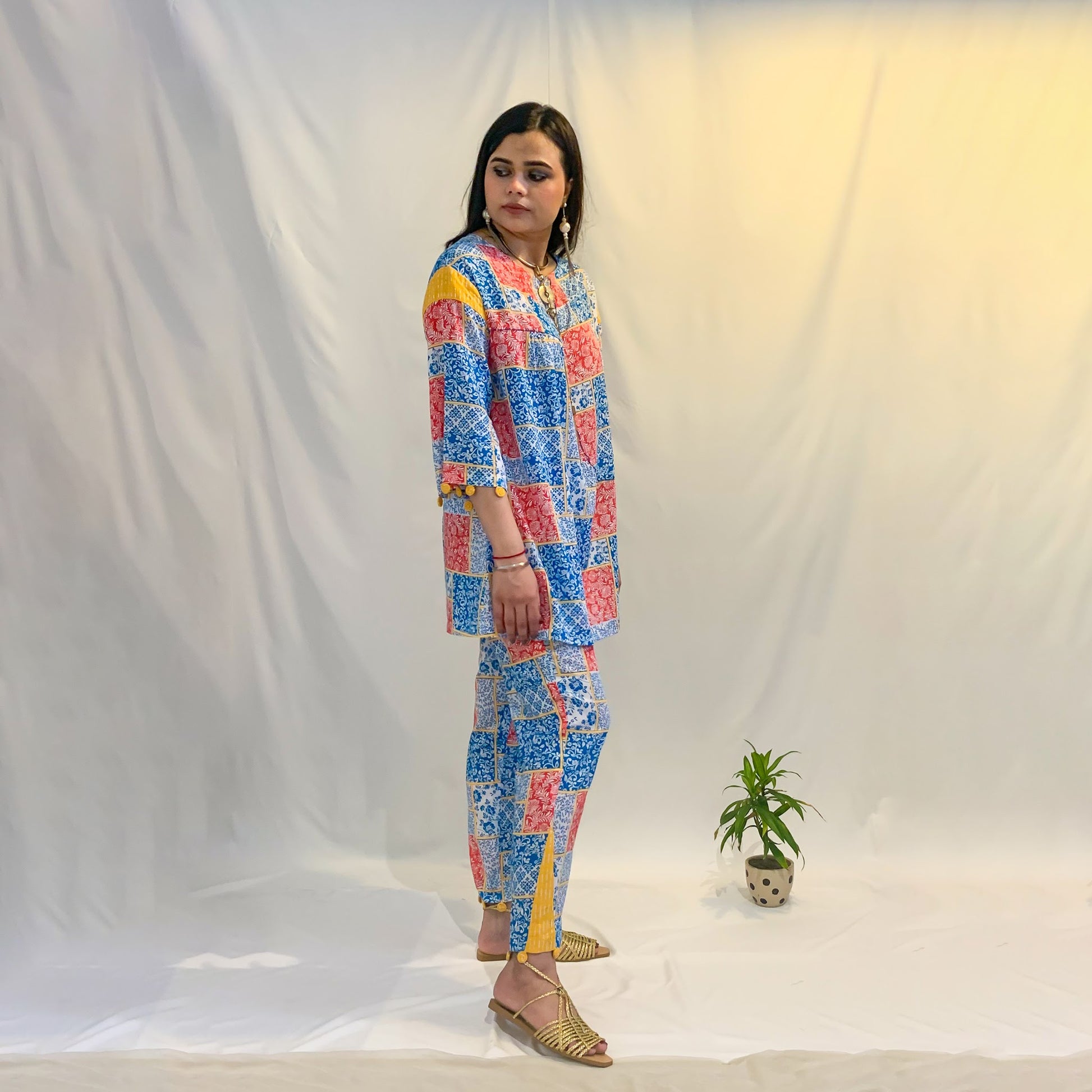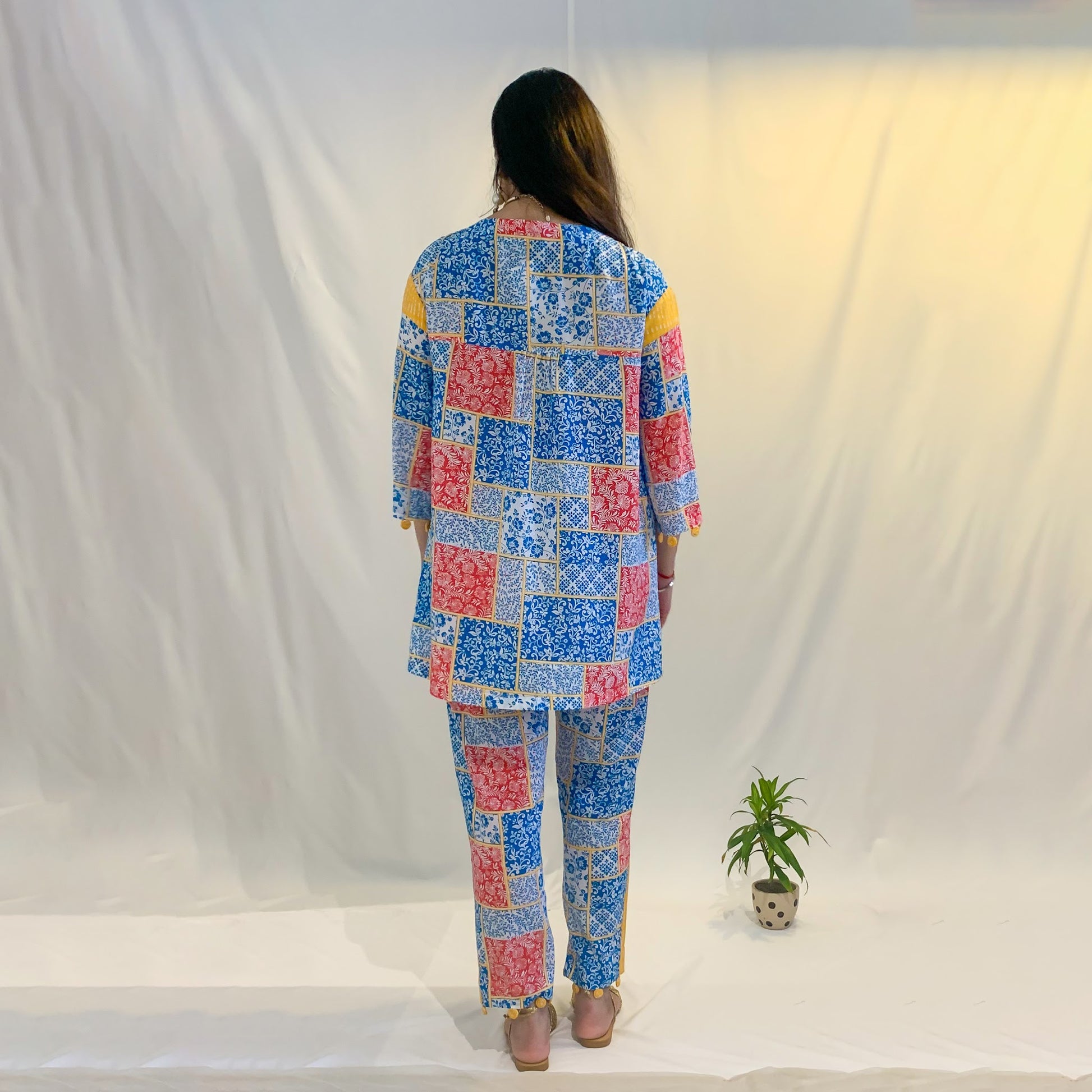 Multi coloured relaxed fit cord set. With interesting fabric manipulation technique on sleeve hem.