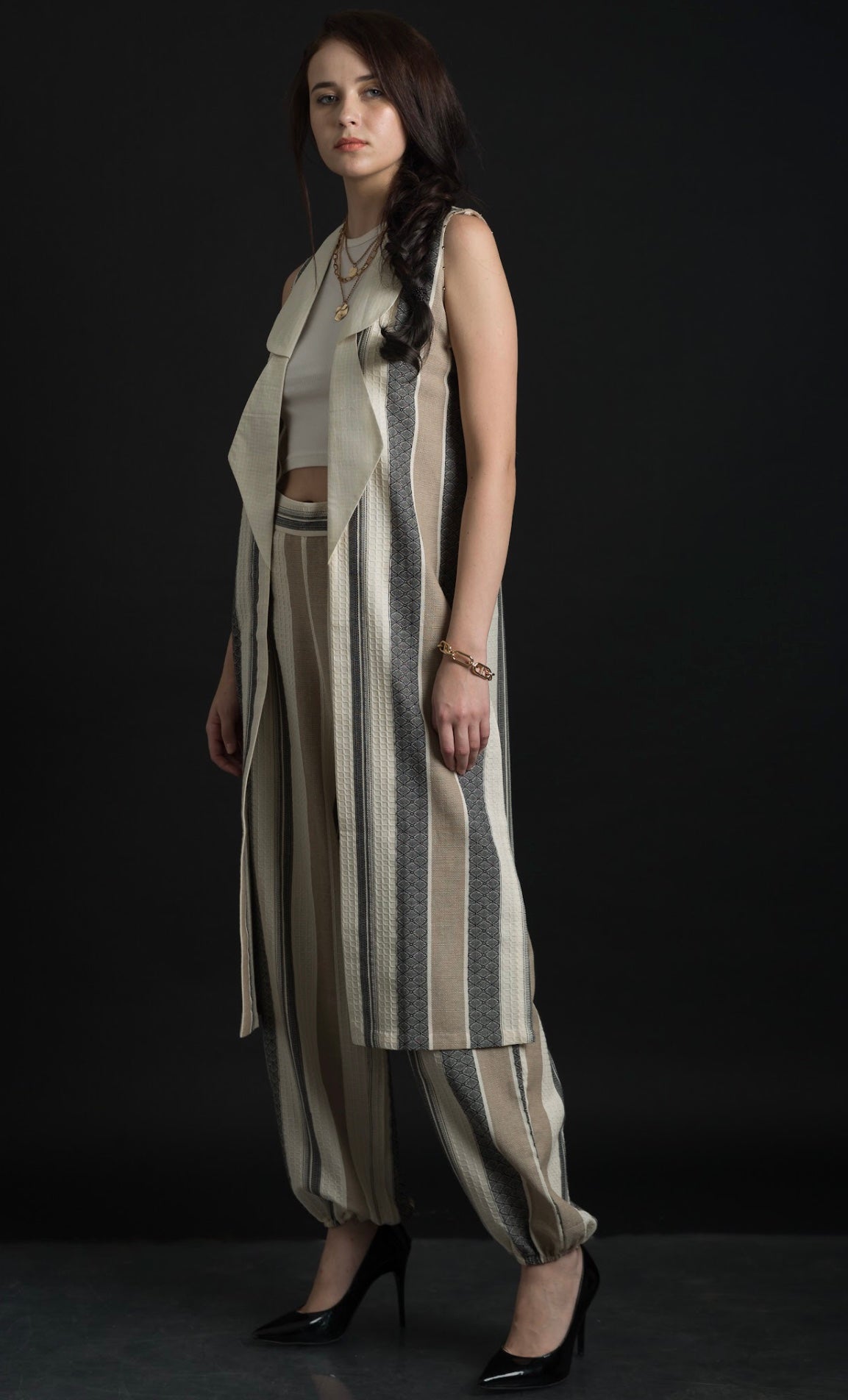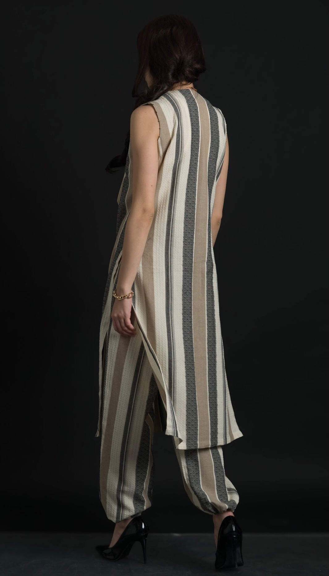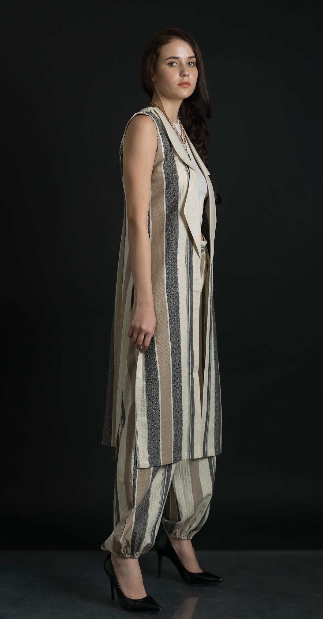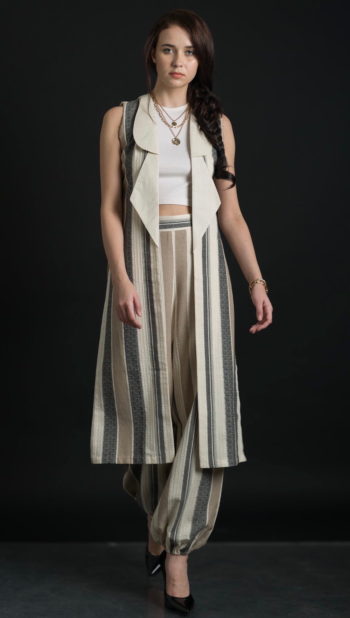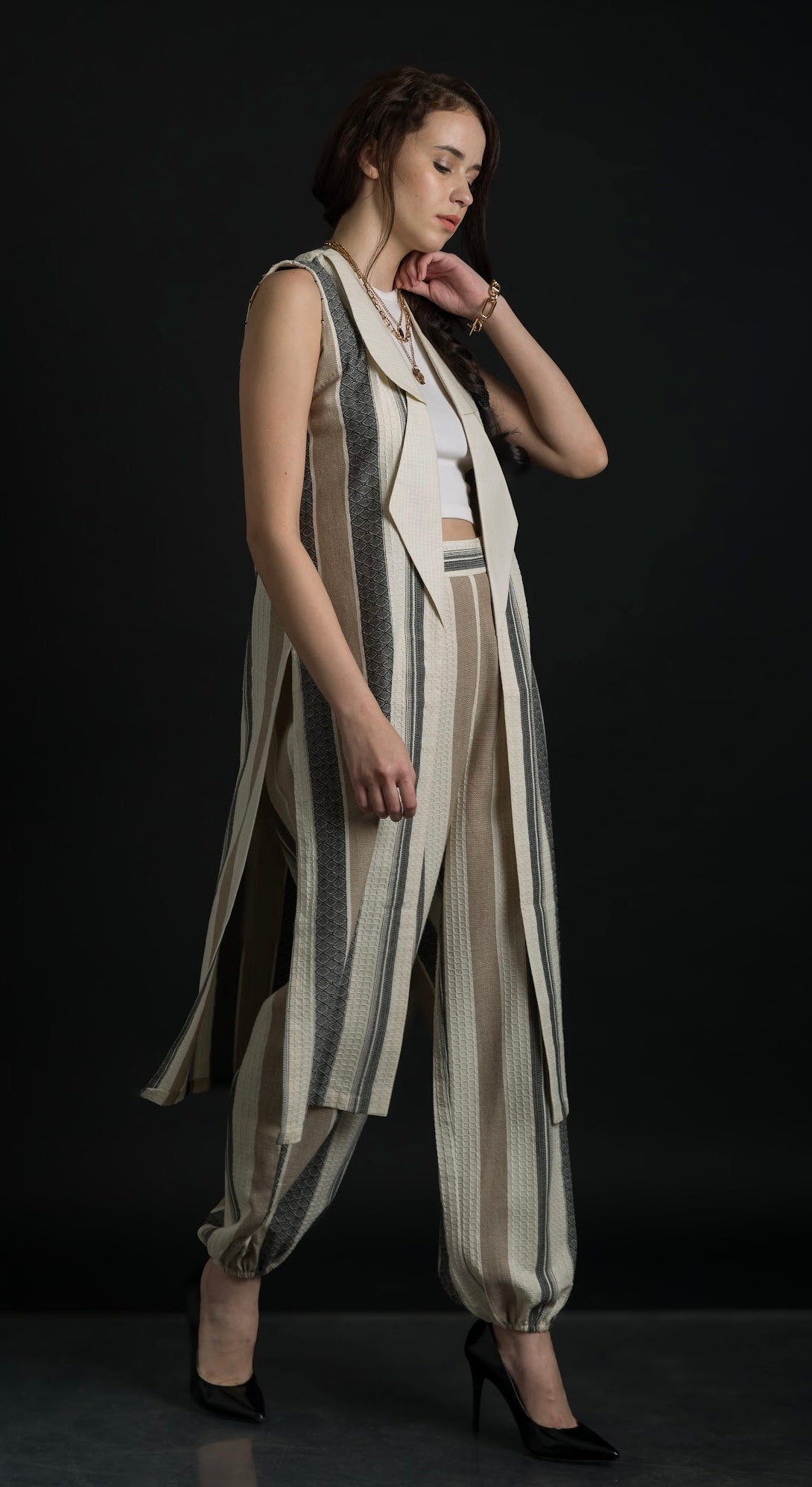 Long jacket in cotton jacquard, with bead detailing and front collar detailing. Comes with pants (with back elastic). Relaxed fit.