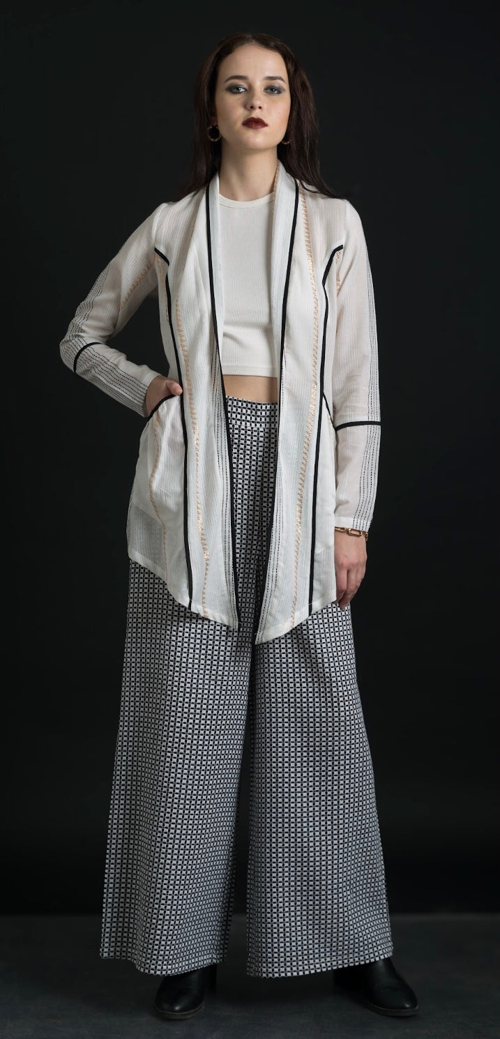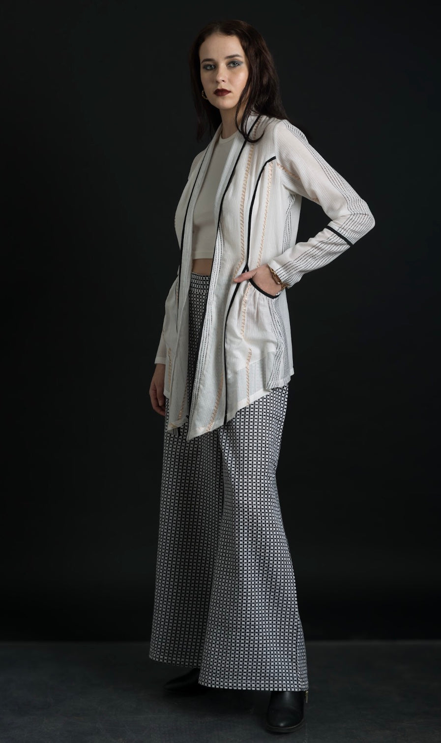 Cotton jacket with pockets. Piping and bead detailing can be seen throughout the design. Relaxed fit. Comes with slight flared pants (elastic on back belt).