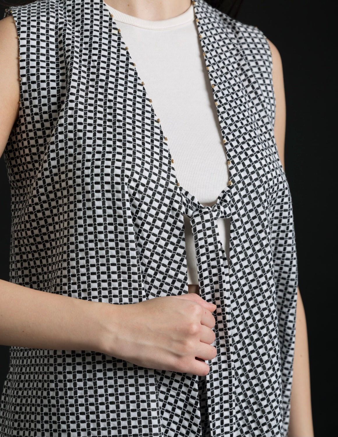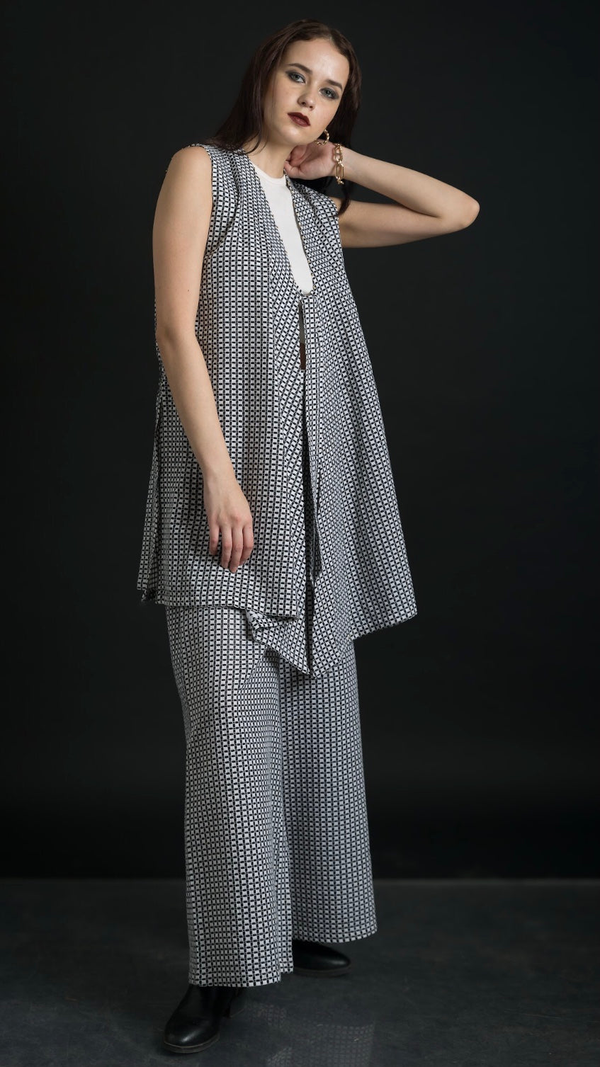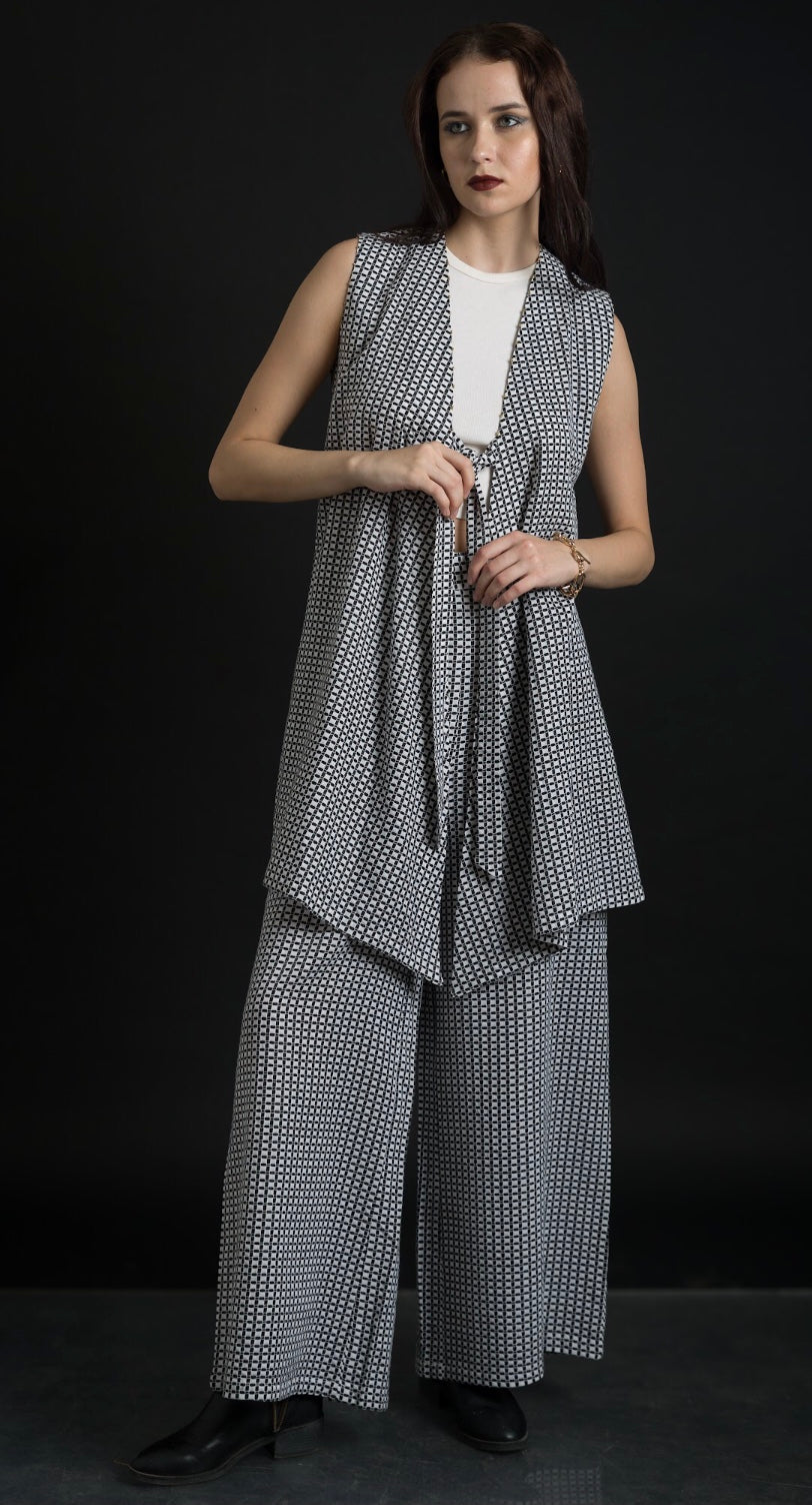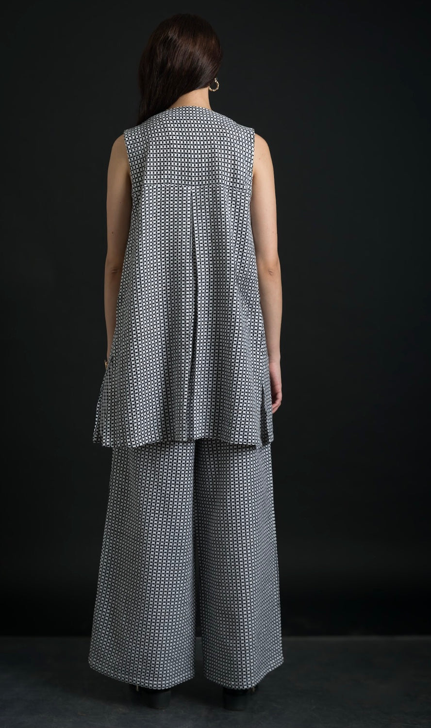 Front tie up and bead work detailing. Comfortable cotton jacquard fabric. Comes with slight flared pants (elastic on back waist). Relaxed fit.