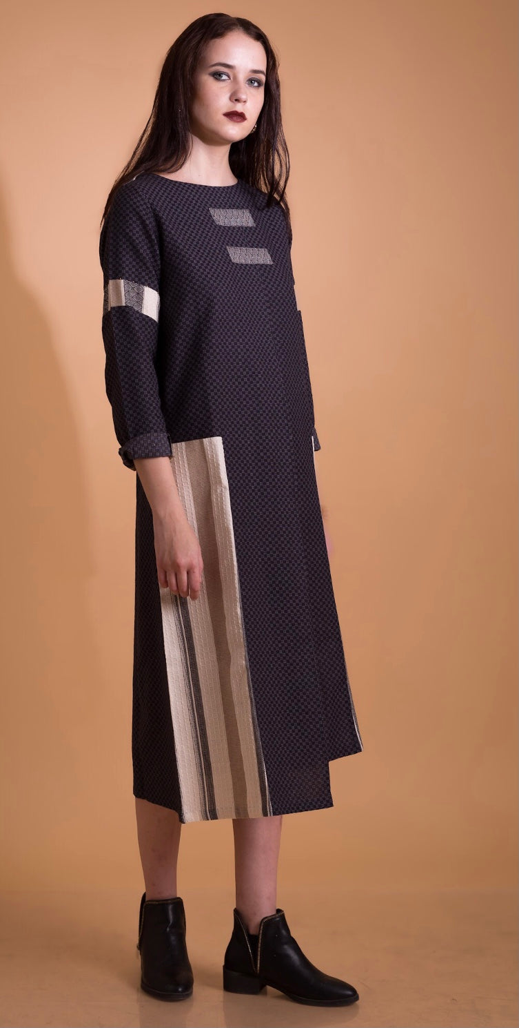 Panelled dress in relaxed fit. Made of cotton jaquard, with golden bead detailing. Relaxed fit. Can also be paired with pants.