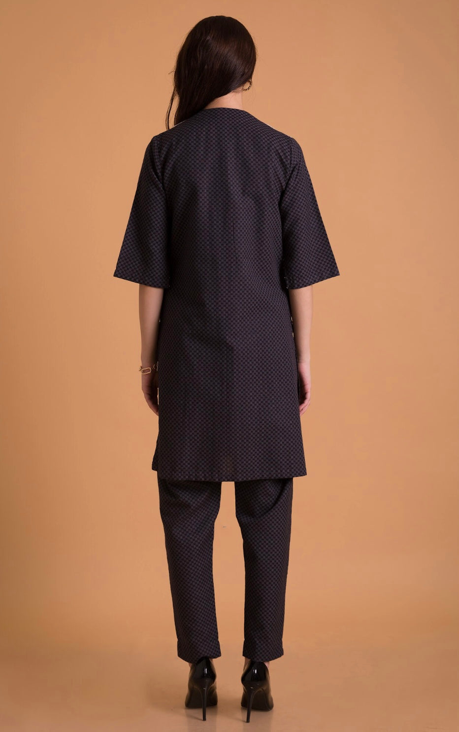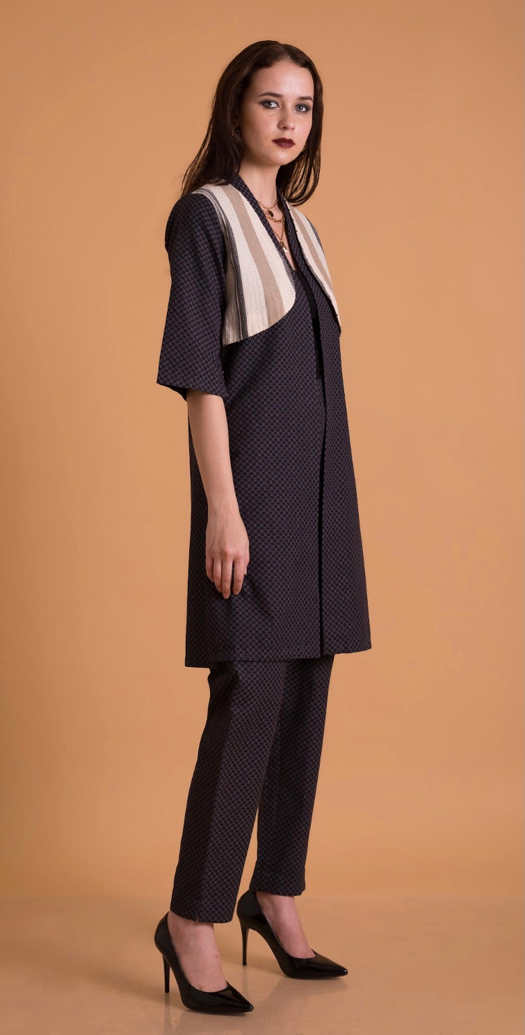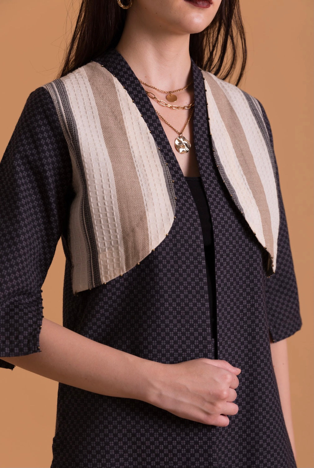 Front open jacket with panels on shoulder, and gold beadwork. Relaxed fit. Side slits.