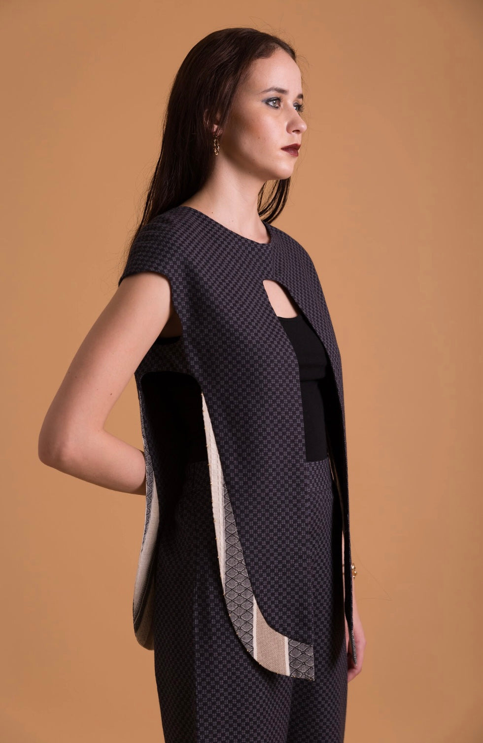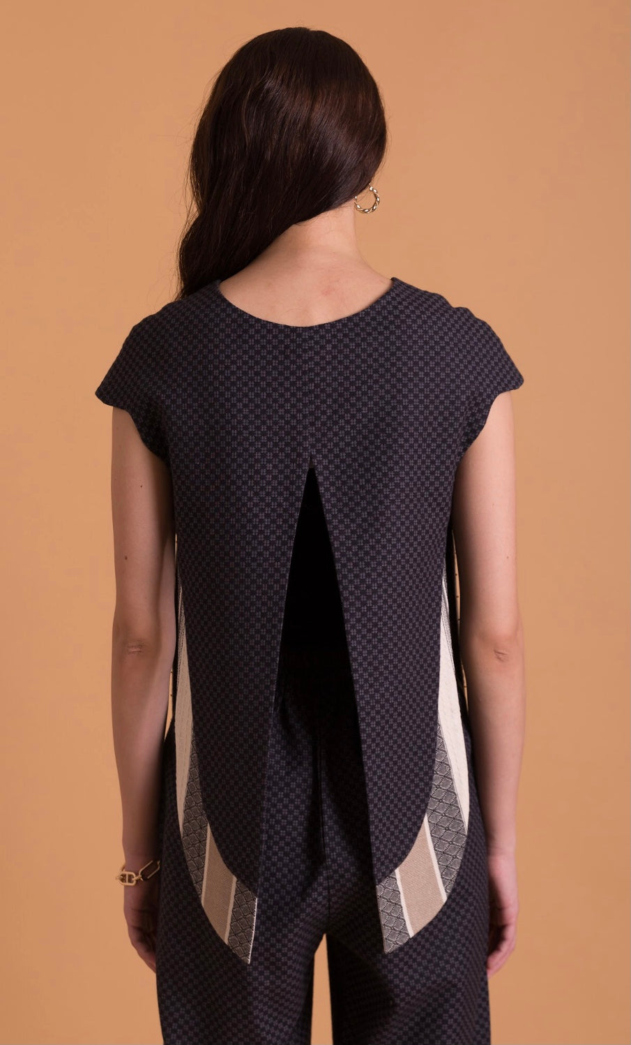 Dropped sleeve, experimental cut top, with under layer top. Shaped hem and open sides. Relaxed fit.