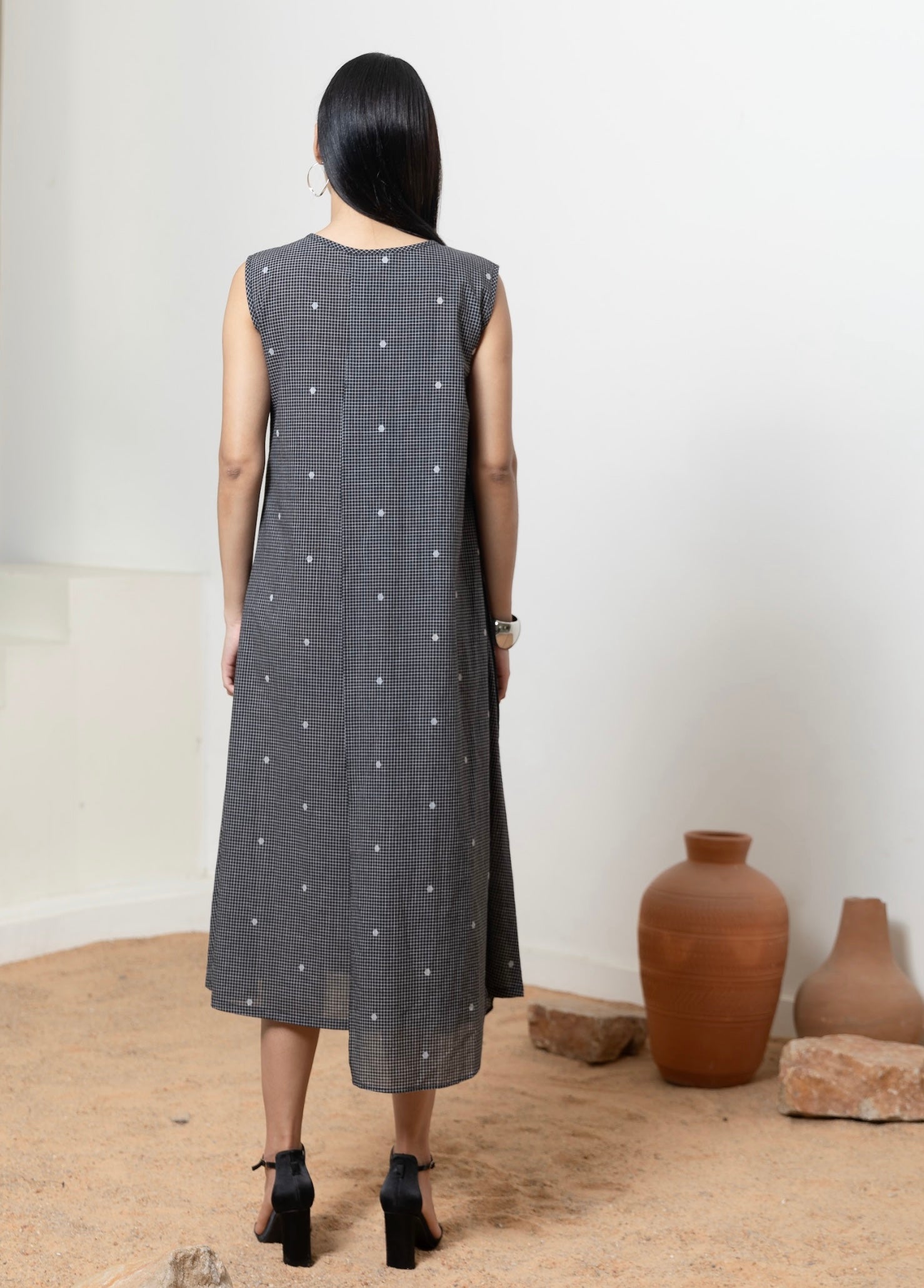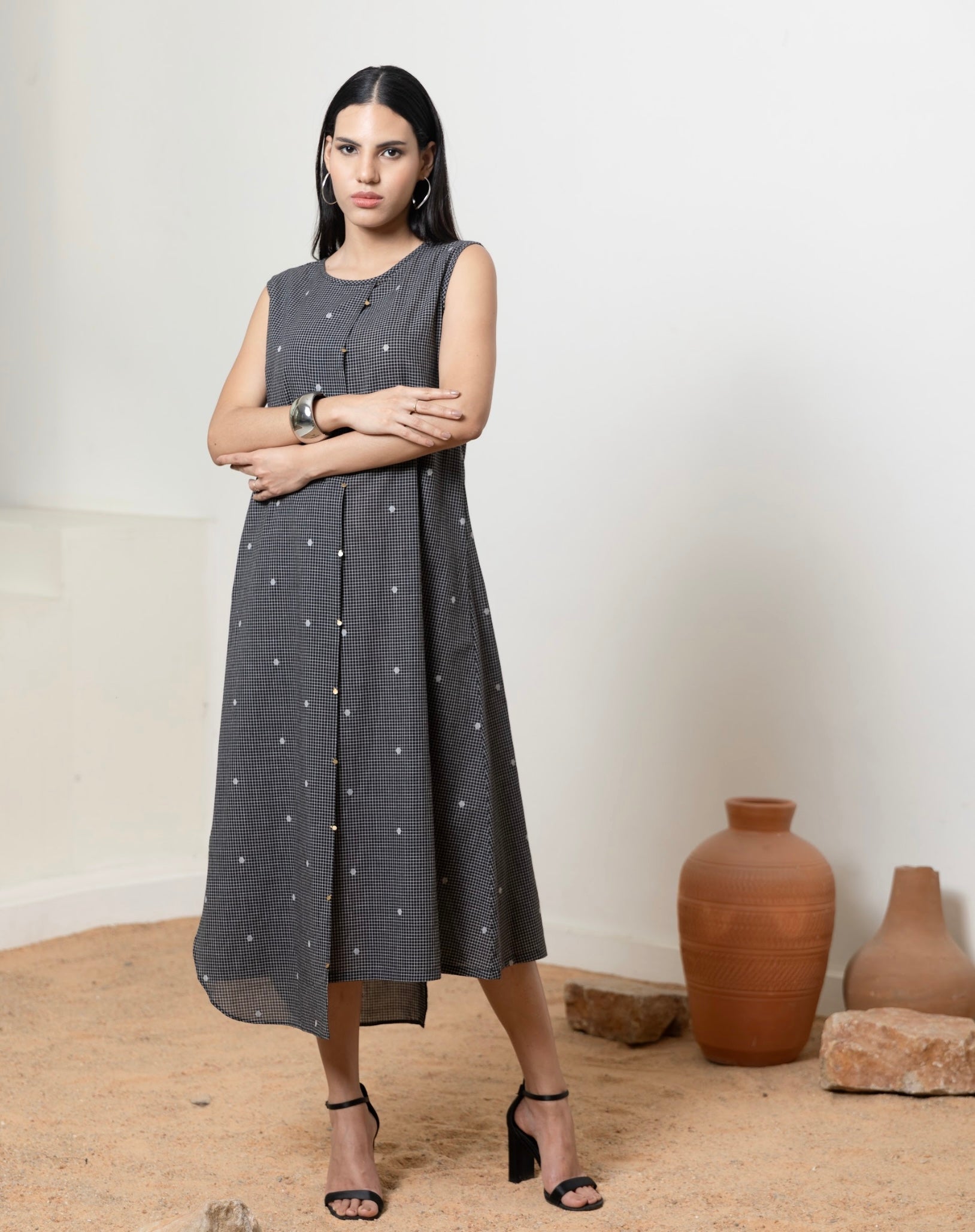 Dress with asymmetric hem, in cotton fabric with beautiful bead detailing. Front bead detailing, relaxed fit.