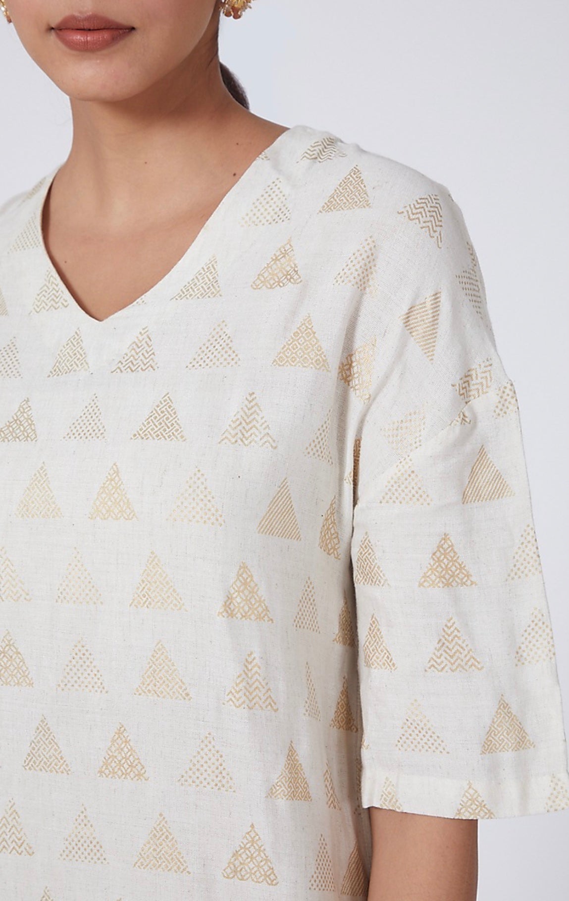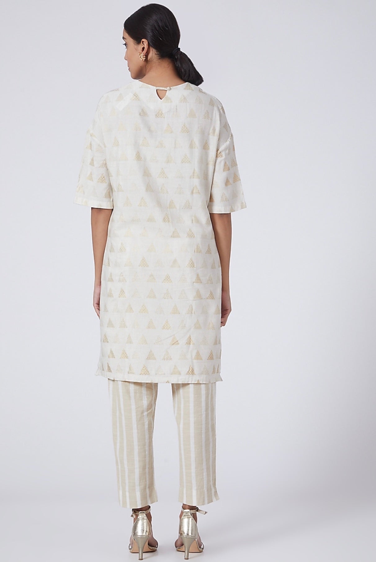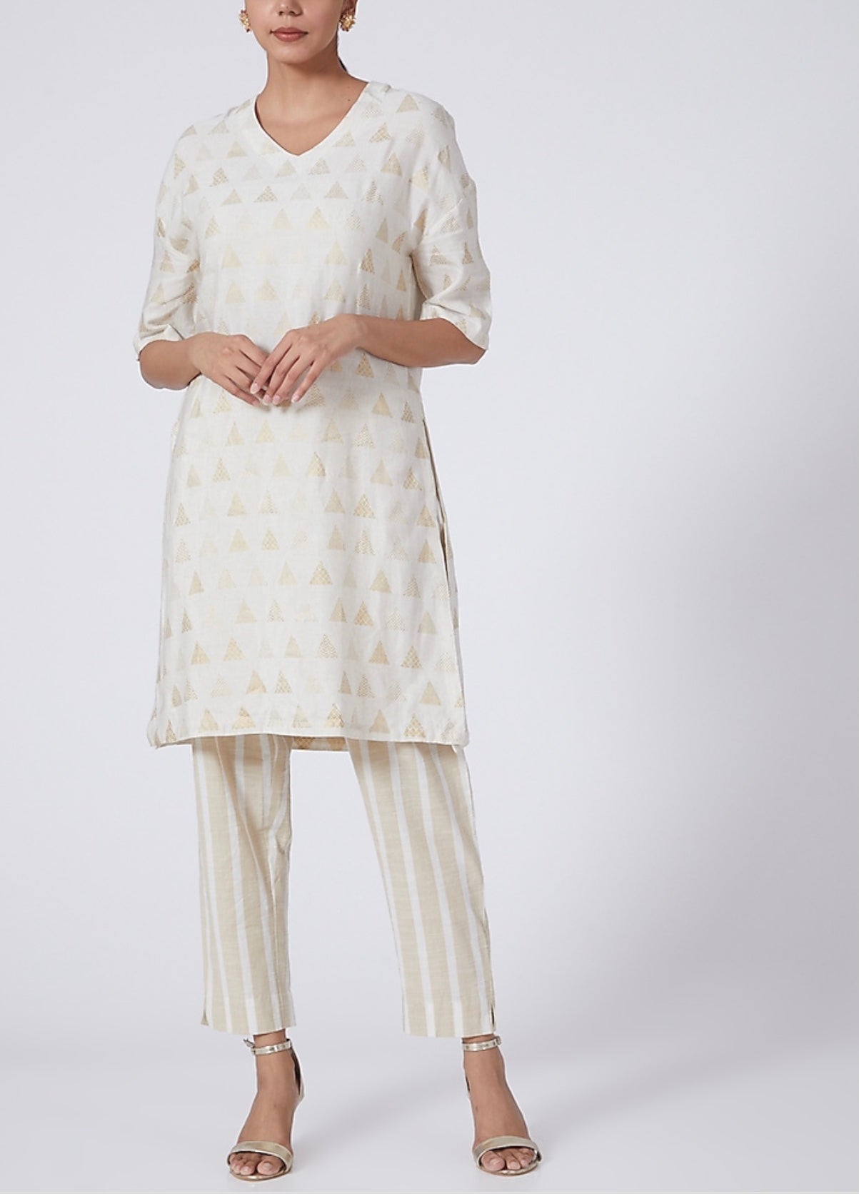 Relaxed fit suit, with dropped shoulder Kurta and tapered pants. Cotton fabric with geometric print.