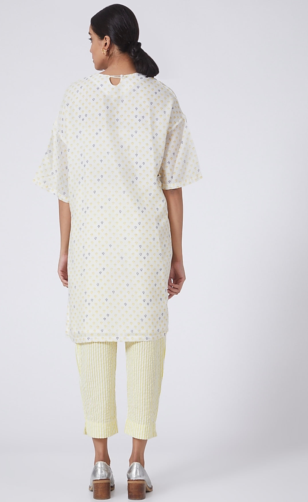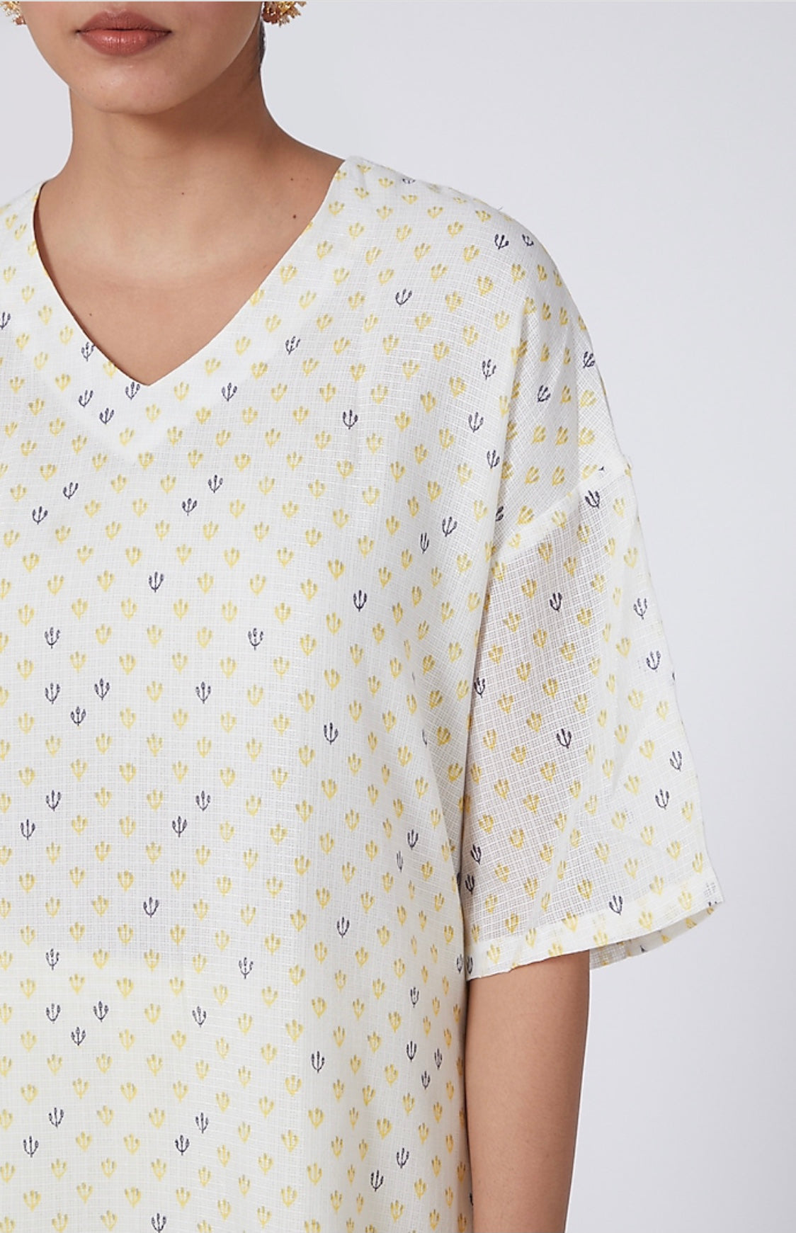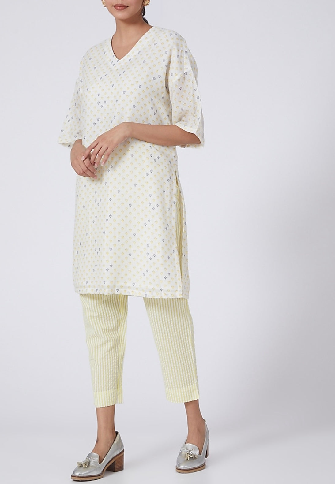 Relaxed fit suit, with dropped shoulder Kurta and tapered pants. Cotton fabric with print.