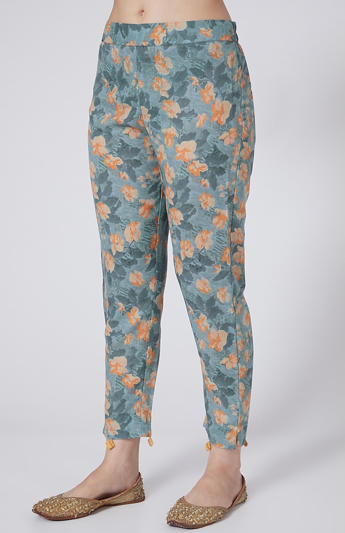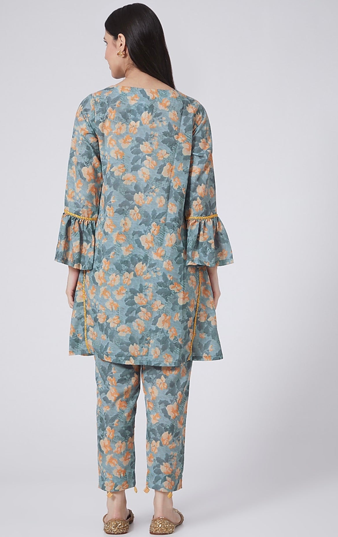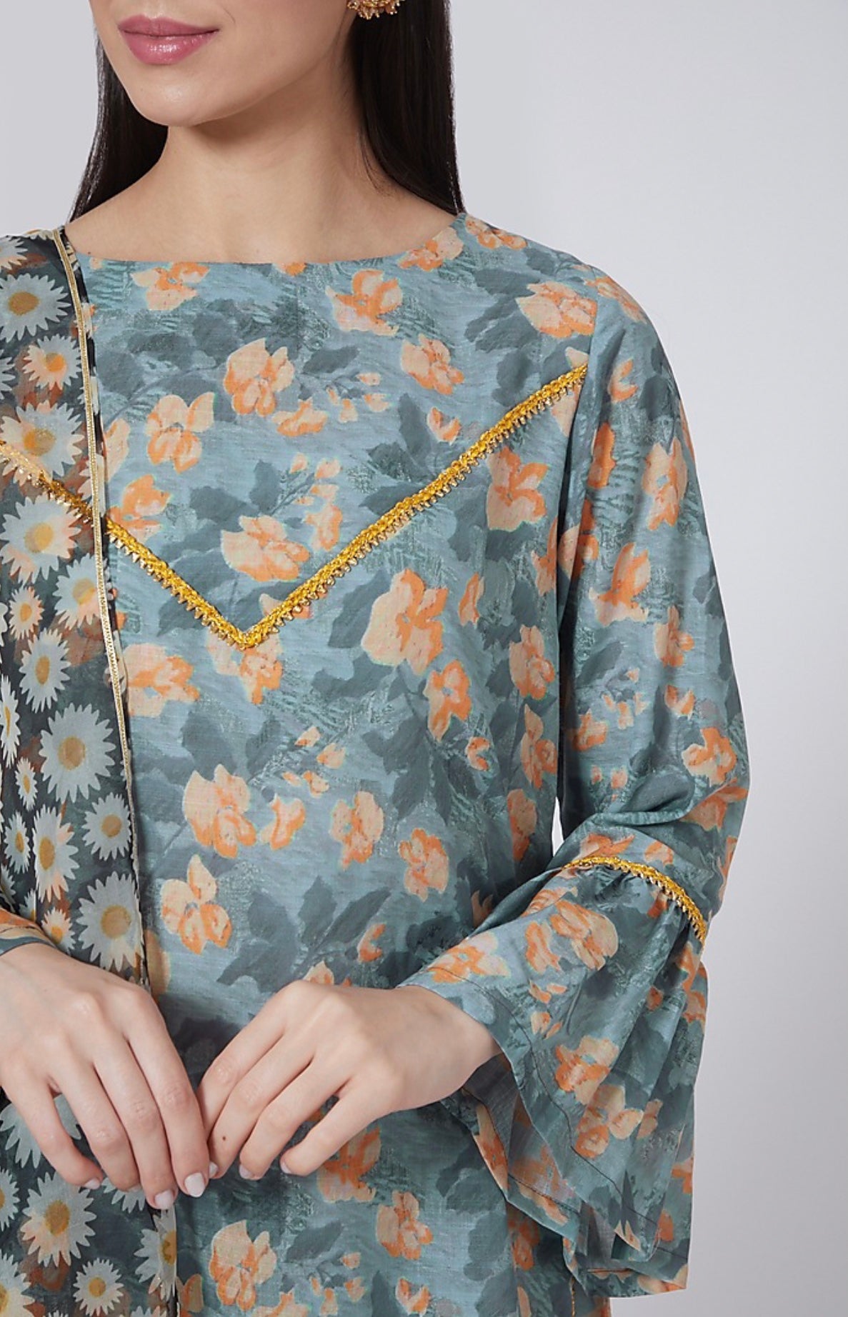 Relaxed fit kurta with slight frilled sleeves and slight a-line hem, with straight pants and a printed organza dupatta.
